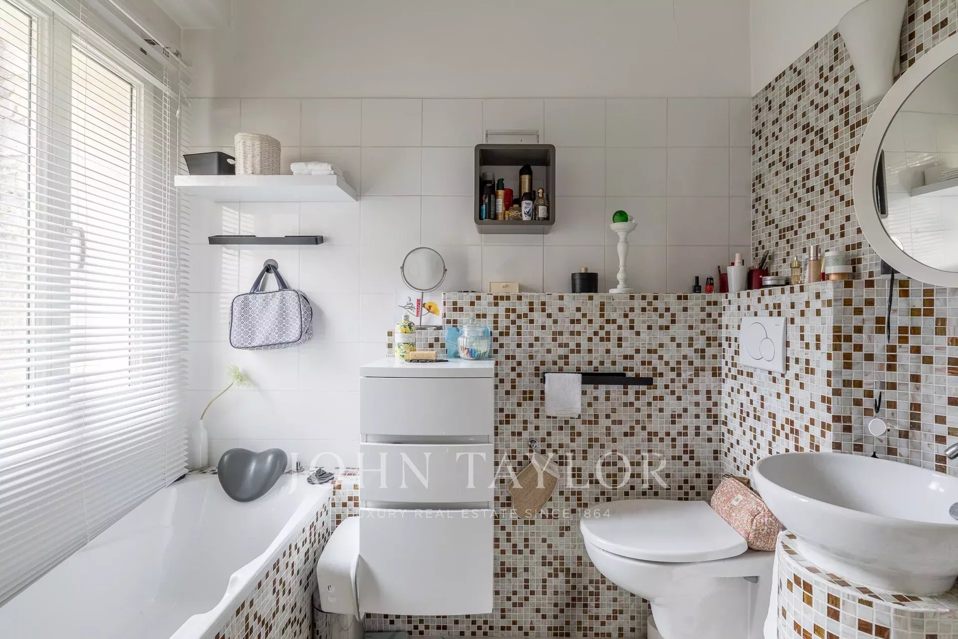 En la planta superior, hay cuatro luminosos dormitorios, un vestidor, dos cuartos de baño con bañera y un estudio muy amplio que podría utilizarse como zona de juegos o sala de televisión, ideal para la vida familiar.