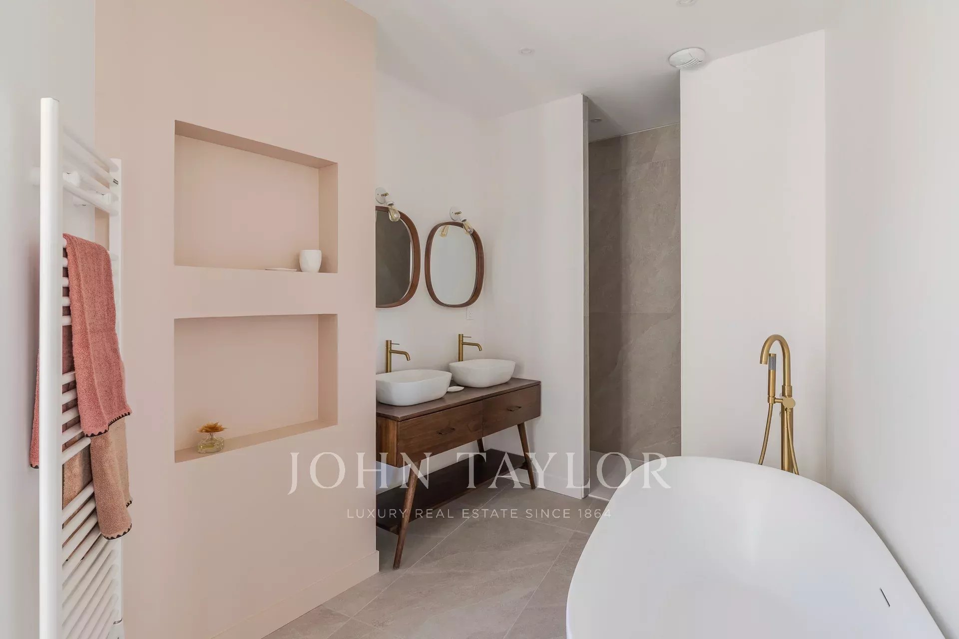 En la primera planta, un estudio, dos amplios dormitorios y dos cuartos de ducha ofrecen un confort óptimo. La suite principal de casi 40 m², con su cuarto de baño a medida y su vestidor, es un auténtico capullo de serenidad. La planta superior alberga un dormitorio adicional, ideal para recibir invitados.