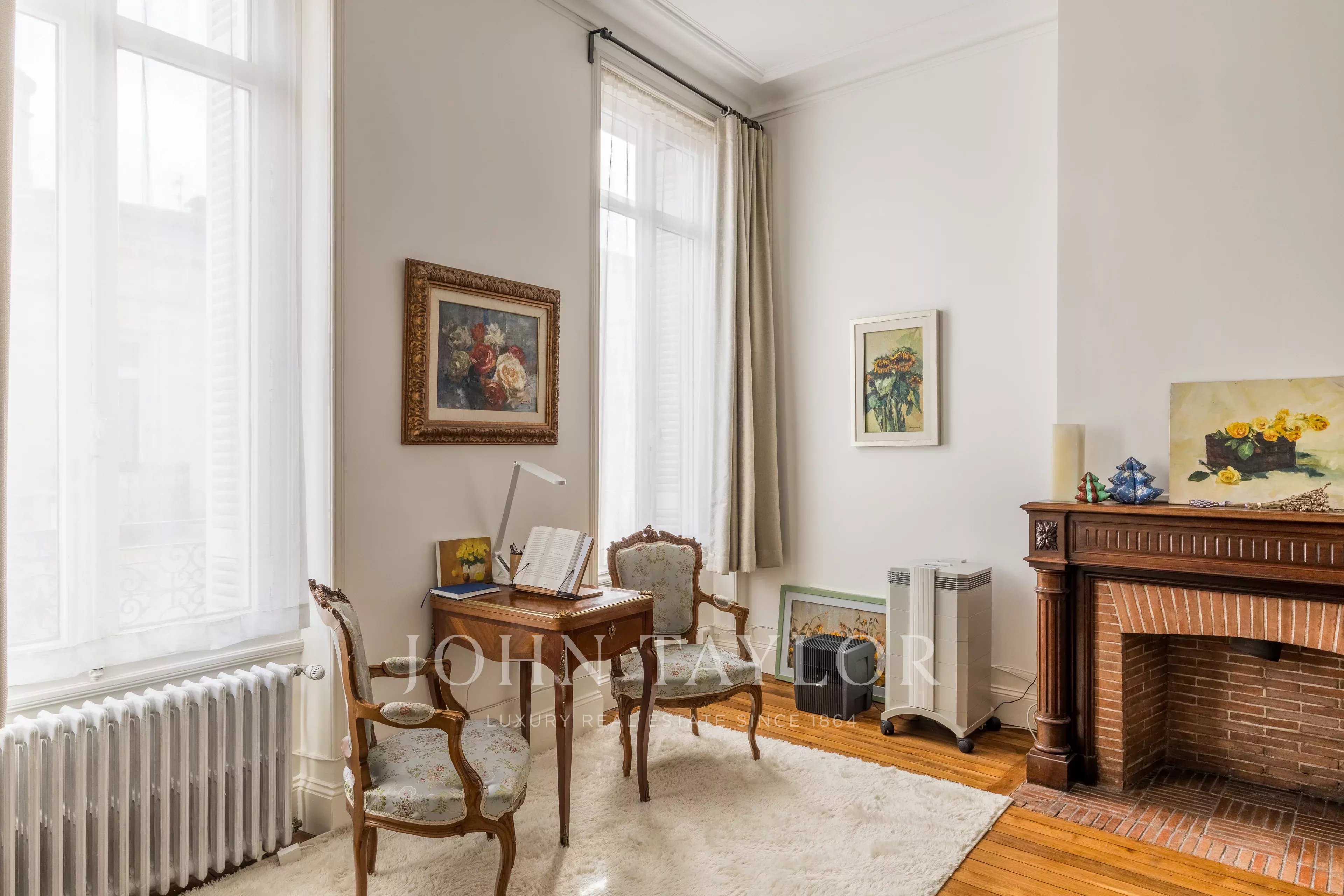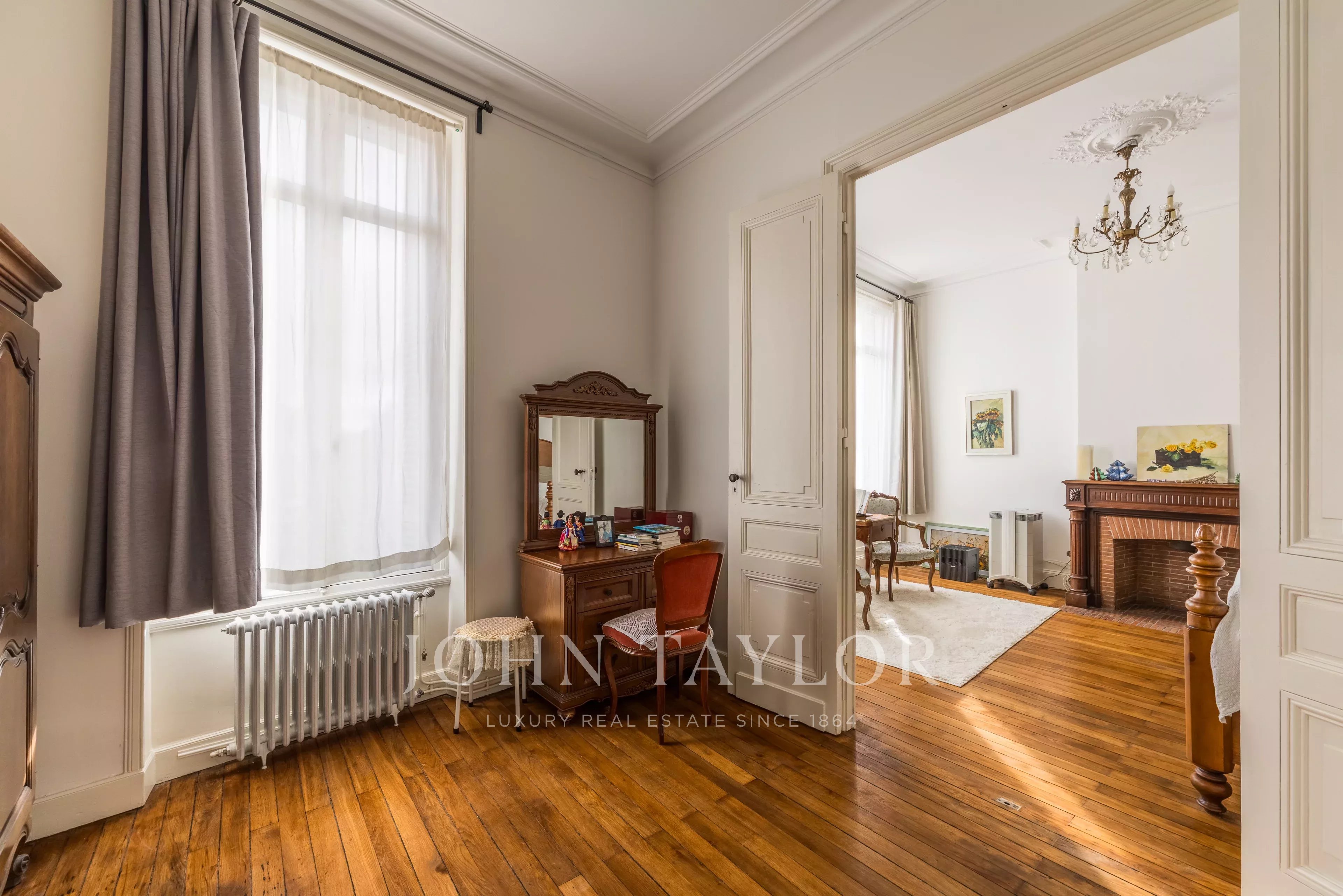 Una amplia y suntuosa escalera de época, iluminada por una hermosa claraboya bajo un techo de cristal, conduce a las dos plantas superiores: una luminosa suite principal con cuarto de baño privado, cuatro dormitorios, otros dos cuartos de baño y un piso independiente con cocina americana, ideal para un estudiante o un adolescente. Un amplio lavadero y una atractiva bodega de 30 m² completan la propiedad.