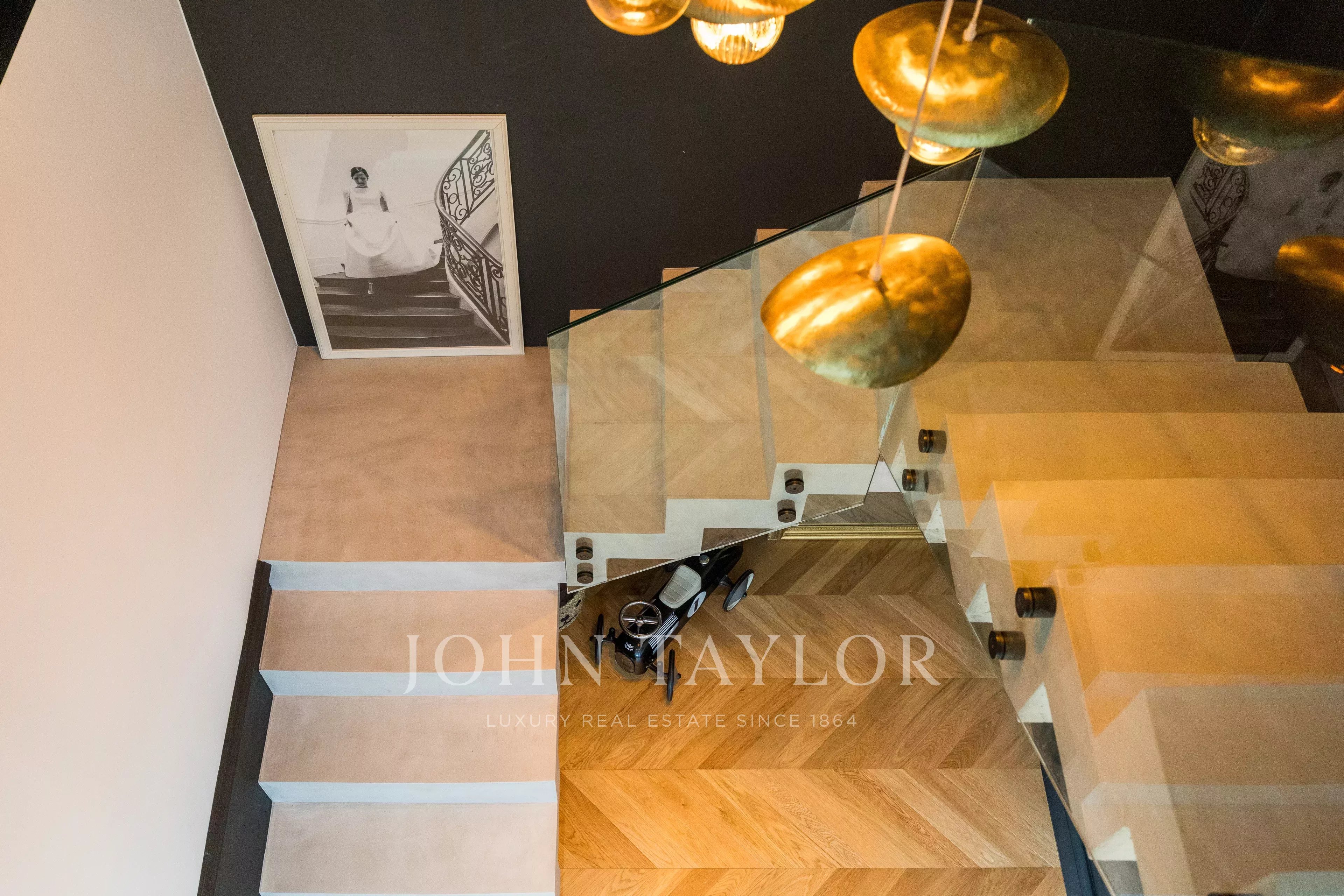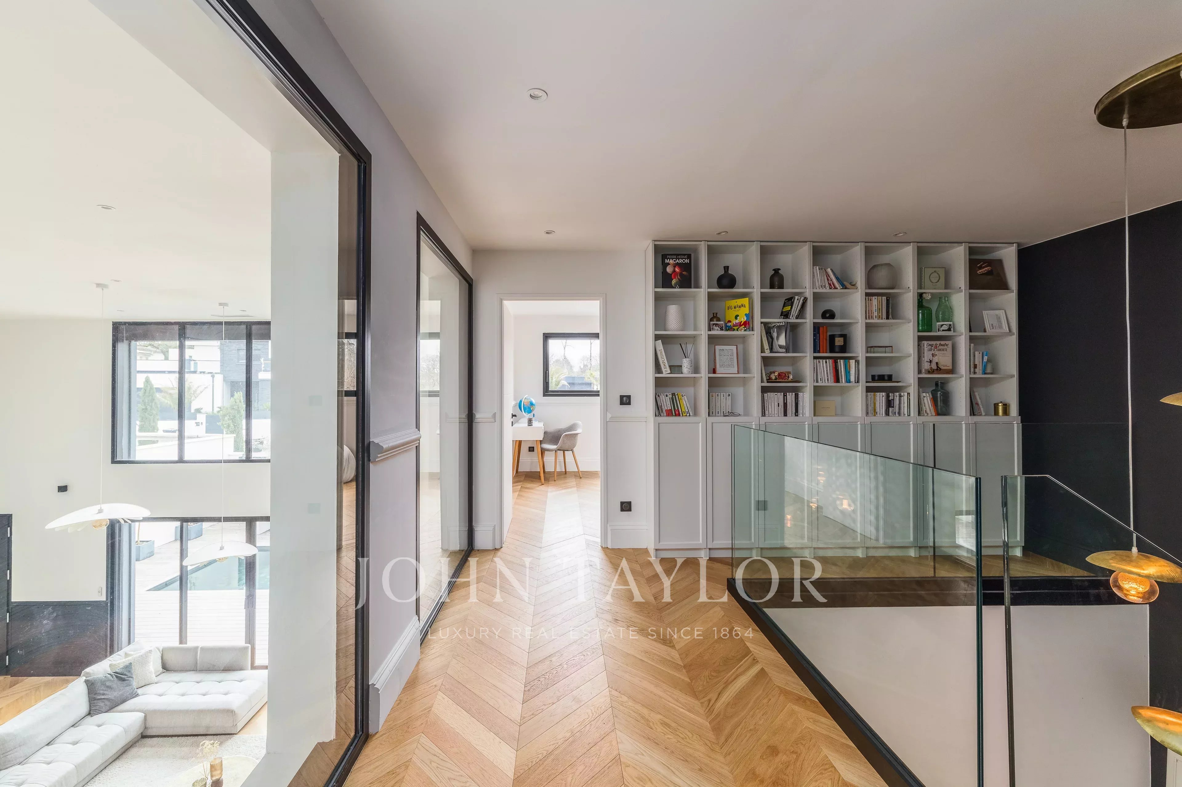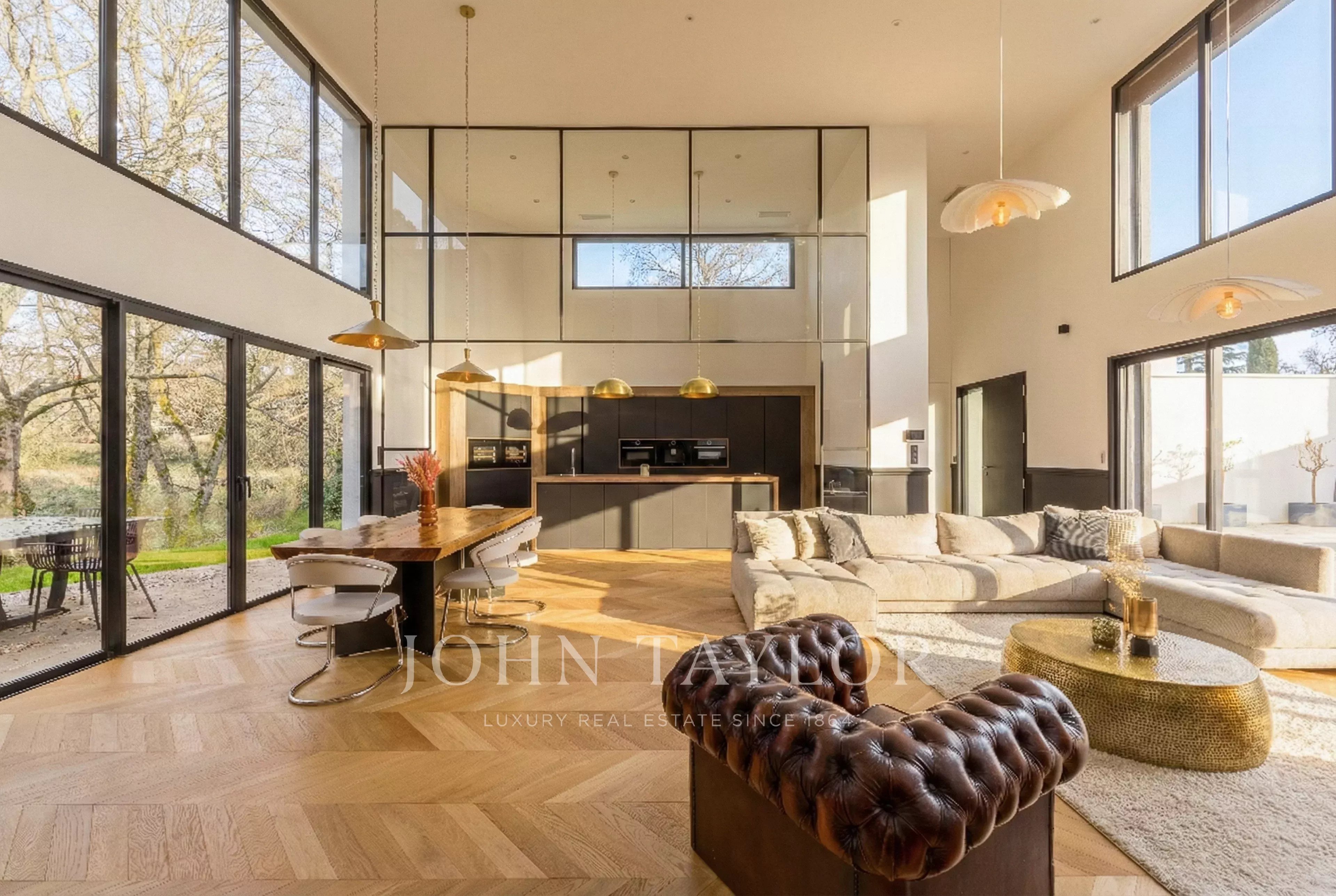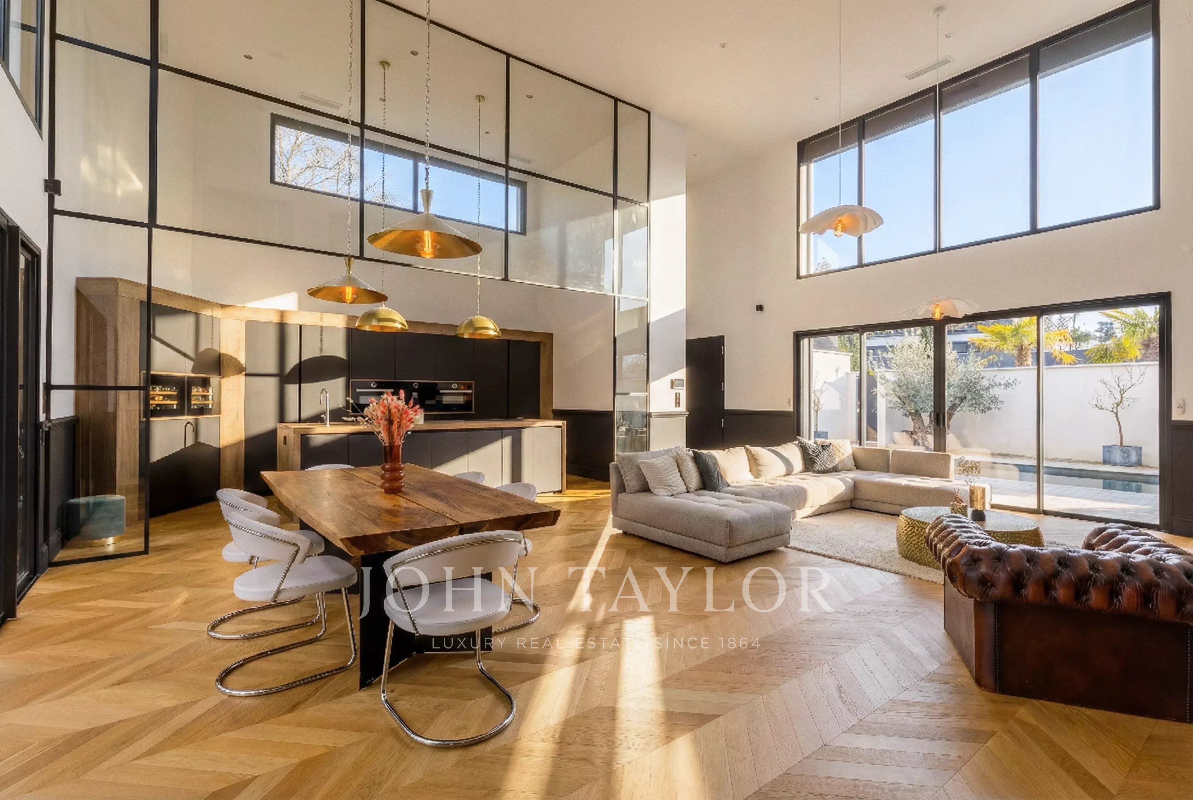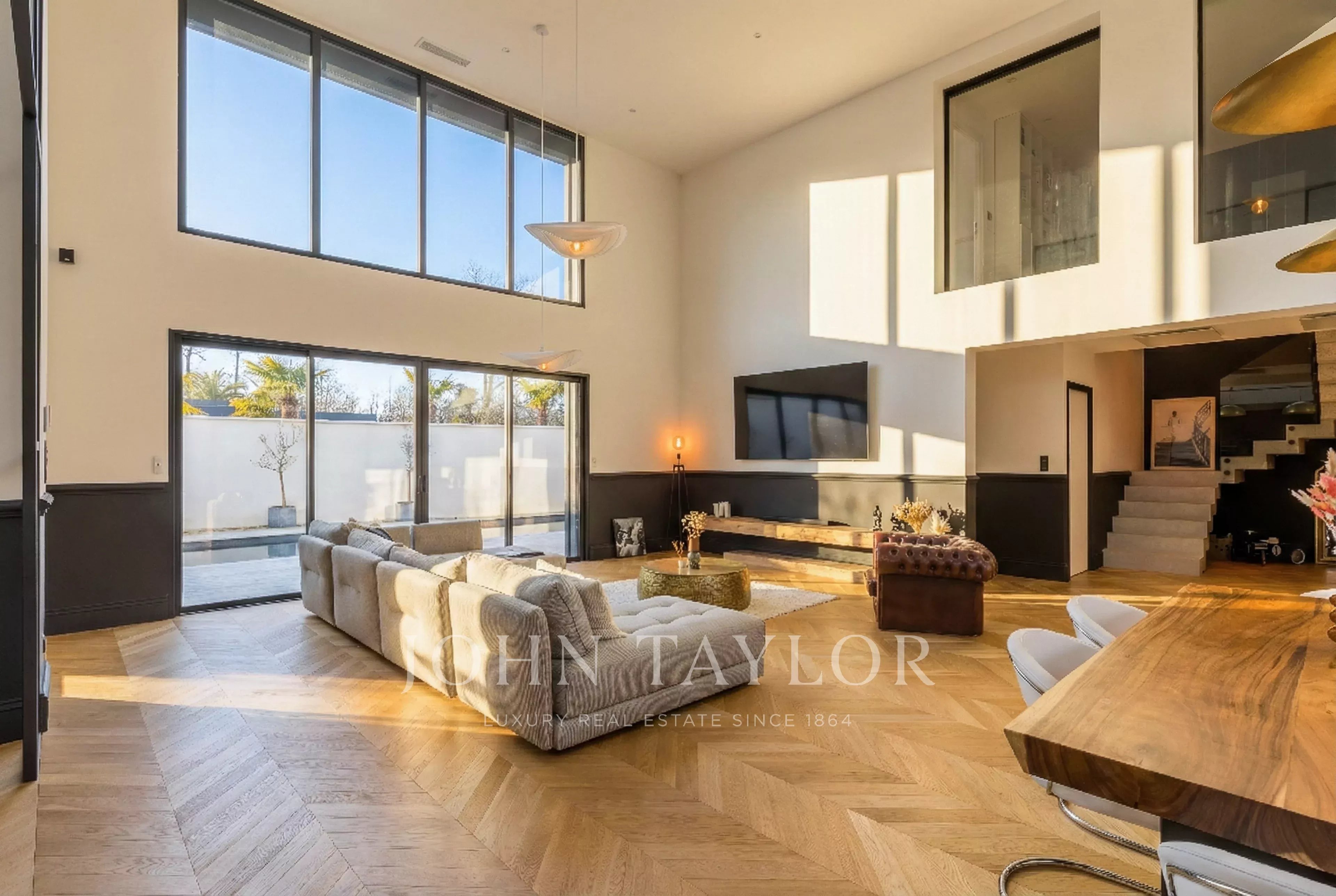 Desde la entrada, los volúmenes impresionan. La sala de estar, bañada por la luz natural, ofrece una magnífica altura de techo de más de 5 m y un ambiente cálido y acogedor.