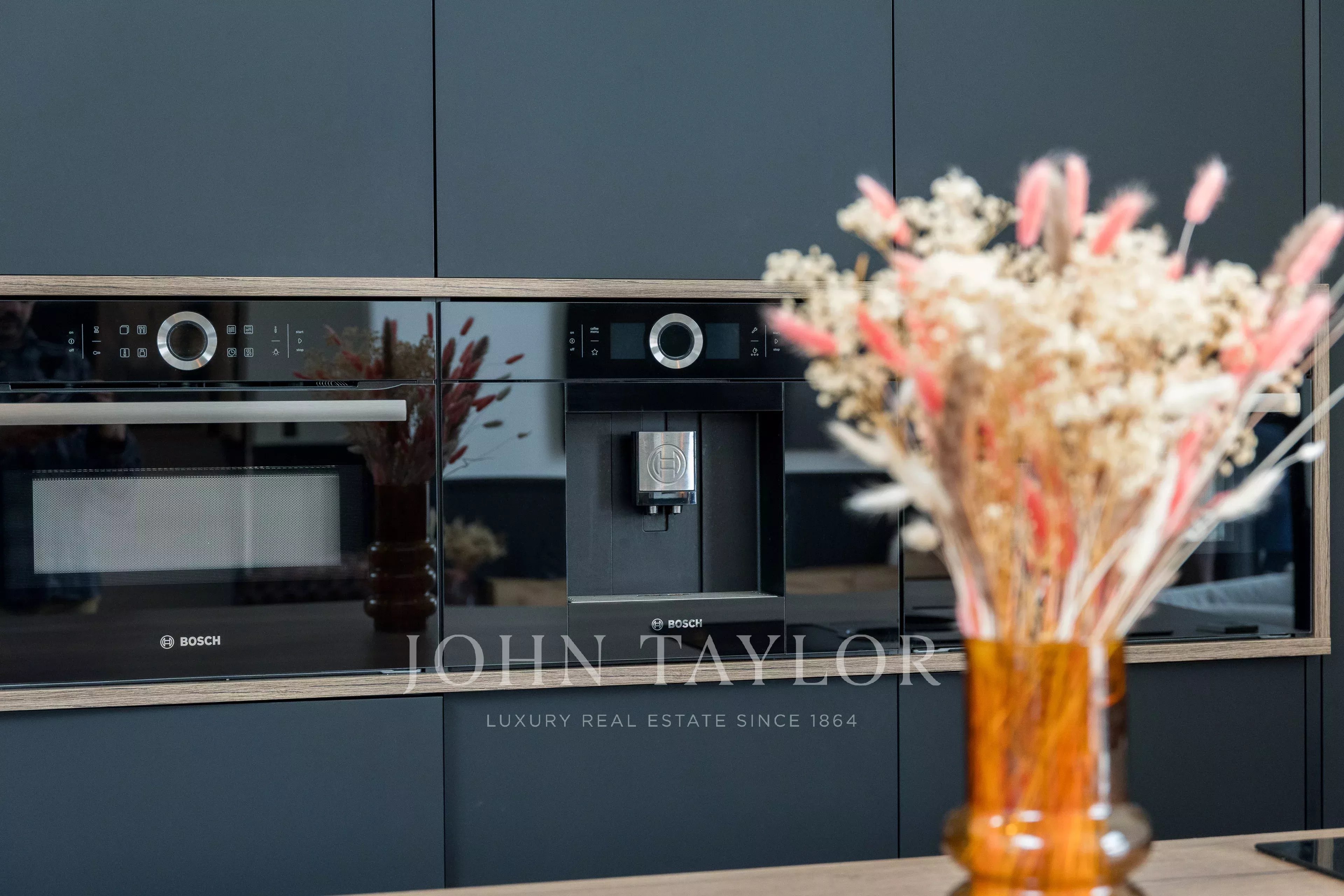 La cocina abierta, de líneas contemporáneas, está equipada con electrodomésticos de alta gama que combinan estética y funcionalidad.