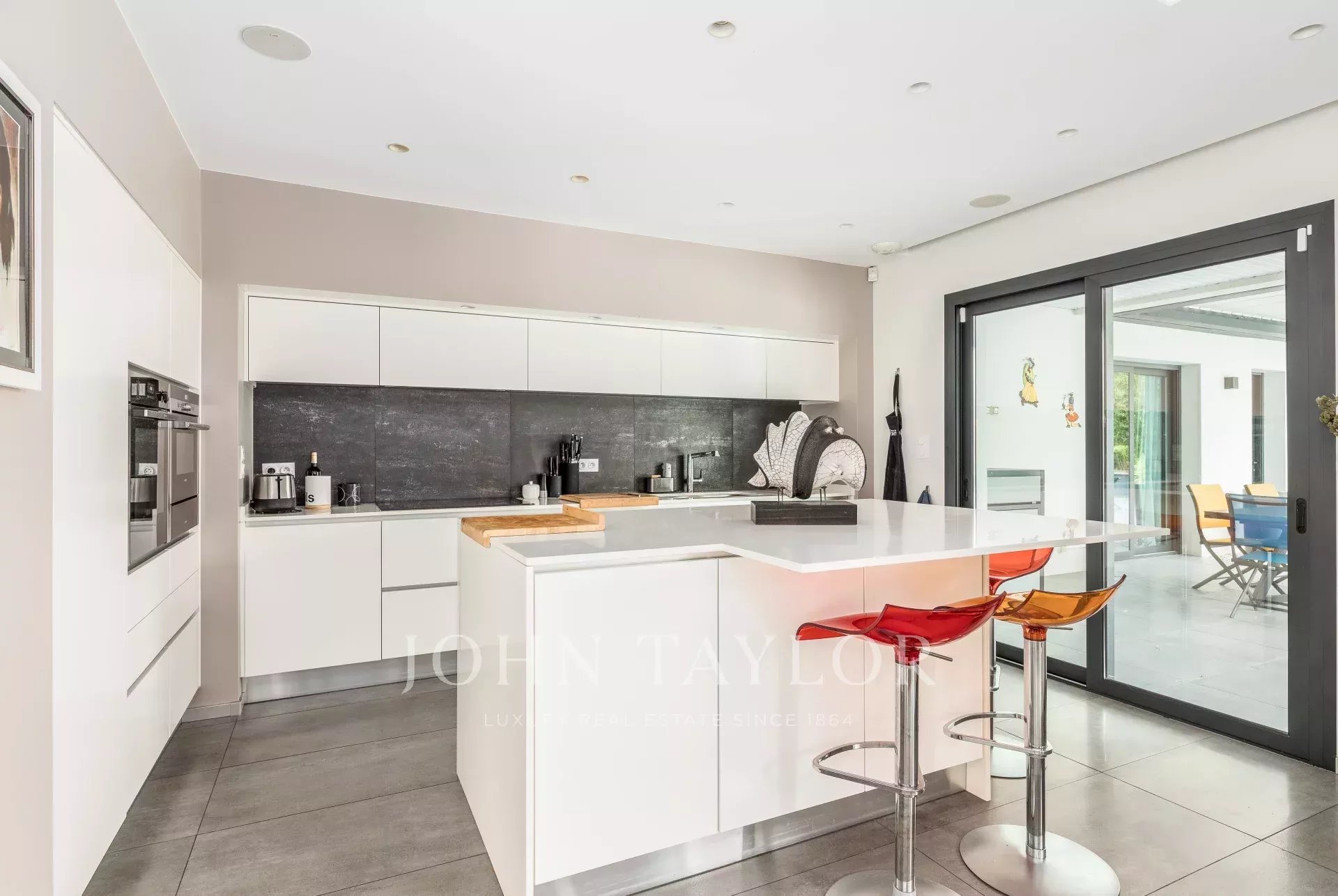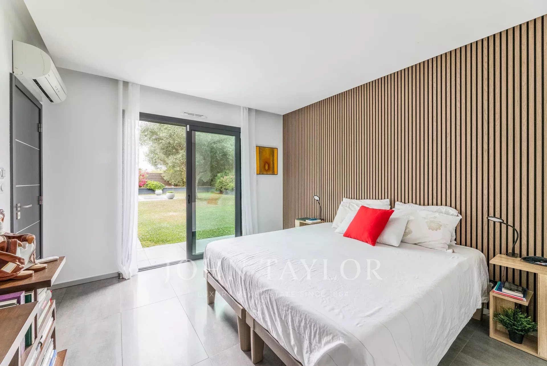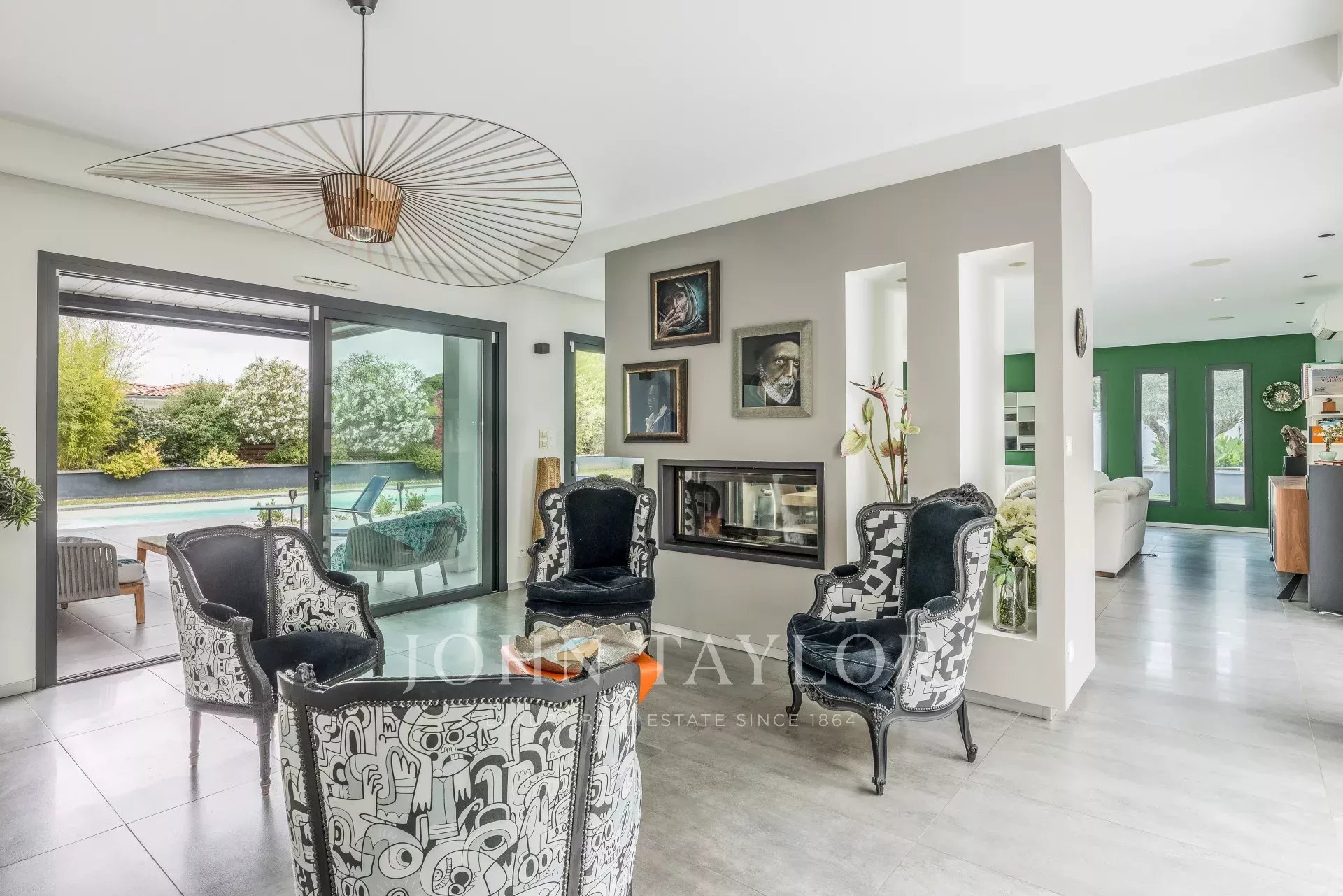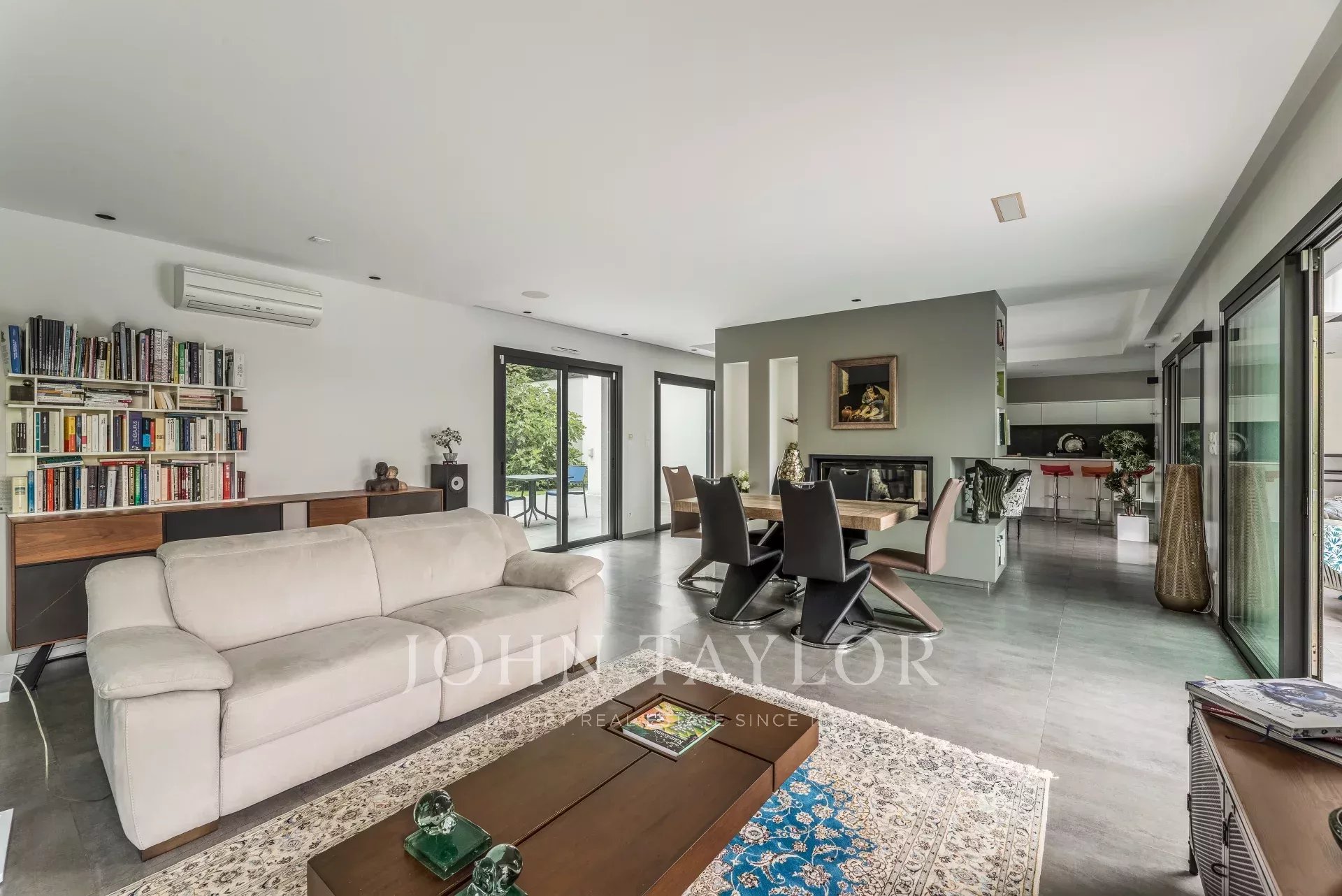 La mayor parte de la villa está construida en una sola planta, y su amplitud, luminosidad y aire decididamente contemporáneo atraen de inmediato. El salón de 90 m², bañado de luz gracias a sus grandes ventanales, se abre a varias terrazas y cuenta con una elegante chimenea de dos fuegos. Una cocina americana totalmente equipada completa el espacio.