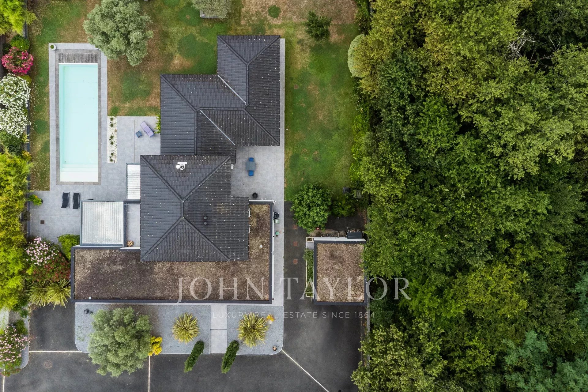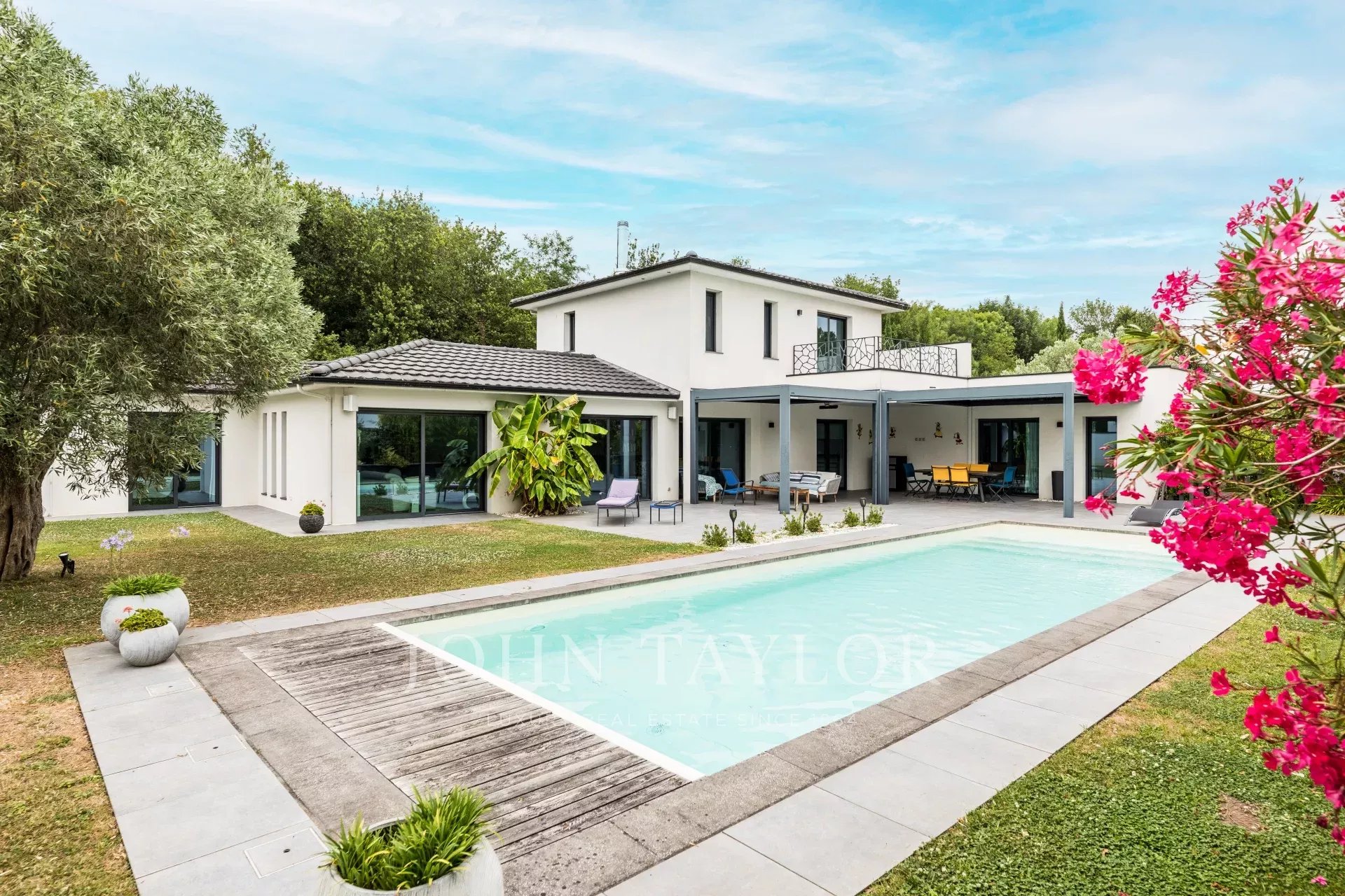 Escondido al final de un camino privado, se encuentra en un magnífico terreno ajardinado de más de 2.000 m², orientado al sur y realzado por una piscina climatizada de agua salada de 13 x 4 metros con cortina eléctrica sumergida.