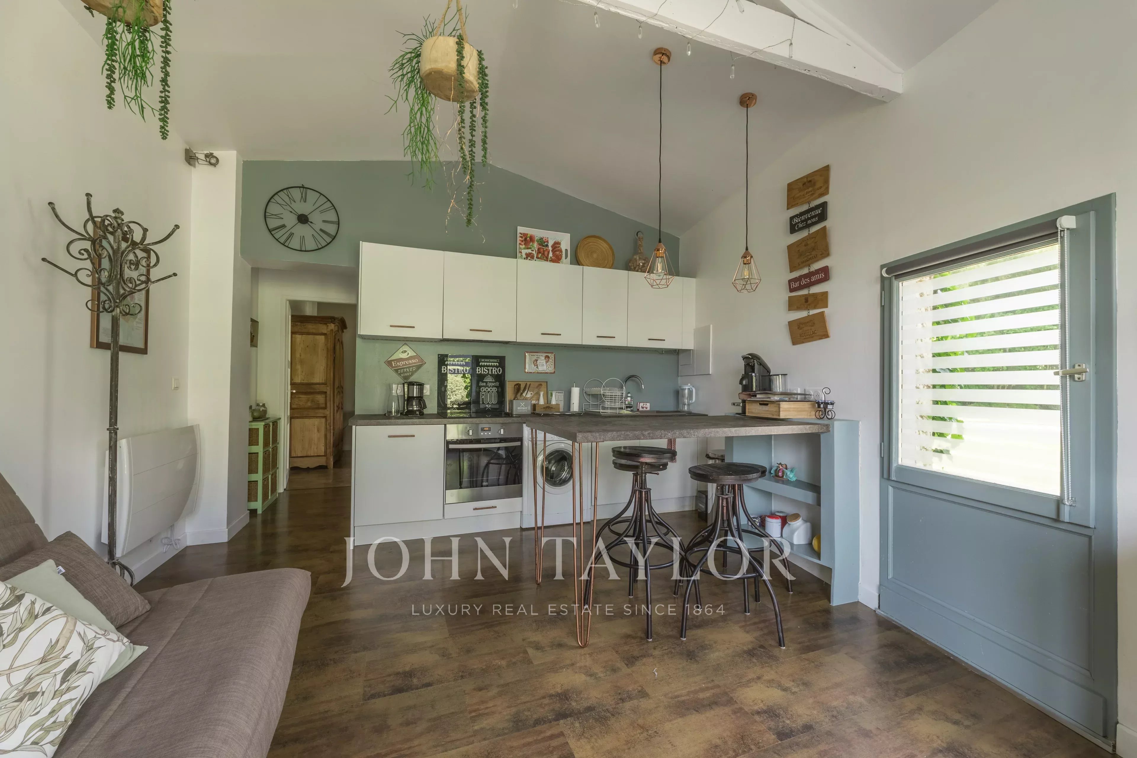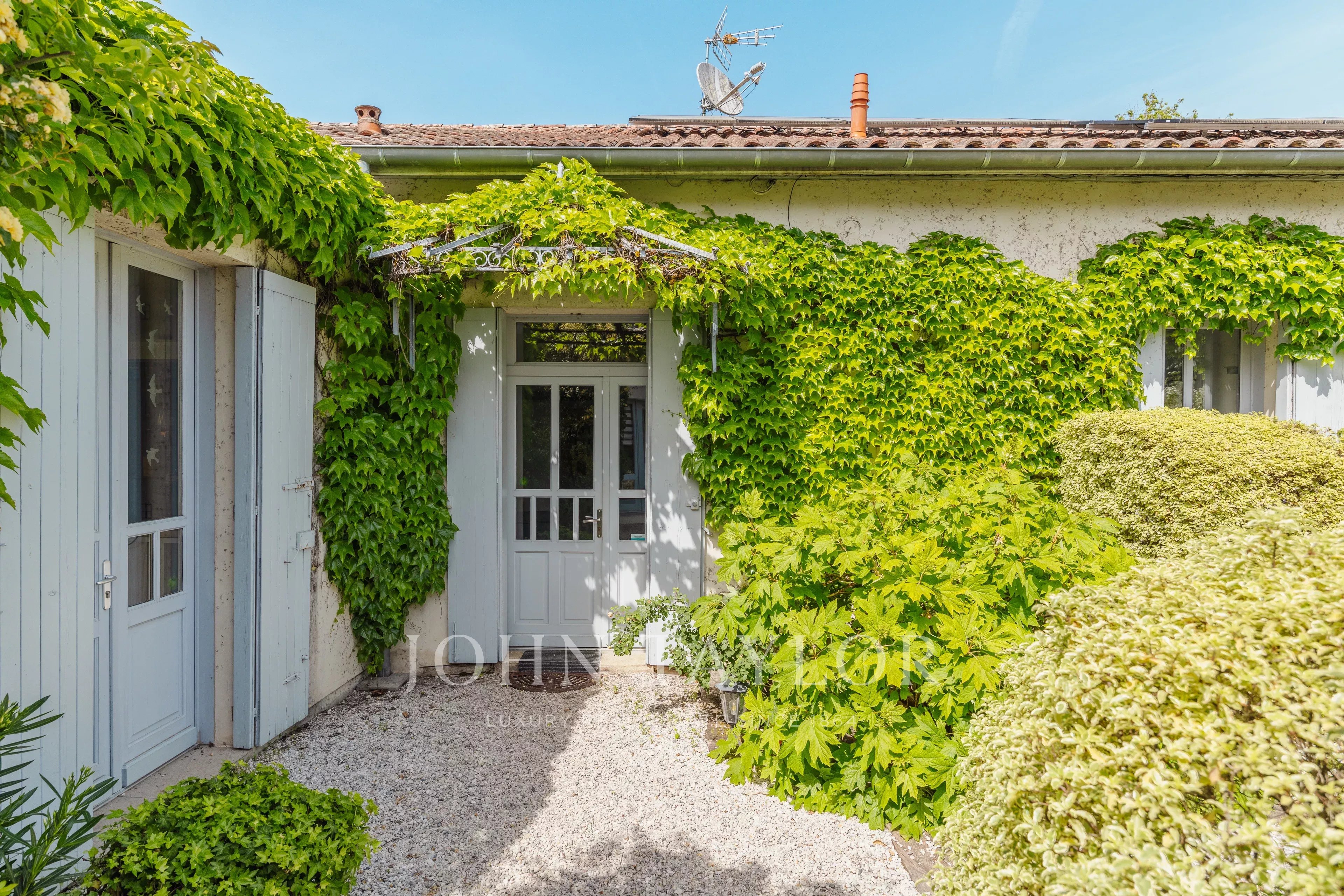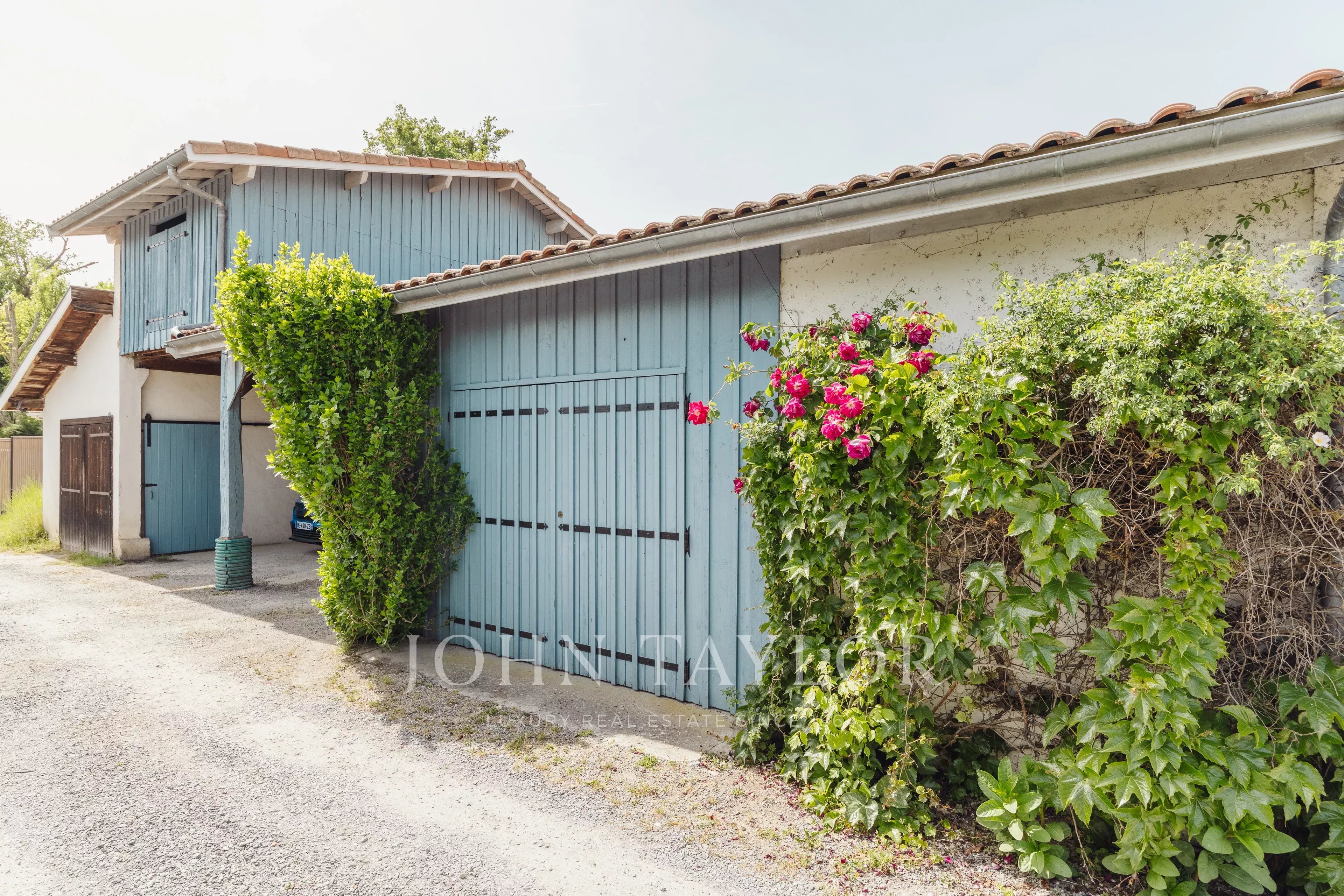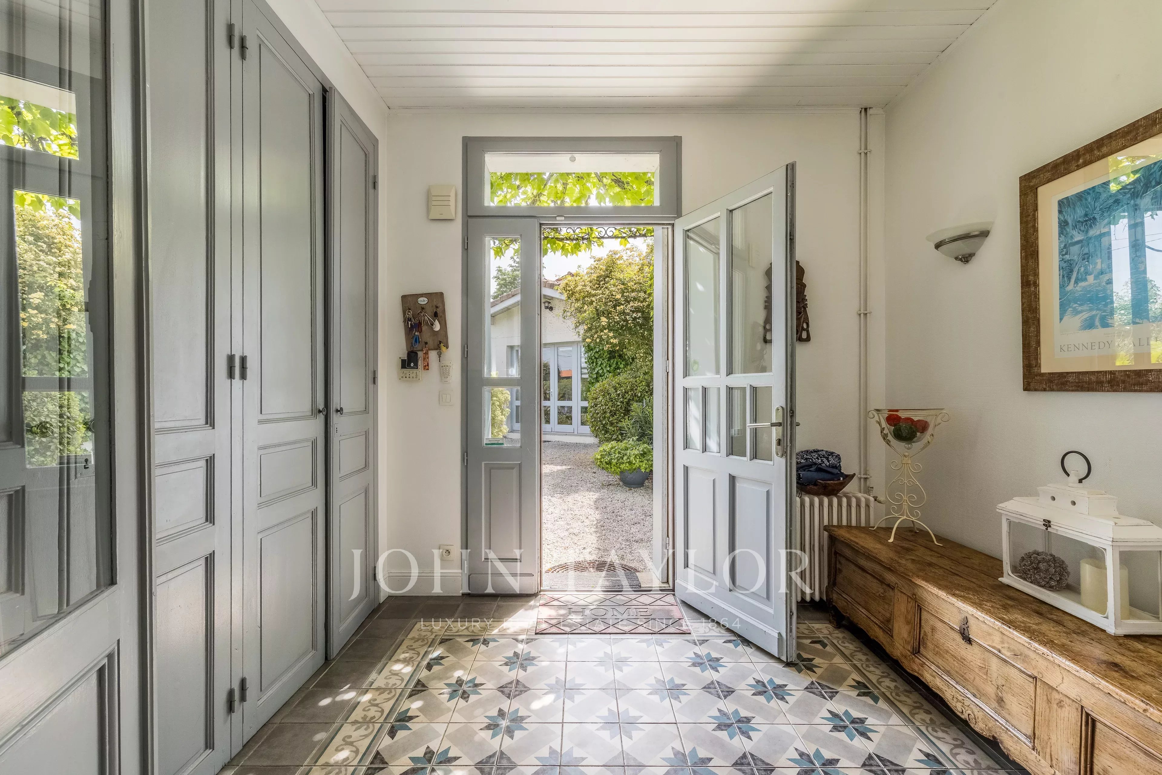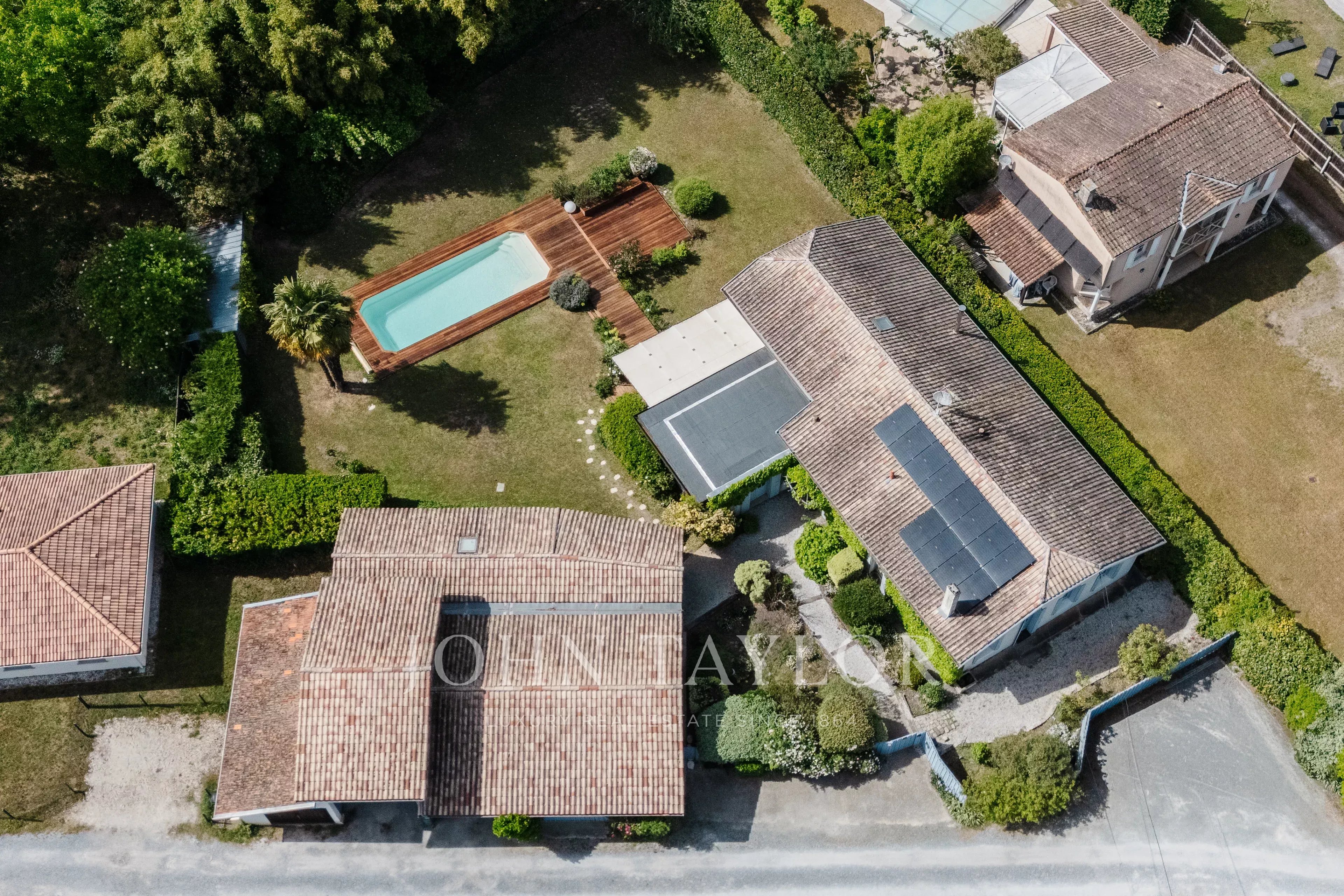 Casa antigua de viticultor de estilo arcachonnais desarrolla, entre la casa principal y sus dependencias, aproximadamente 230 m² habitables en el corazón de un hermoso terreno arbolado de 1900 m² con piscina. Renovada con cuidado, combina el encanto de lo antiguo con un confort moderno.Una vez pasado el ingreso, se impresiona con la sala principal de 49 m², inundada de luz, con una altura de techo de 5,4 metros. Se abre a un gran espacio de cocina de 24m2, extendido por una terraza de madera exótica, perfecta para las comidas de verano. La casa dispone de cuatro habitaciones, una sala de juegos (con aire acondicionado), dos baños, dos aseos y un lavadero.En cuanto al confort, la casa cuenta con calefacción de gas con radiadores de fundición, bombas de calor reversibles en las habitaciones principales y la sala de juegos, así como paneles solares (6 kW) para autoconsumo.En el exterior, una piscina de sal climatizada de 9x4 metros, con cubierta automática, se integra perfectamente en un entorno tranquilo y verde. Un apartamento independiente de 35 m² con cocina, baño y habitación completa el conjunto, así como una oficina con una habitación contigua, ideal para una actividad profesional.Un garaje, una cochera y un espacio de 25 m² para acondicionar en la planta superior ofrecen muchas posibilidades. Finalmente, una bodega de vino y un espacio de almacenamiento completan esta propiedad.Un lugar de vida lleno de encanto, con volúmenes generosos, que seducirá a los amantes de lo auténtico en busca de una propiedad familiar o un proyecto de recepción.