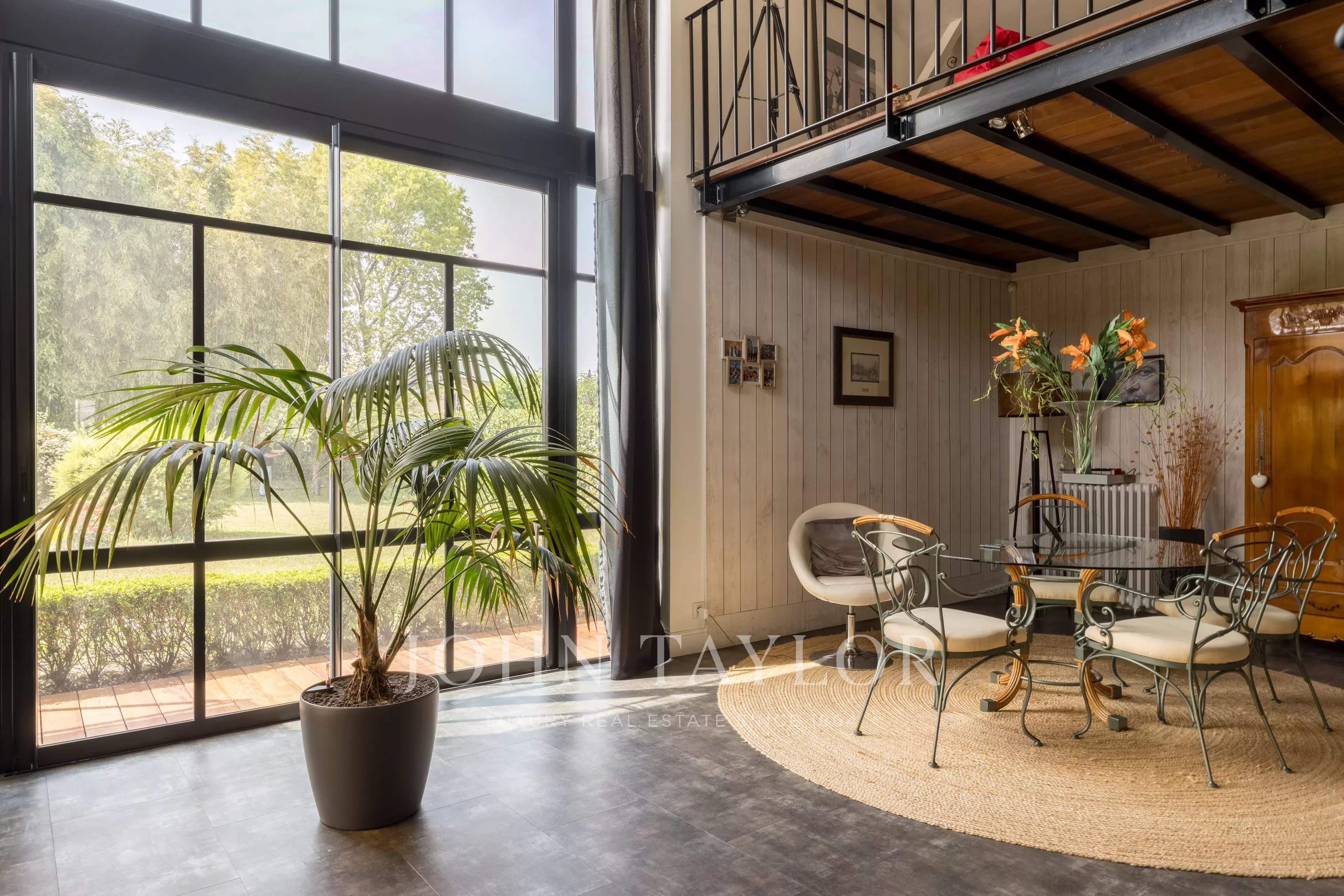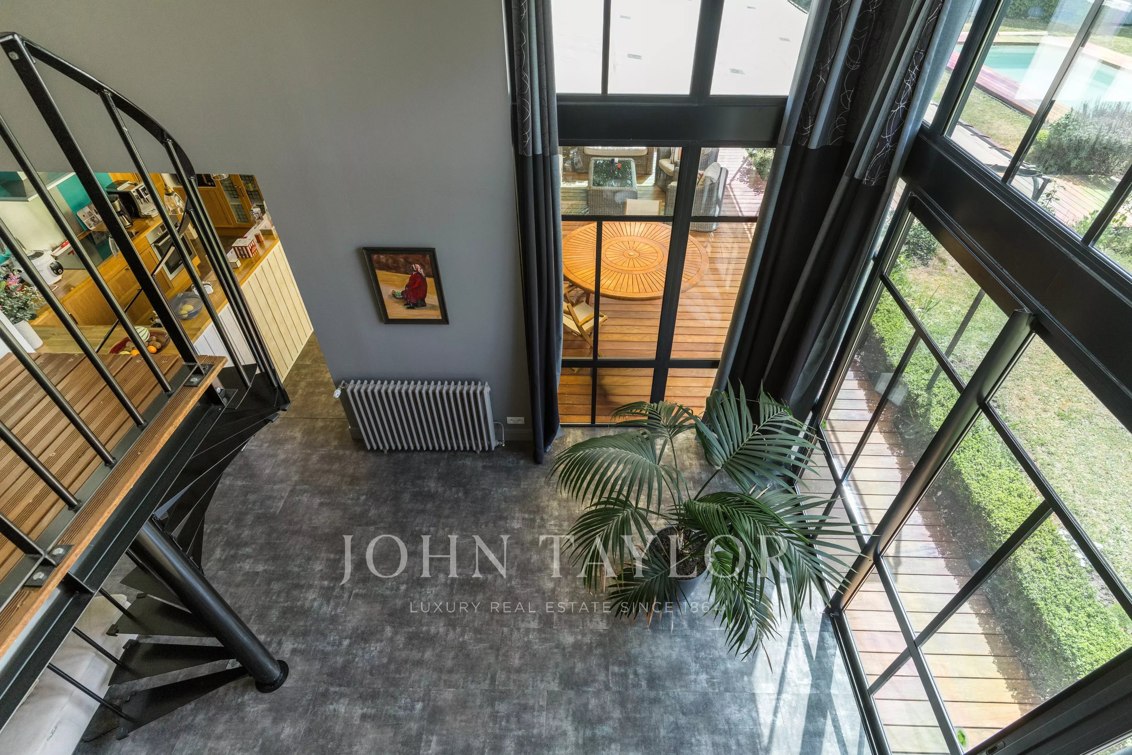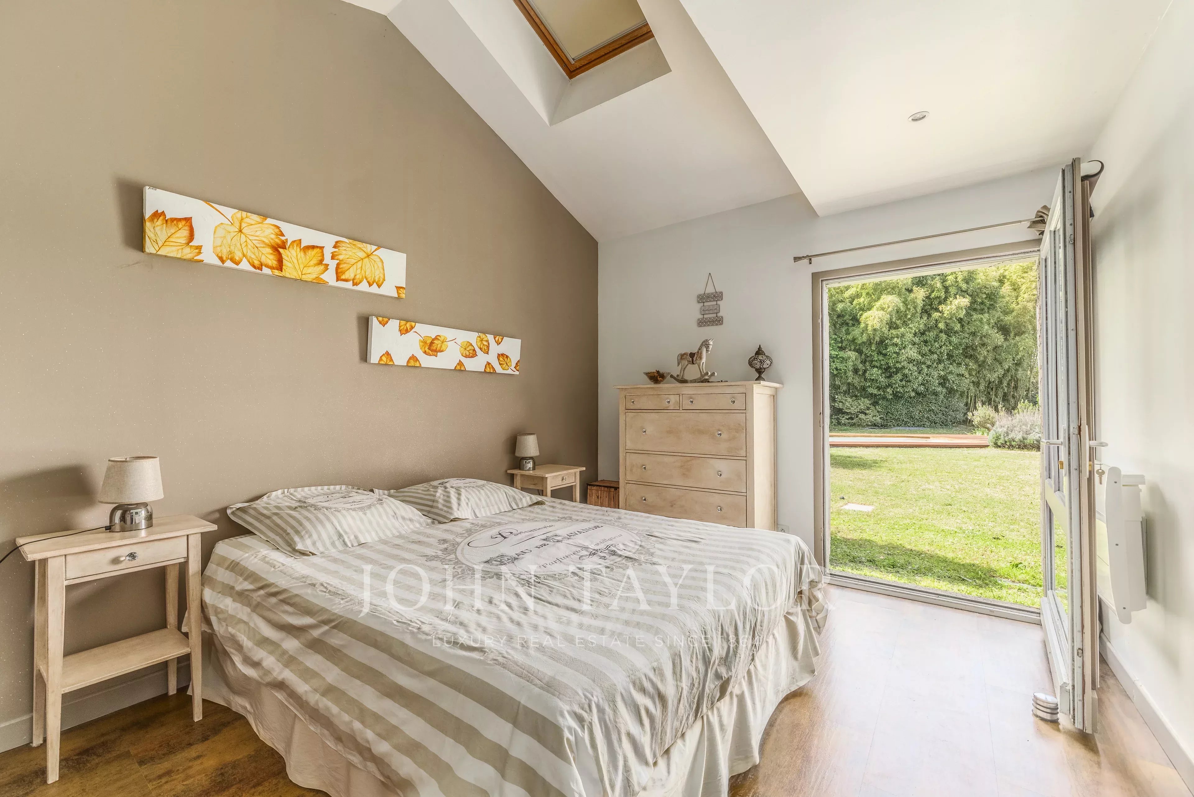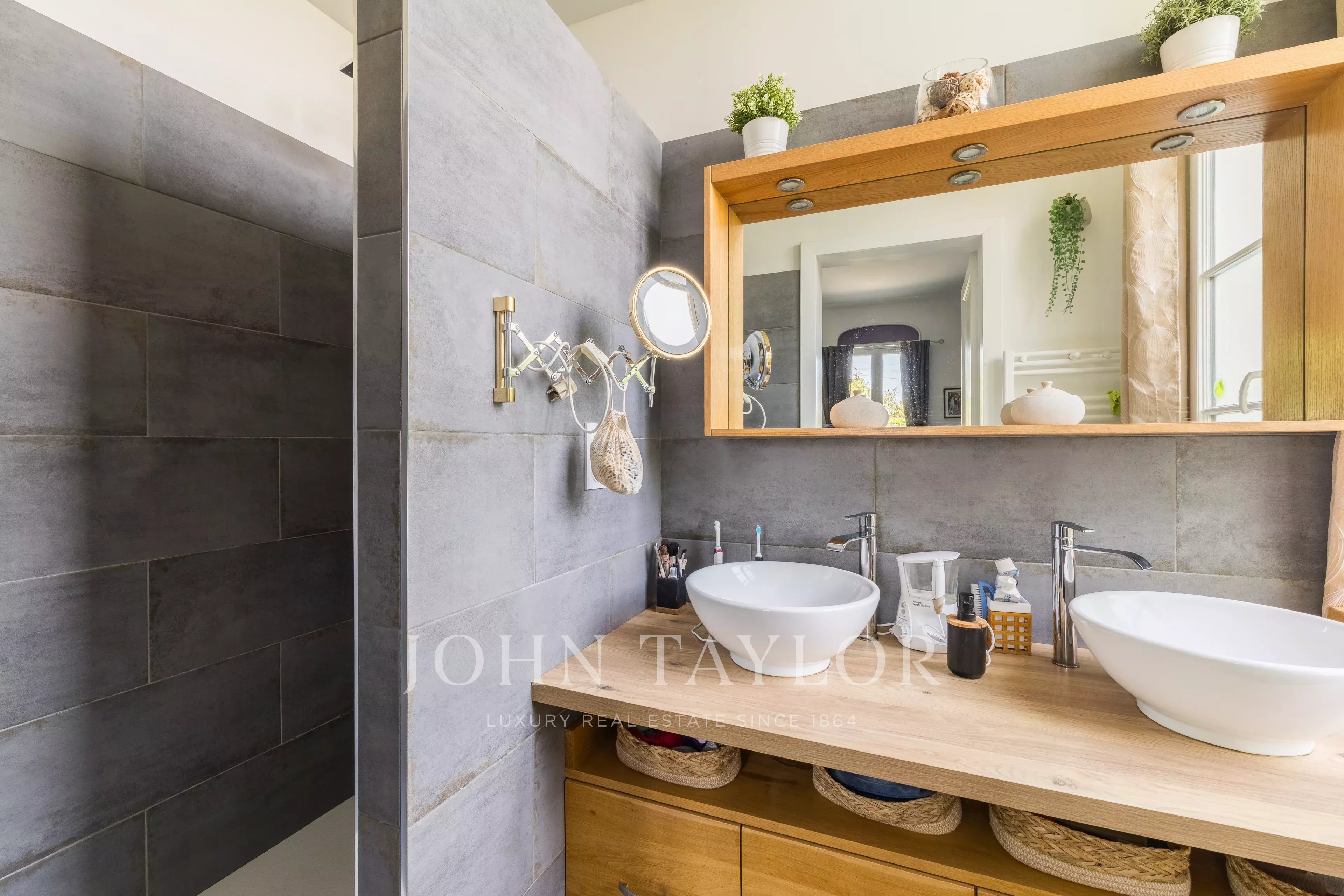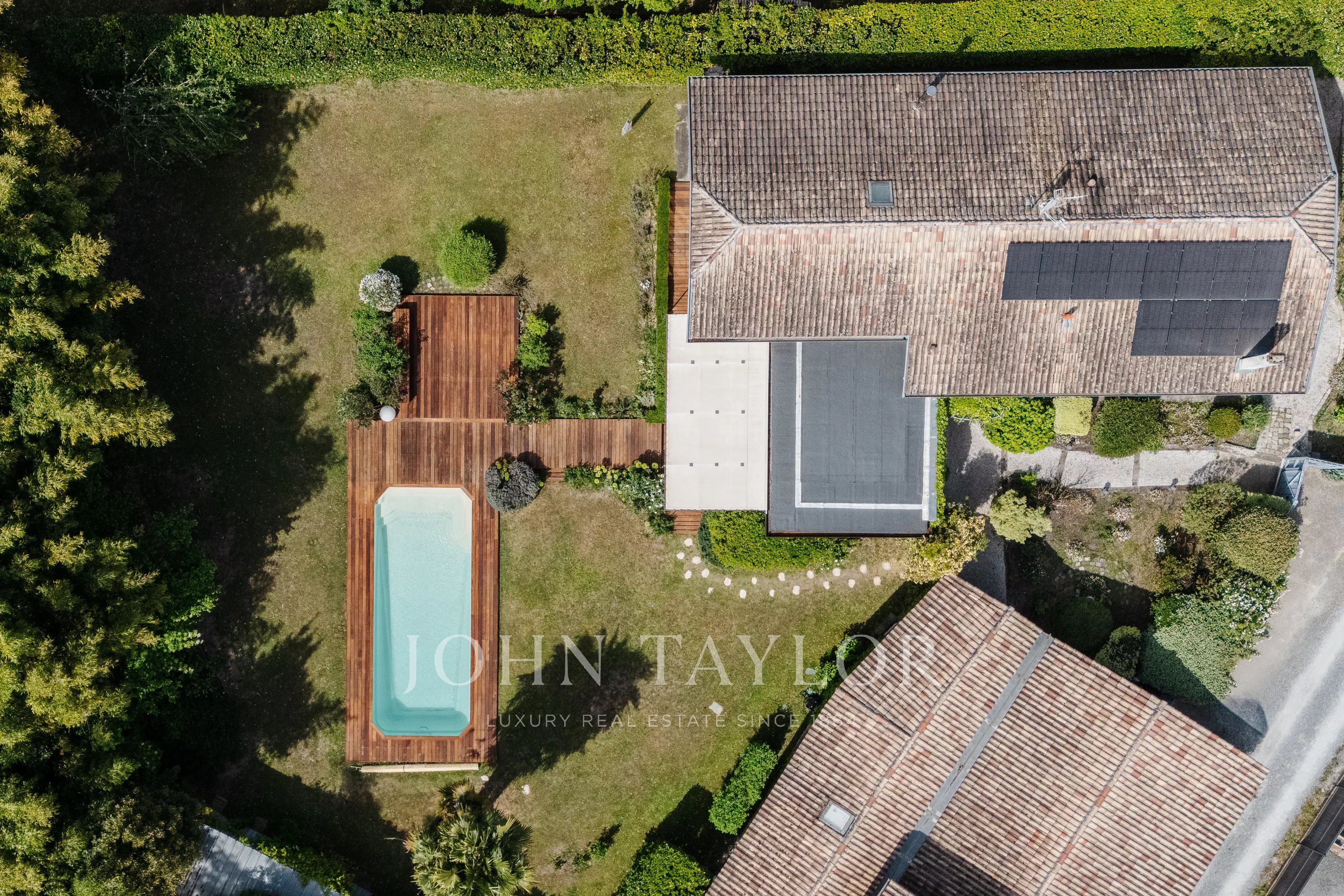 Casa antigua de viticultor de estilo arcachonnais desarrolla, entre la casa principal y sus dependencias, aproximadamente 230 m² habitables en el corazón de un hermoso terreno arbolado de 1900 m² con piscina. Renovada con cuidado, combina el encanto de lo antiguo con un confort moderno.Una vez pasado el ingreso, se impresiona con la sala principal de 49 m², inundada de luz, con una altura de techo de 5,4 metros. Se abre a un gran espacio de cocina de 24m2, extendido por una terraza de madera exótica, perfecta para las comidas de verano. La casa dispone de cuatro habitaciones, una sala de juegos (con aire acondicionado), dos baños, dos aseos y un lavadero.En cuanto al confort, la casa cuenta con calefacción de gas con radiadores de fundición, bombas de calor reversibles en las habitaciones principales y la sala de juegos, así como paneles solares (6 kW) para autoconsumo.En el exterior, una piscina de sal climatizada de 9x4 metros, con cubierta automática, se integra perfectamente en un entorno tranquilo y verde. Un apartamento independiente de 35 m² con cocina, baño y habitación completa el conjunto, así como una oficina con una habitación contigua, ideal para una actividad profesional.Un garaje, una cochera y un espacio de 25 m² para acondicionar en la planta superior ofrecen muchas posibilidades. Finalmente, una bodega de vino y un espacio de almacenamiento completan esta propiedad.Un lugar de vida lleno de encanto, con volúmenes generosos, que seducirá a los amantes de lo auténtico en busca de una propiedad familiar o un proyecto de recepción.