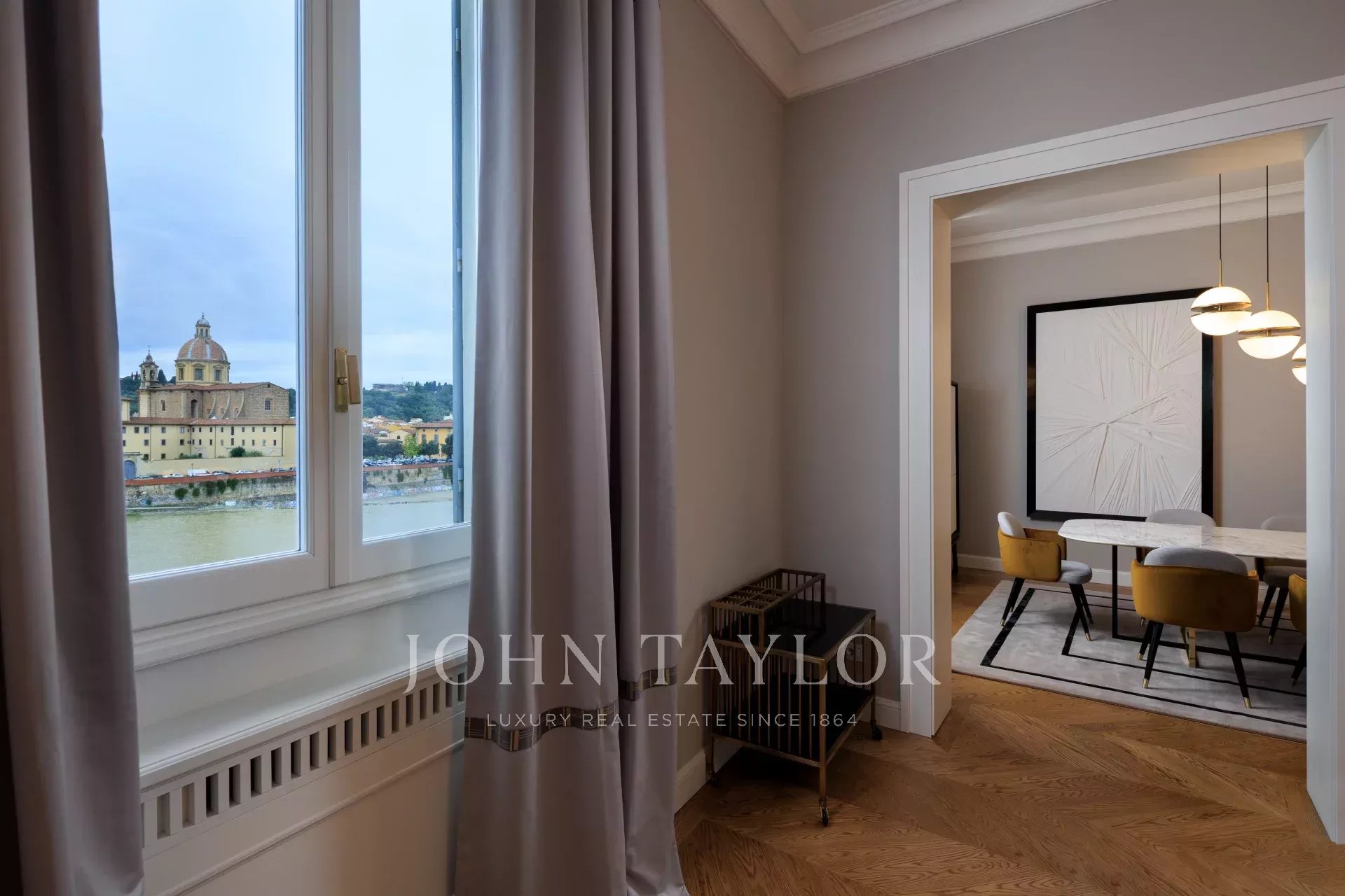 Este elegante piso, situado a orillas del Arno en Florencia, ofrece excepcionales vistas panorámicas del río y de los monumentos históricos.