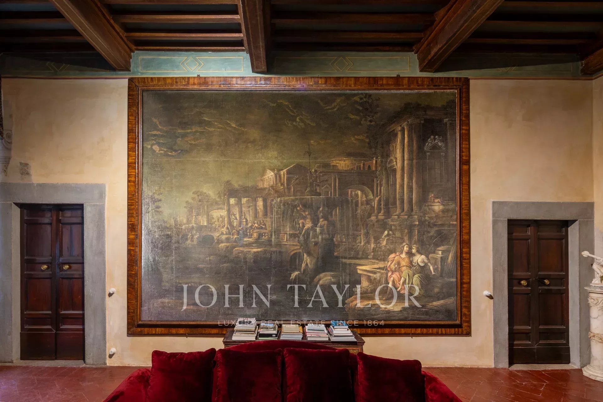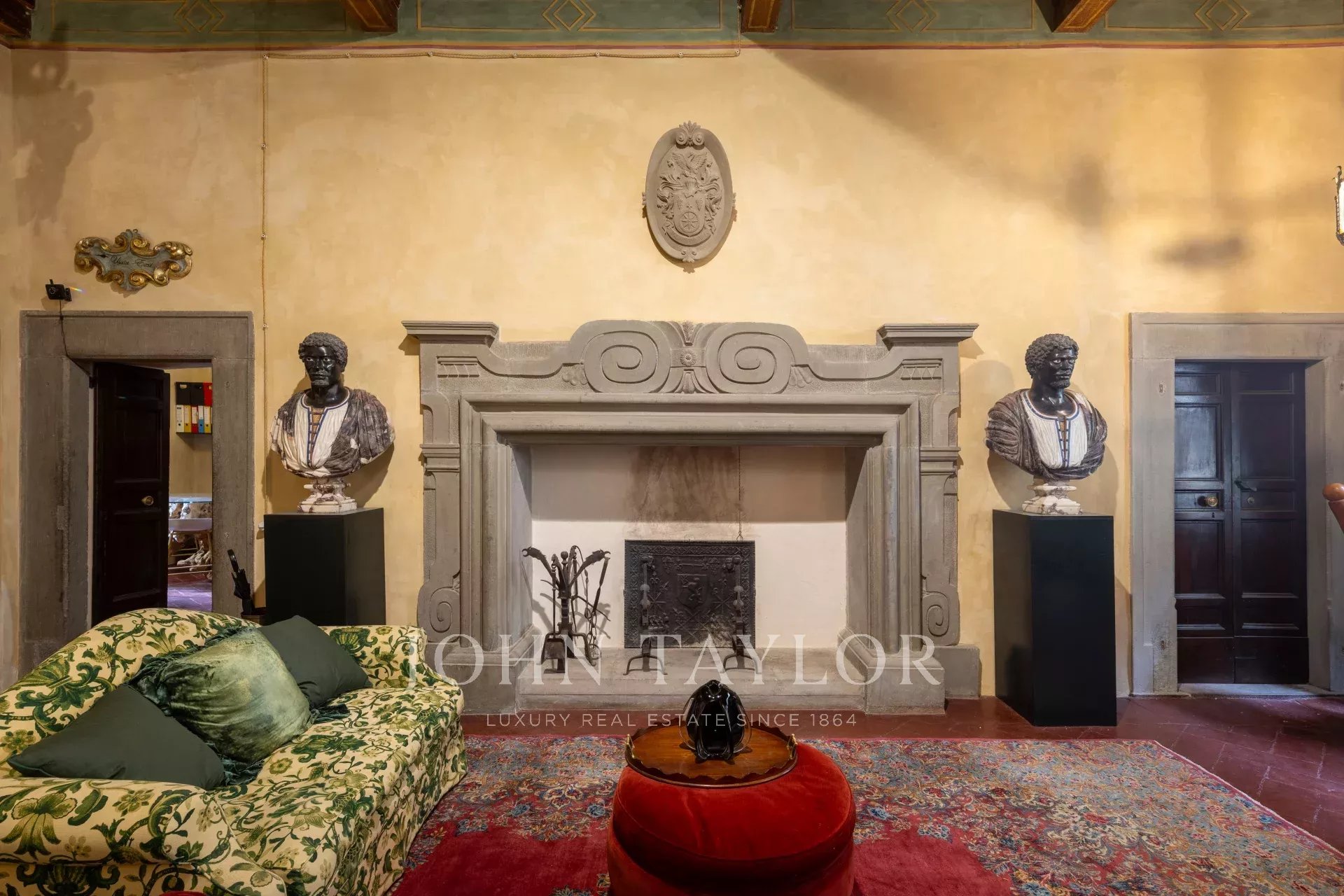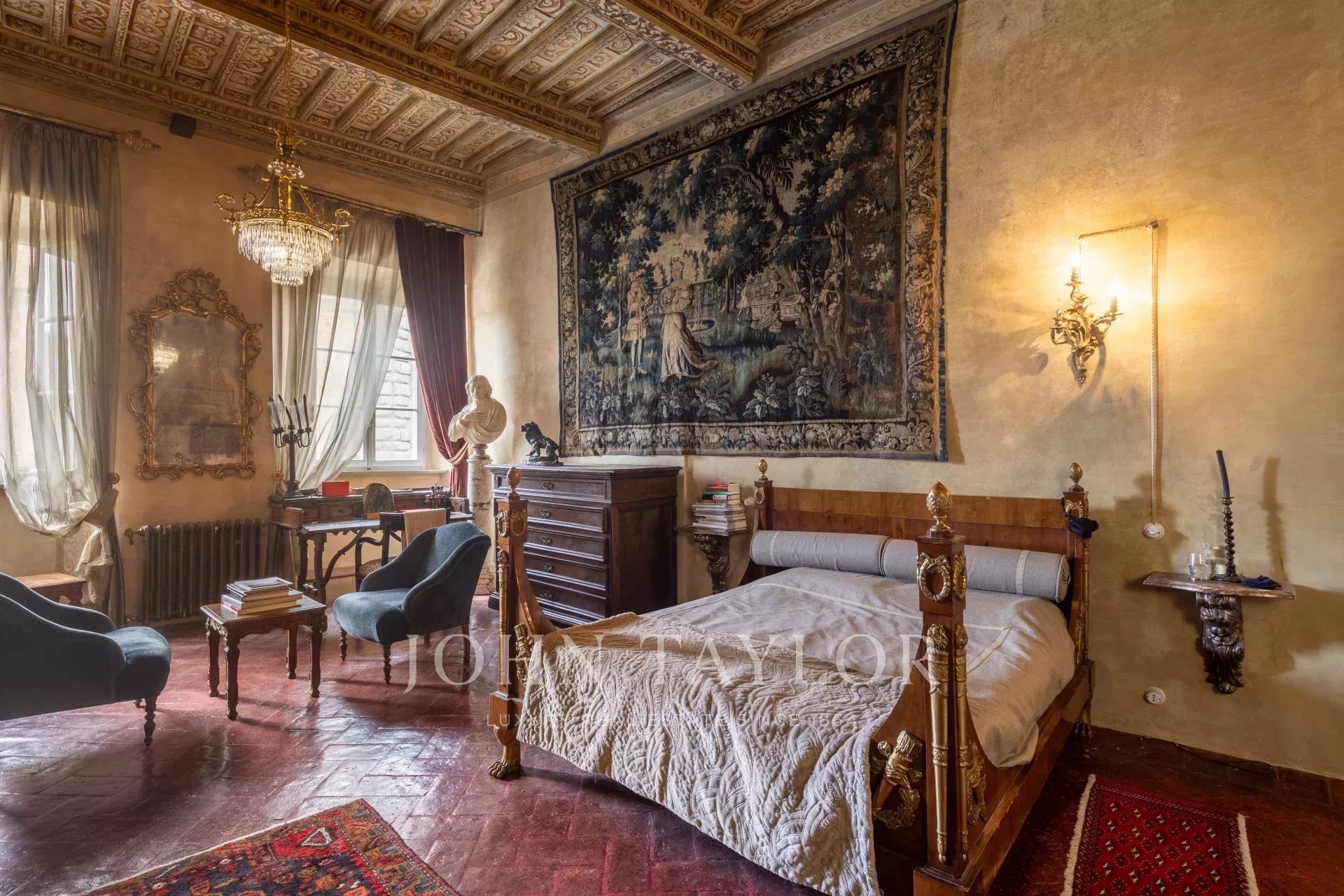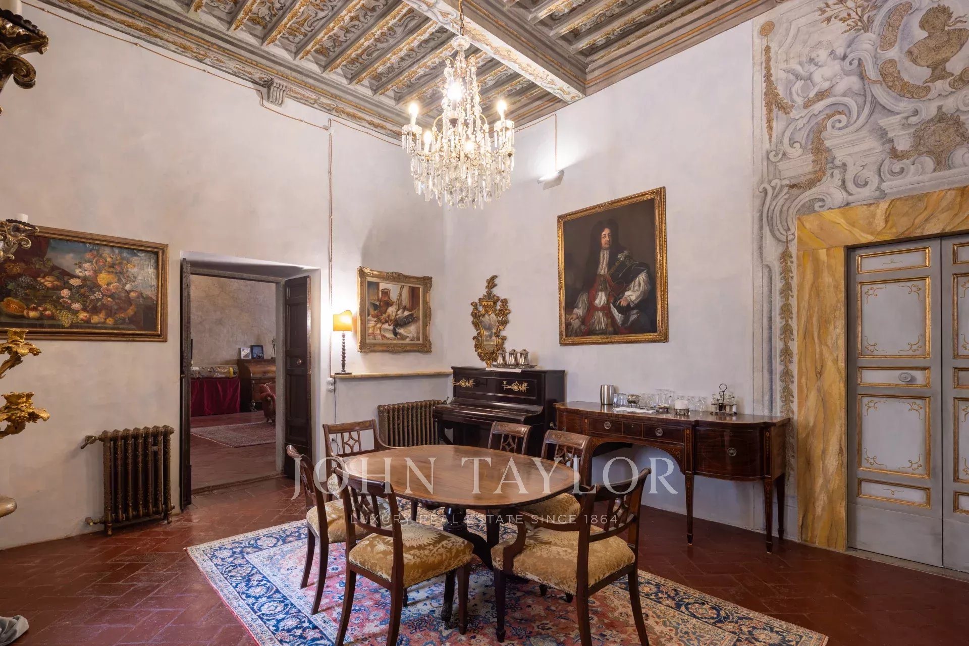 La propiedad se extiende en una sola planta de aproximadamente 646 metros cuadrados; los amplios salones, caracterizados por majestuosas chimeneas de piedra, incluida una diseñada por Pietro da Cortona, se sitúan en la zona central, mientras que los 7 dormitorios, 4 de ellos con baño privado, se disponen a lo largo de los bordes.