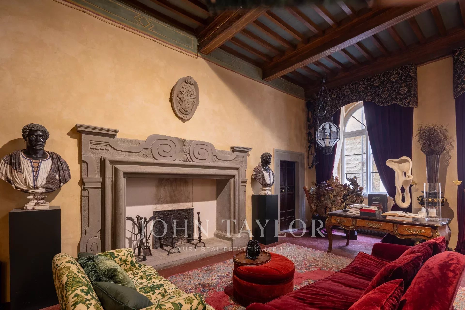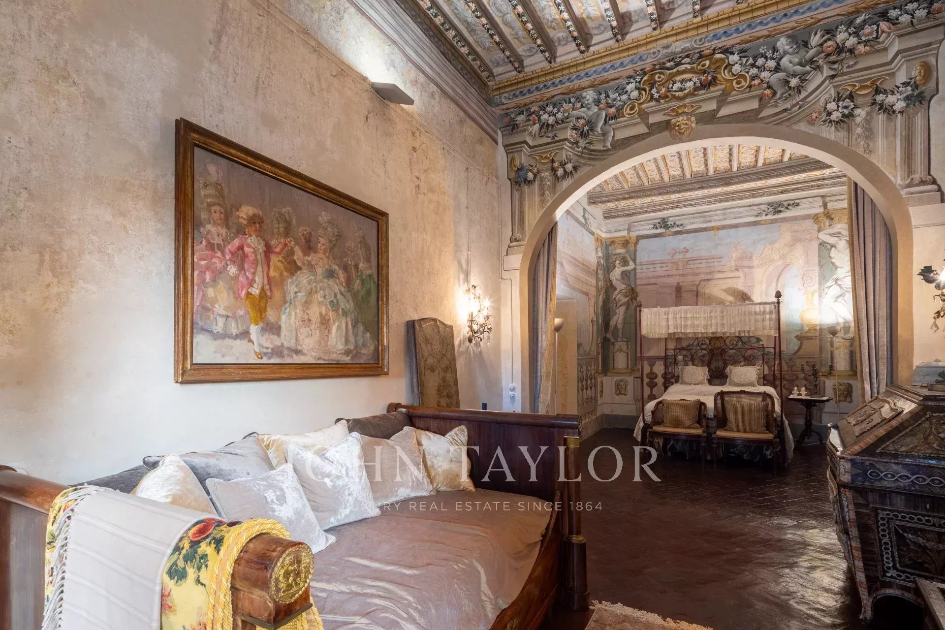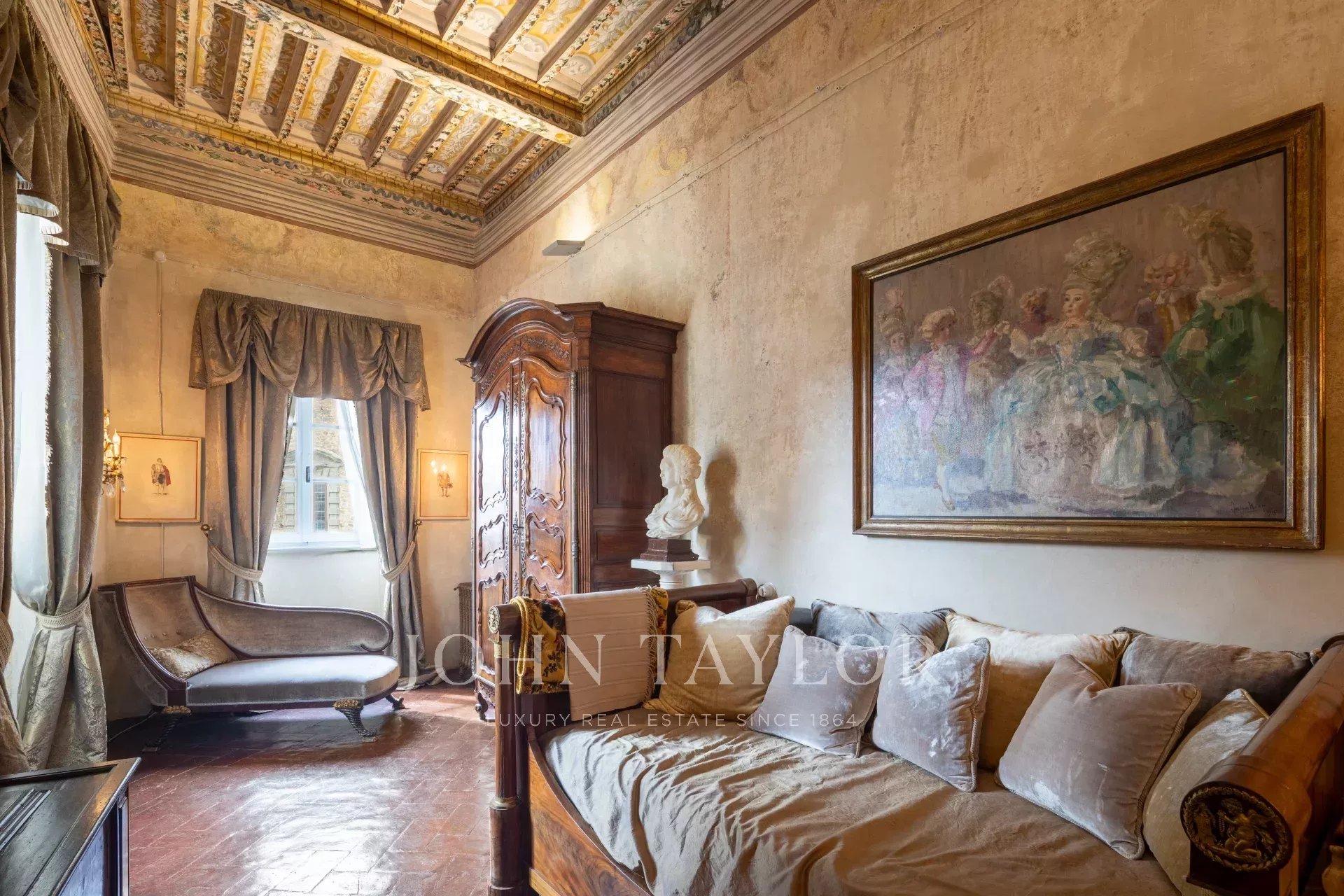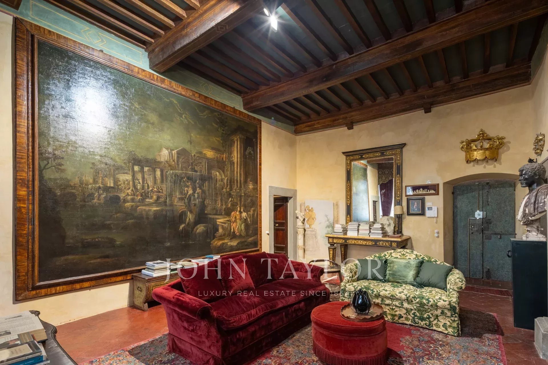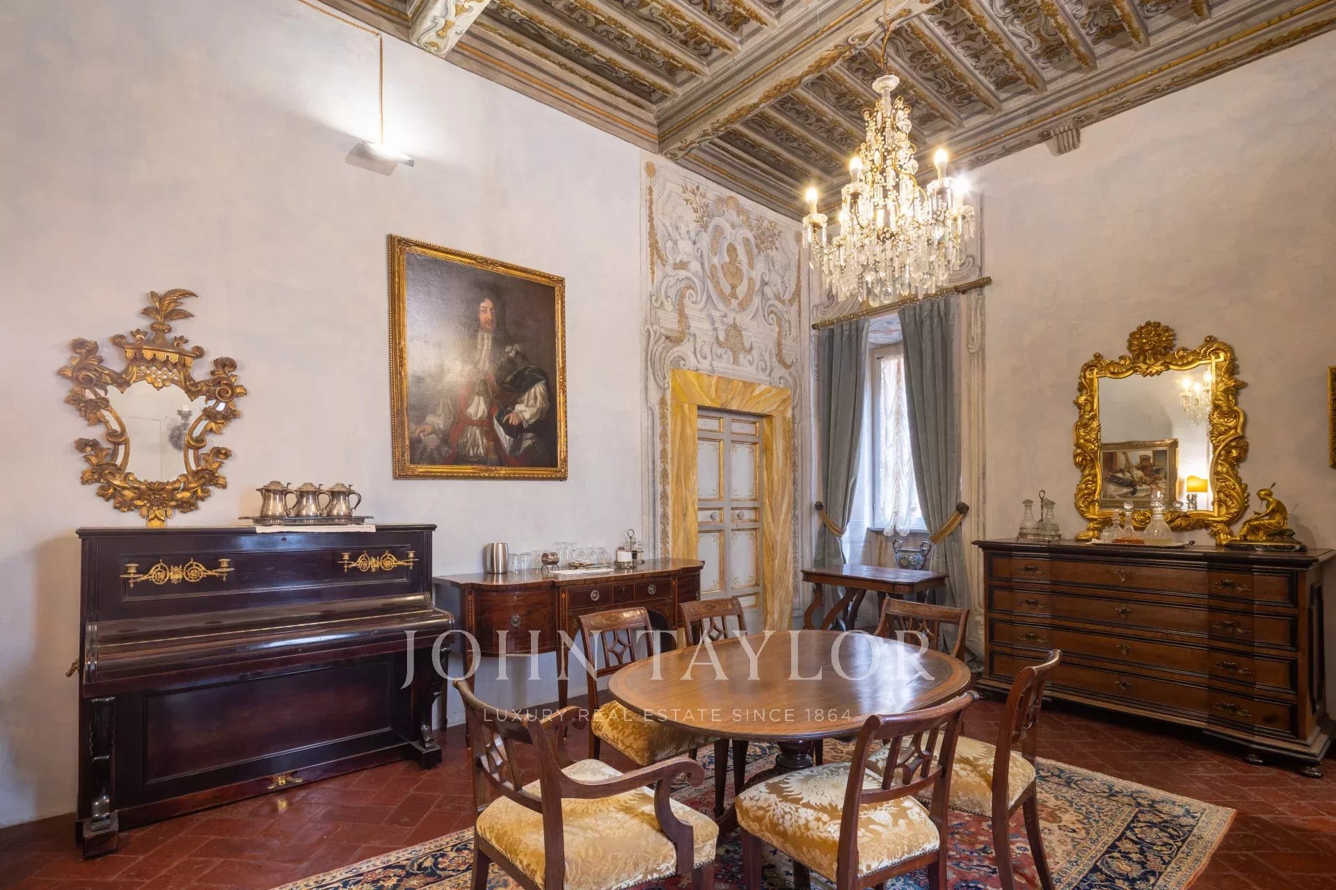 La propiedad se extiende en una sola planta de aproximadamente 646 metros cuadrados; los amplios salones, caracterizados por majestuosas chimeneas de piedra, incluida una diseñada por Pietro da Cortona, se sitúan en la zona central, mientras que los 7 dormitorios, 4 de ellos con baño privado, se disponen a lo largo de los bordes.