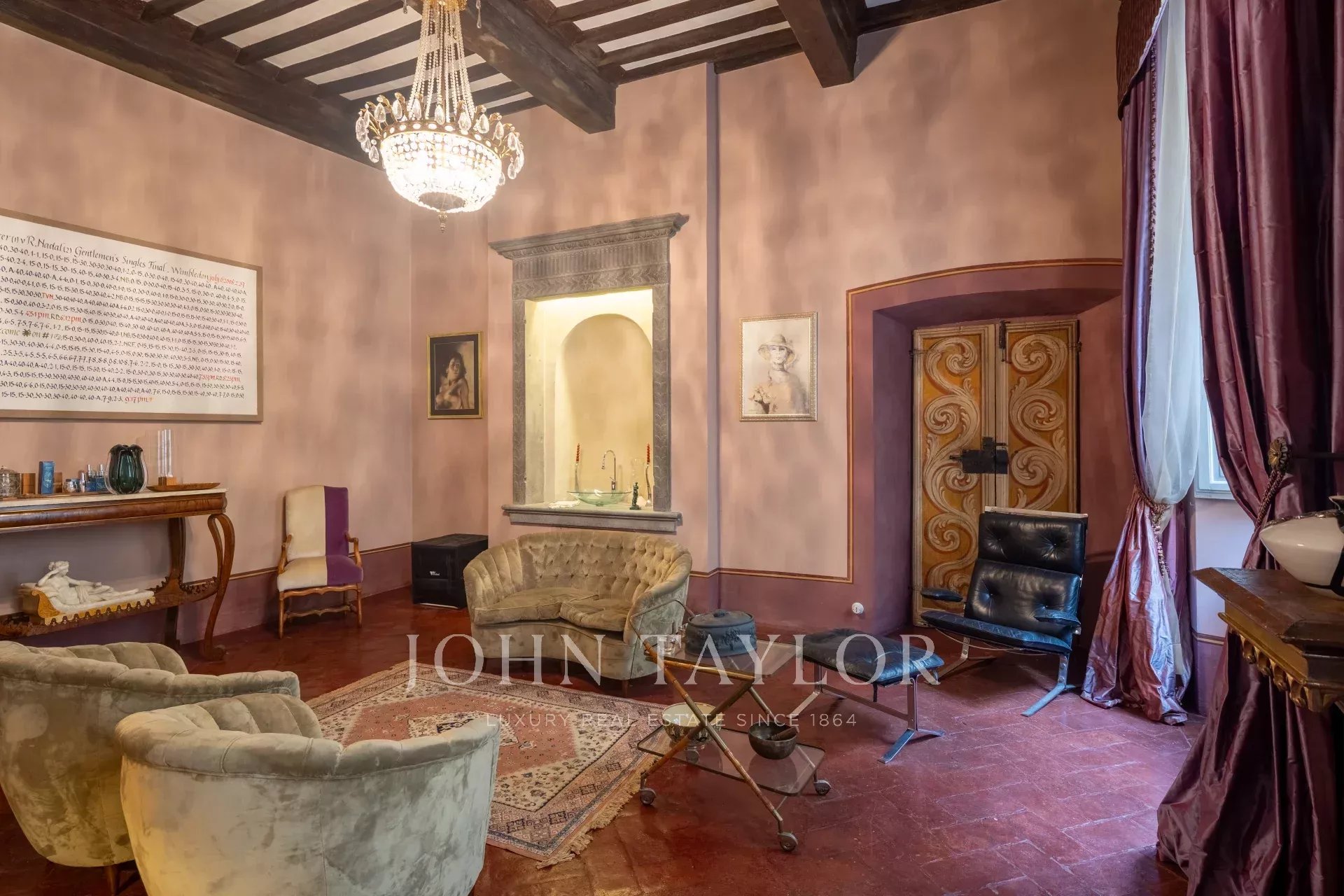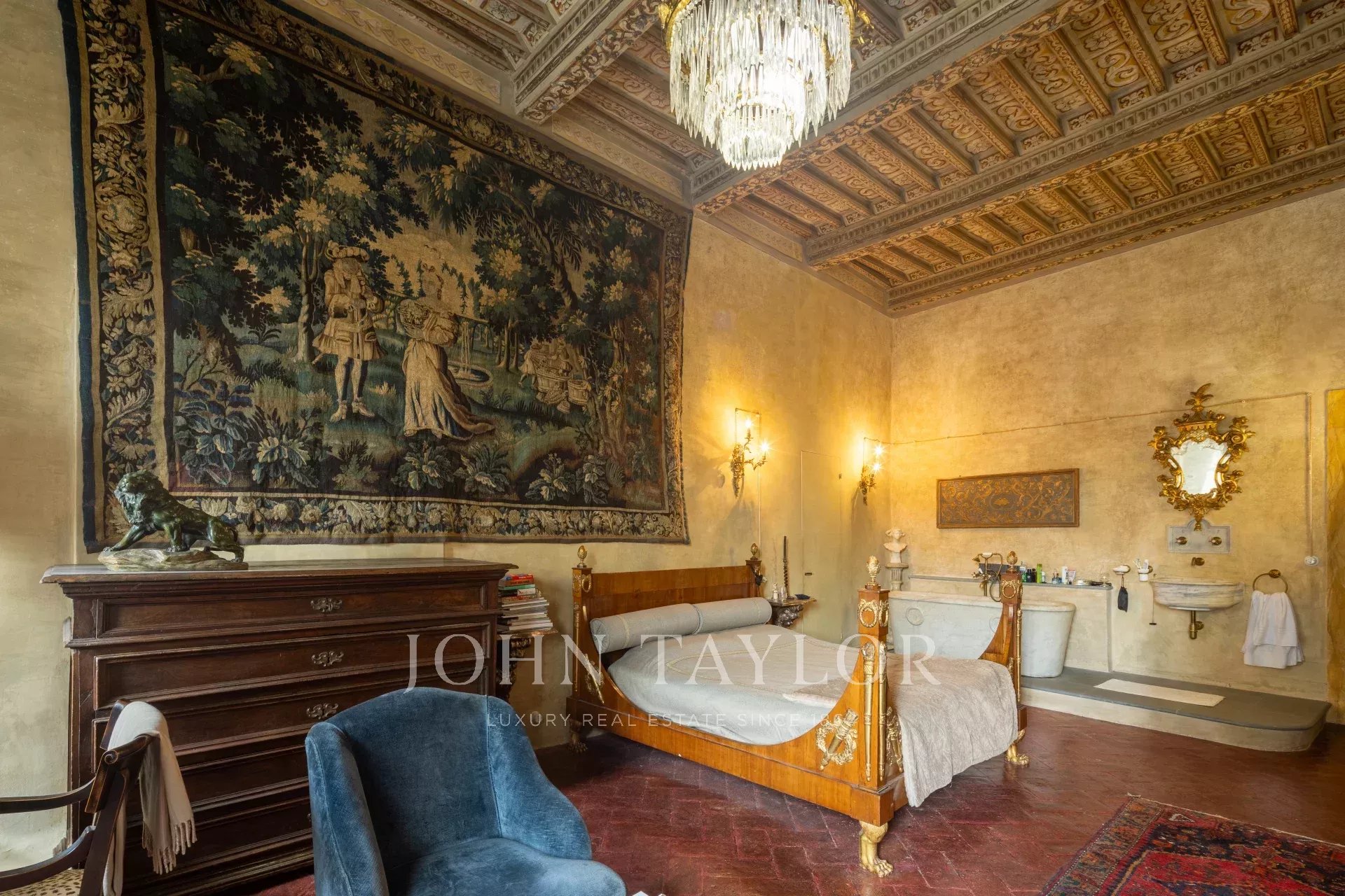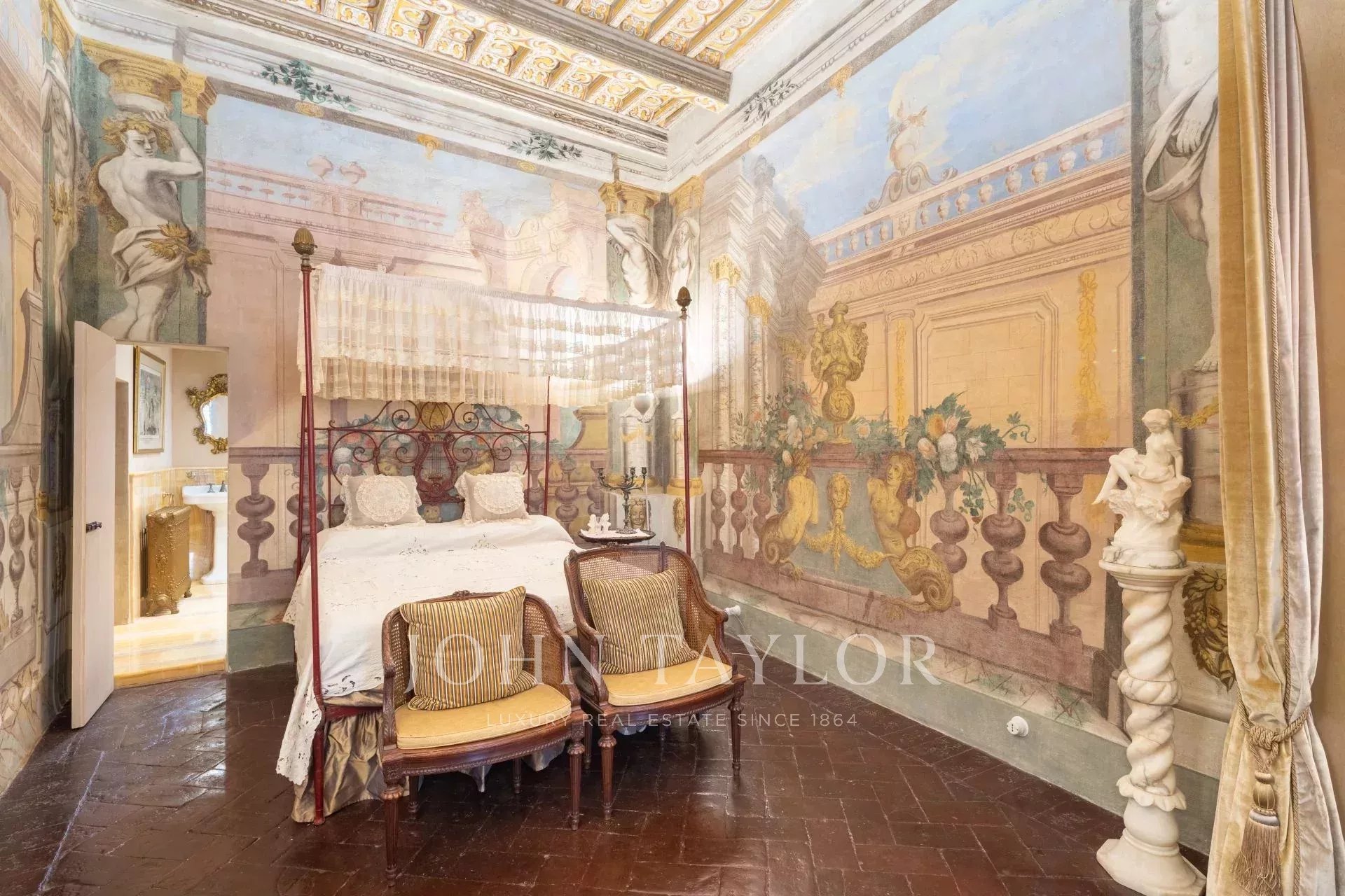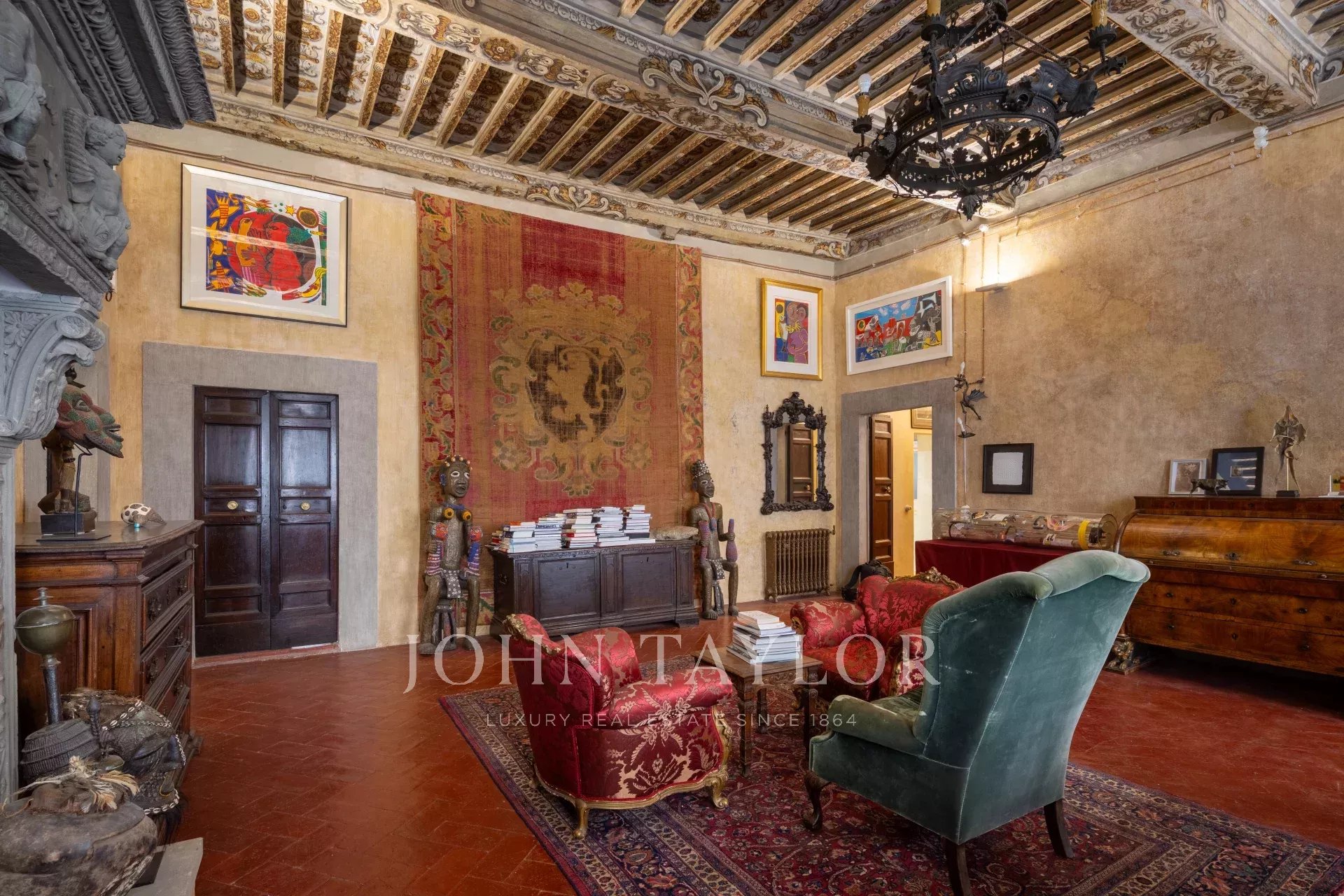 La propiedad se extiende en una sola planta de aproximadamente 646 metros cuadrados; los amplios salones, caracterizados por majestuosas chimeneas de piedra, incluida una diseñada por Pietro da Cortona, se sitúan en la zona central, mientras que los 7 dormitorios, 4 de ellos con baño privado, se disponen a lo largo de los bordes.