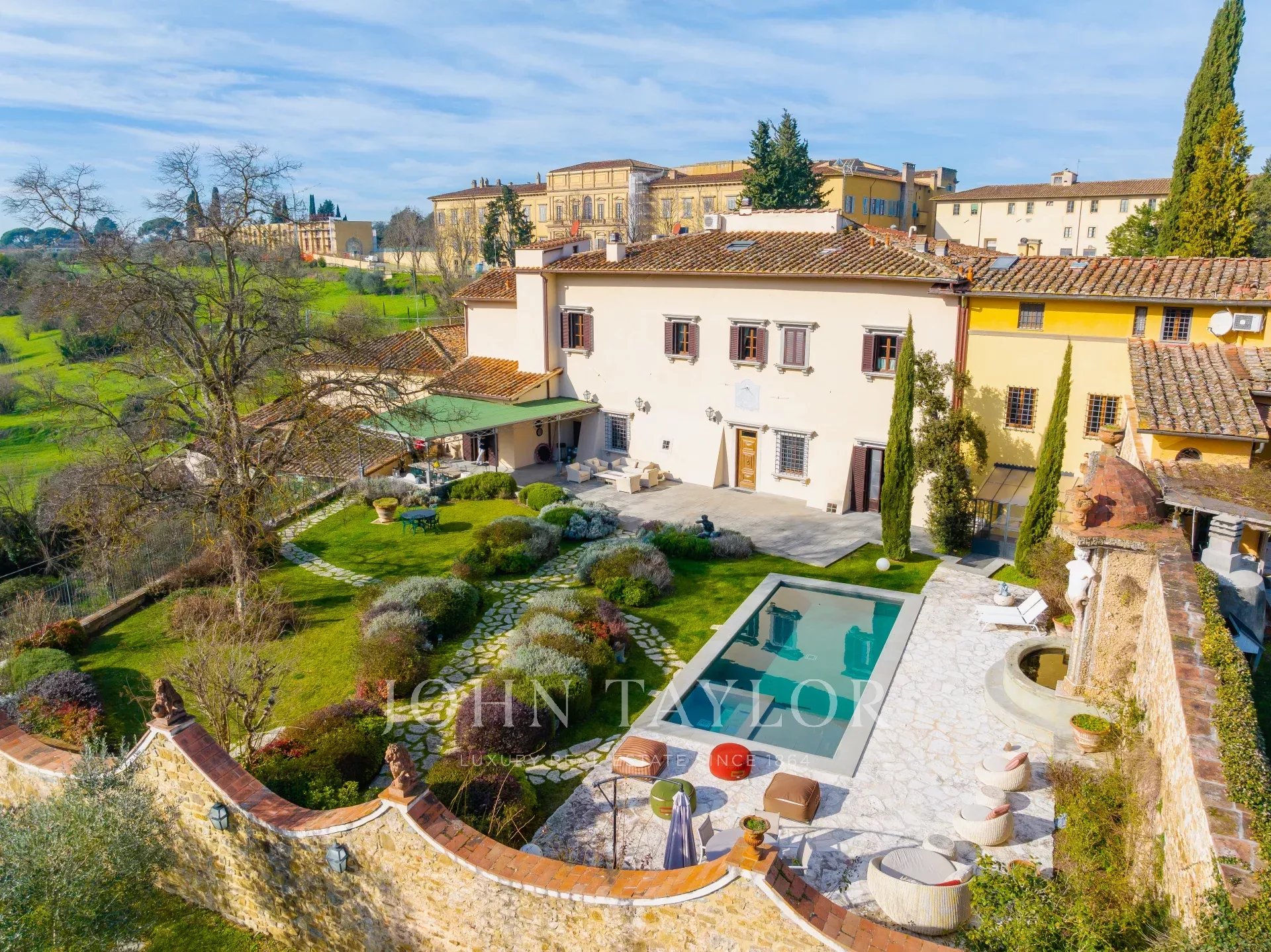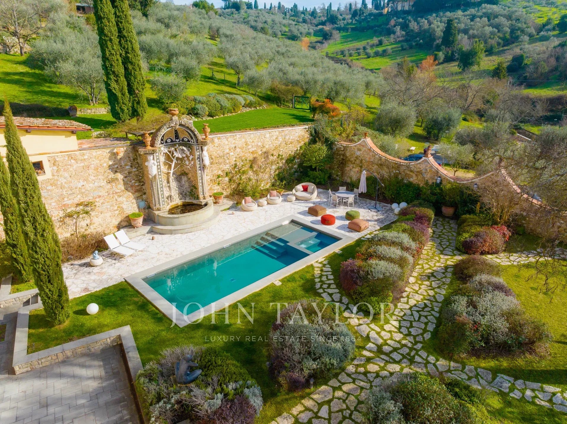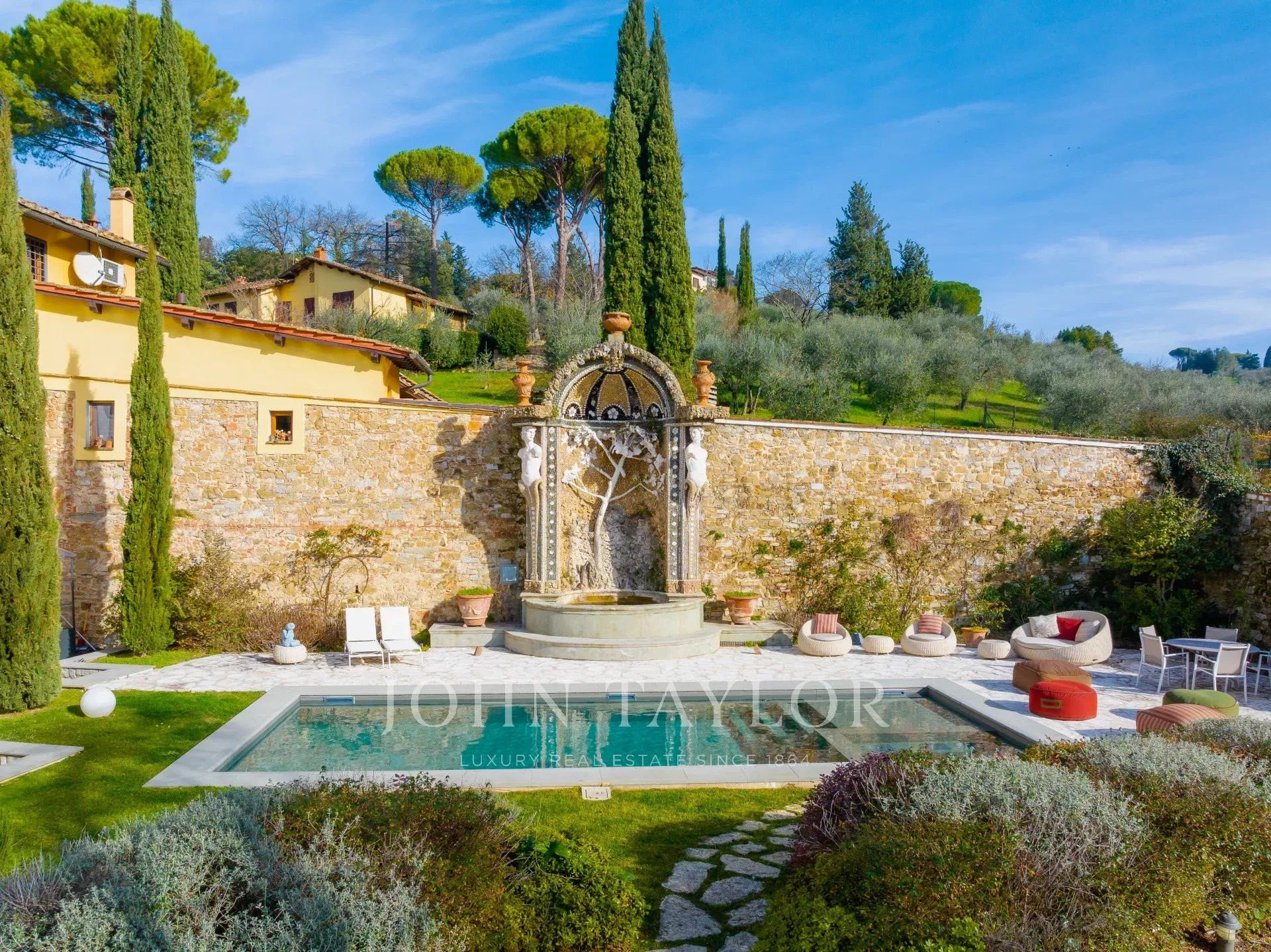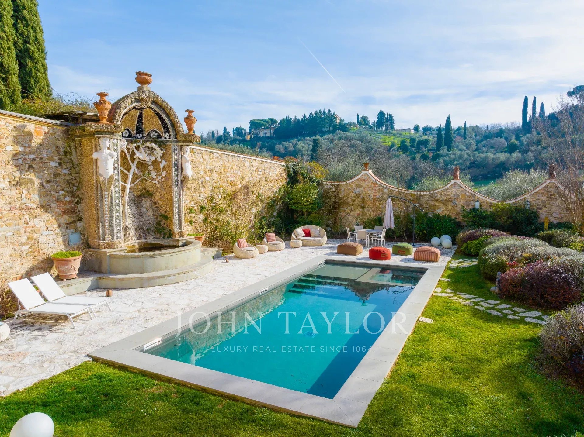 El jardín amurallado de 880 m² conserva una exquisita fuente del siglo XVI diseñada por el renombrado arquitecto Bernardo Buontalenti y una piscina de 10 x 4 m, rodeada de un pavimento de piedra oscura y una zona para tomar el sol.