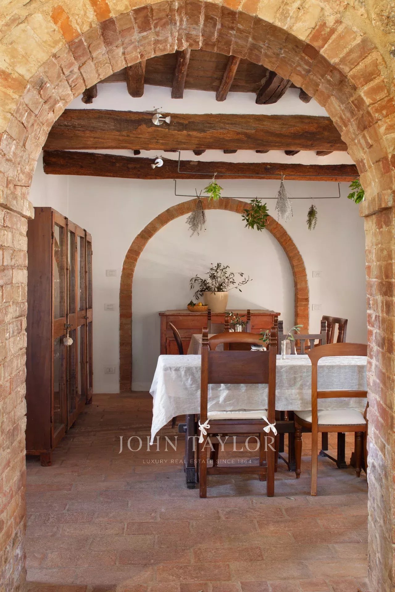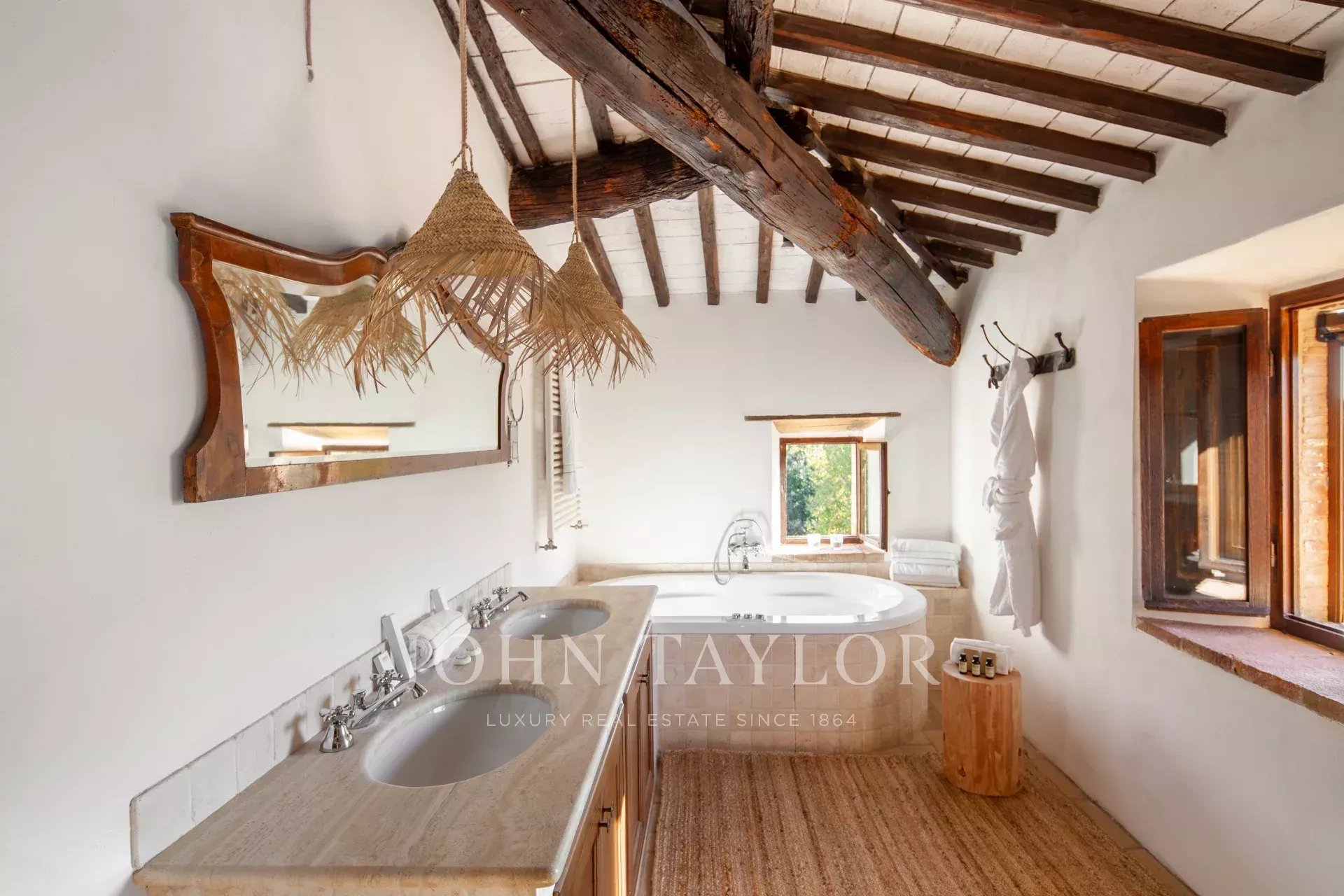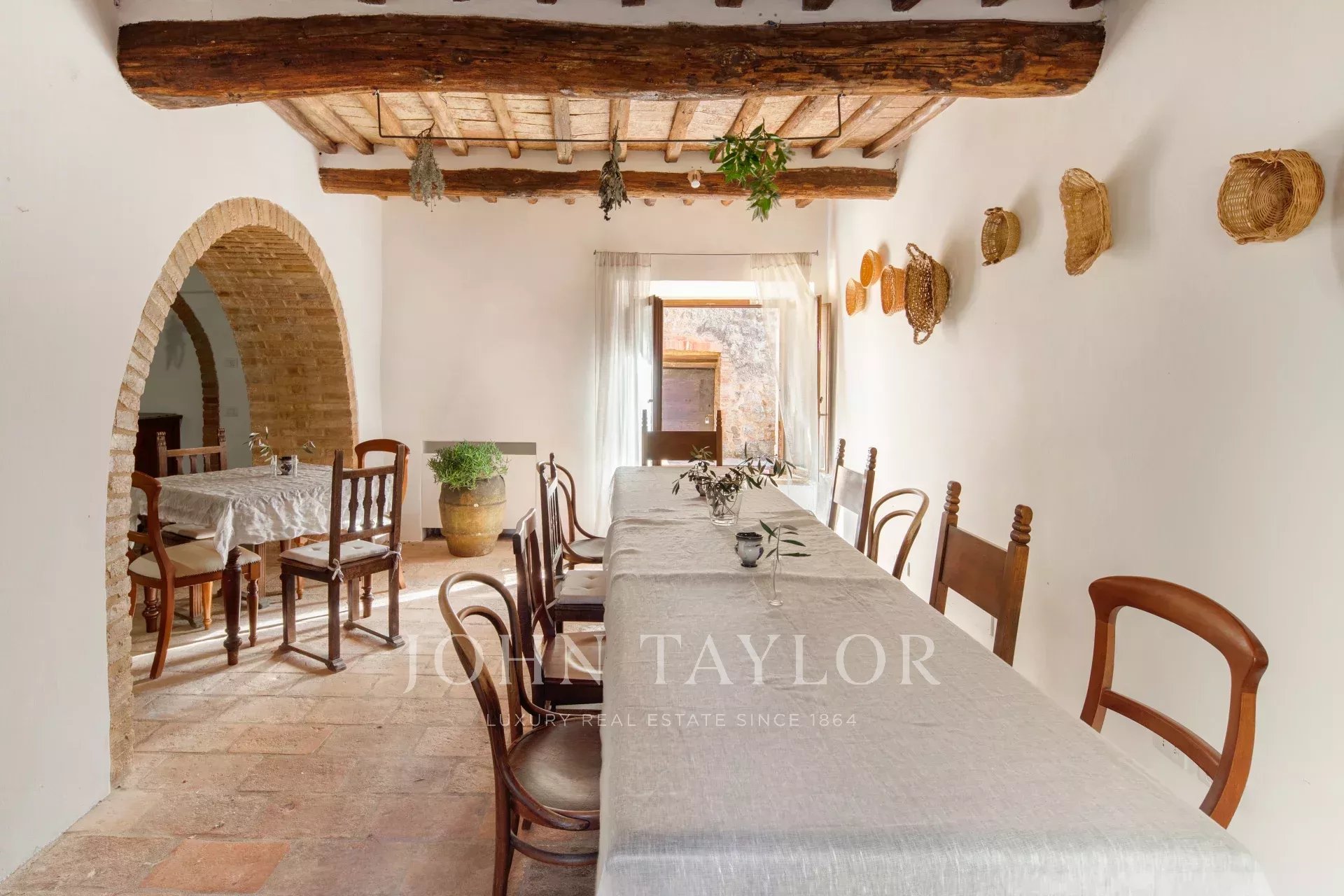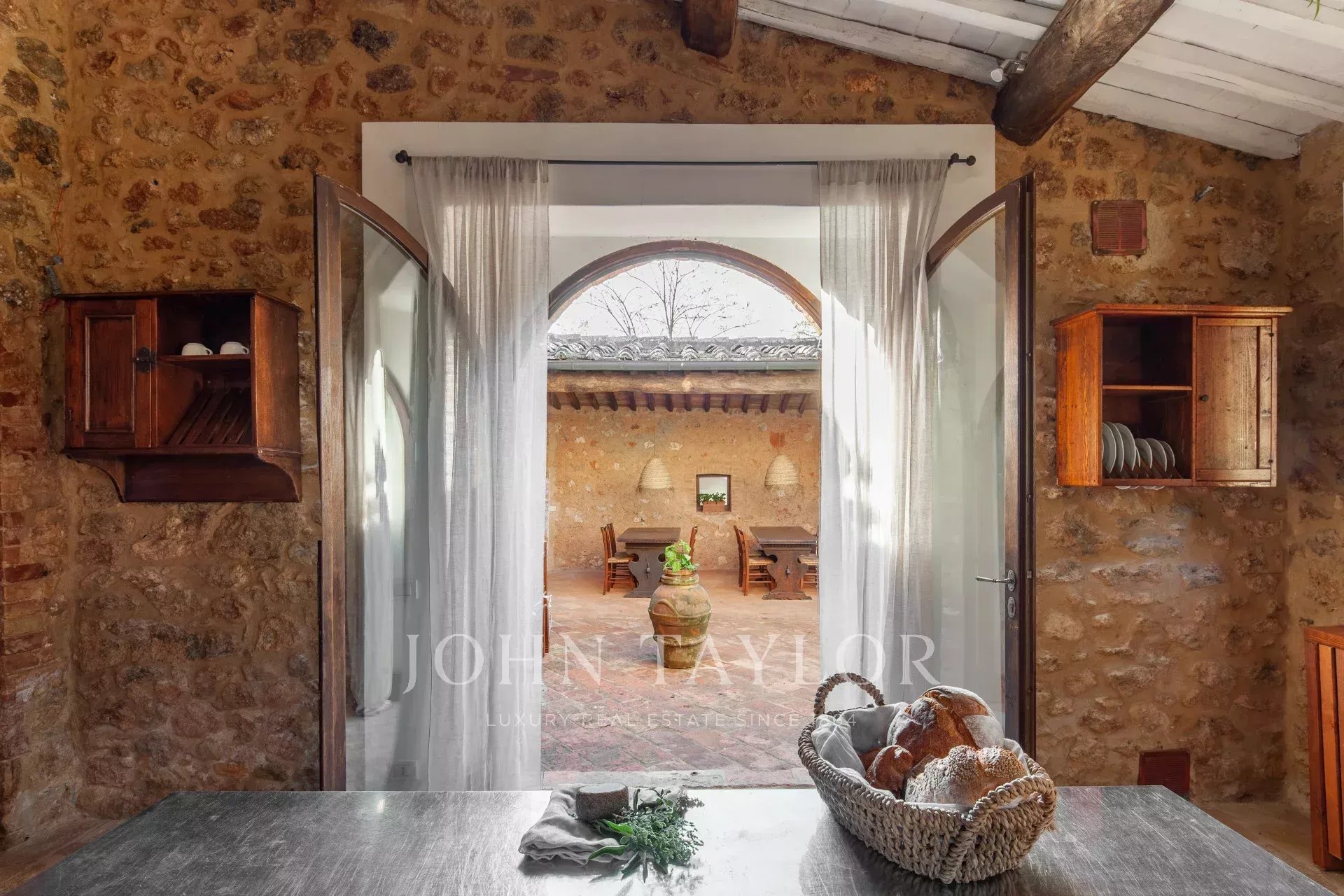 Situada en el corazón de la Toscana, esta propiedad ofrece vistas panorámicas de la campiña de Chianti Colli Senesi, a sólo 15 minutos en coche de Siena. La finca data del siglo XII y ha sido restaurada con buen gusto, conservando su carácter original con materiales naturales como piedra, terracota y vigas de madera.