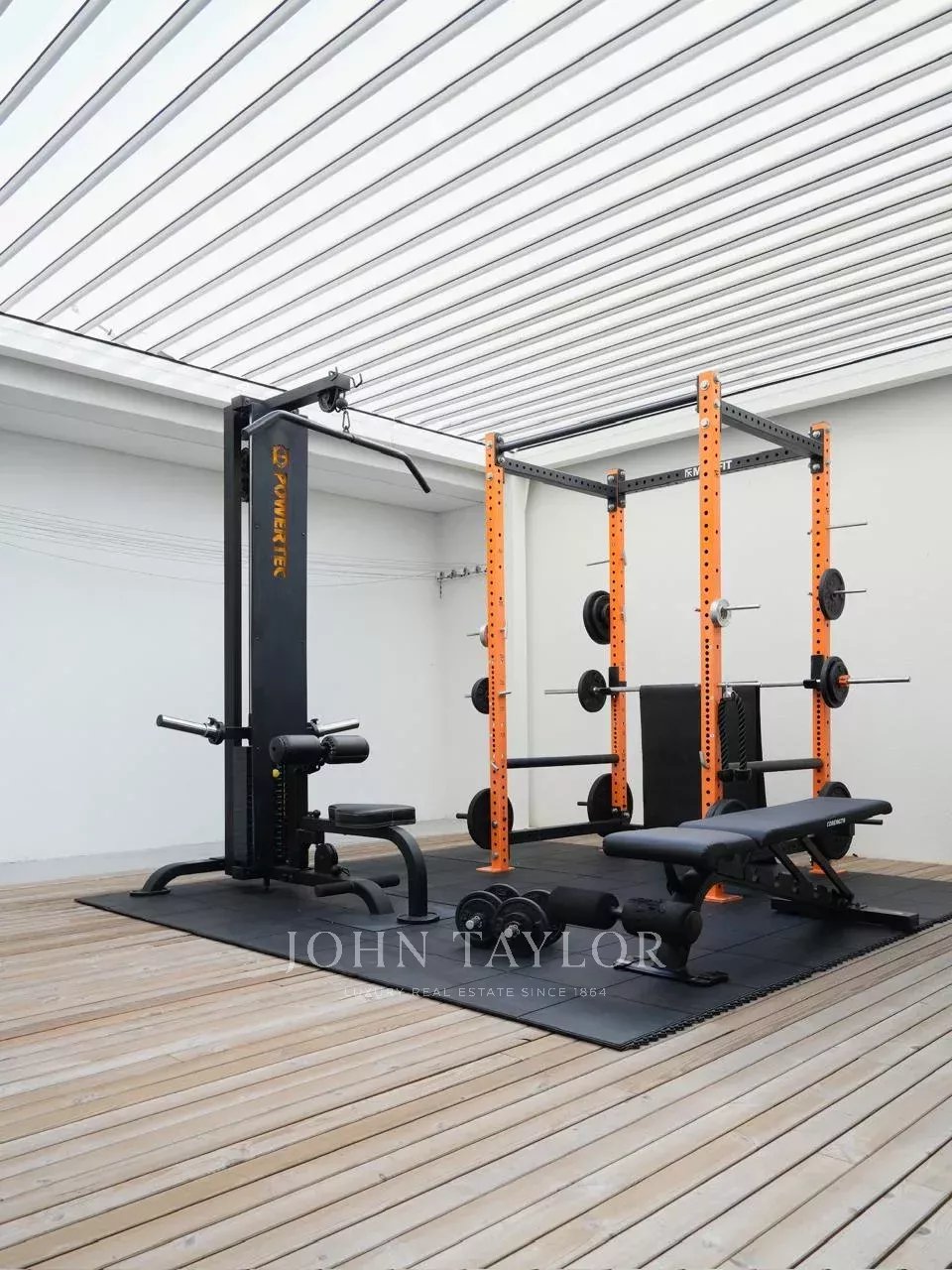 Para un estilo de vida activo, la villa cuenta con una sala de fitness totalmente equipada, que incluye power rack, banco ajustable, barra, mancuernas, discos de peso y una máquina de poleas con cable alto y bajo. Además, dispone de un deck independiente, ideal para la práctica de yoga, estiramientos o ejercicio al aire libre, siempre con los arrozales como telón de fondo.
