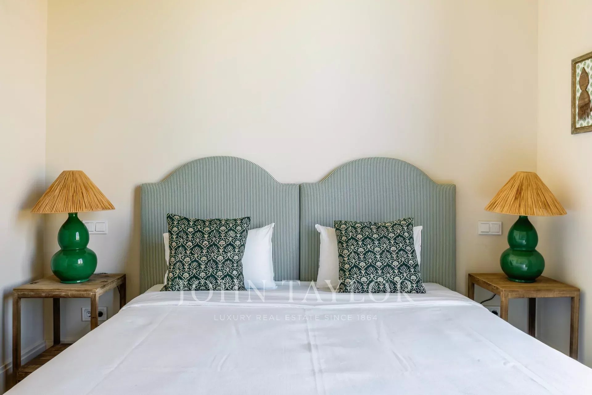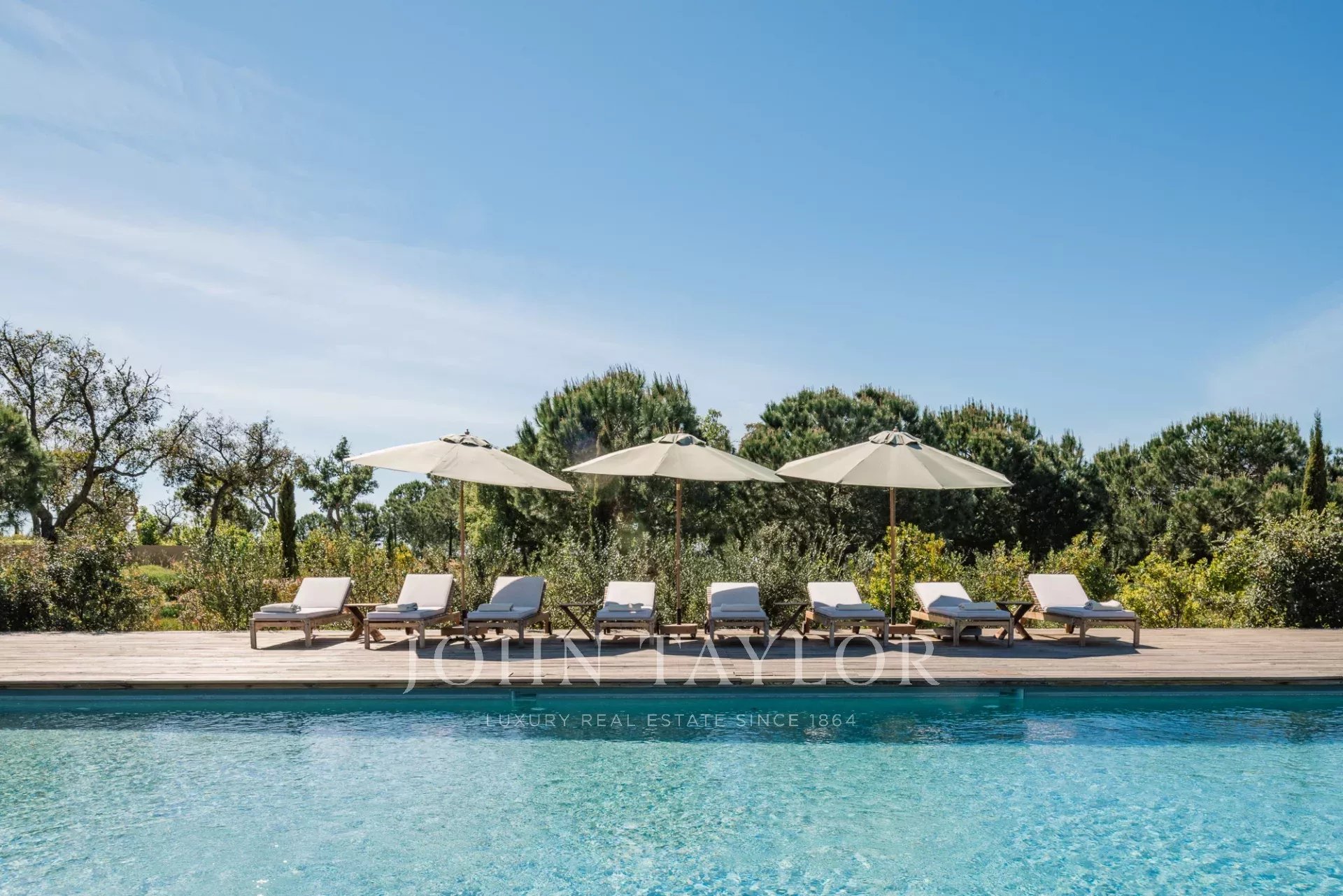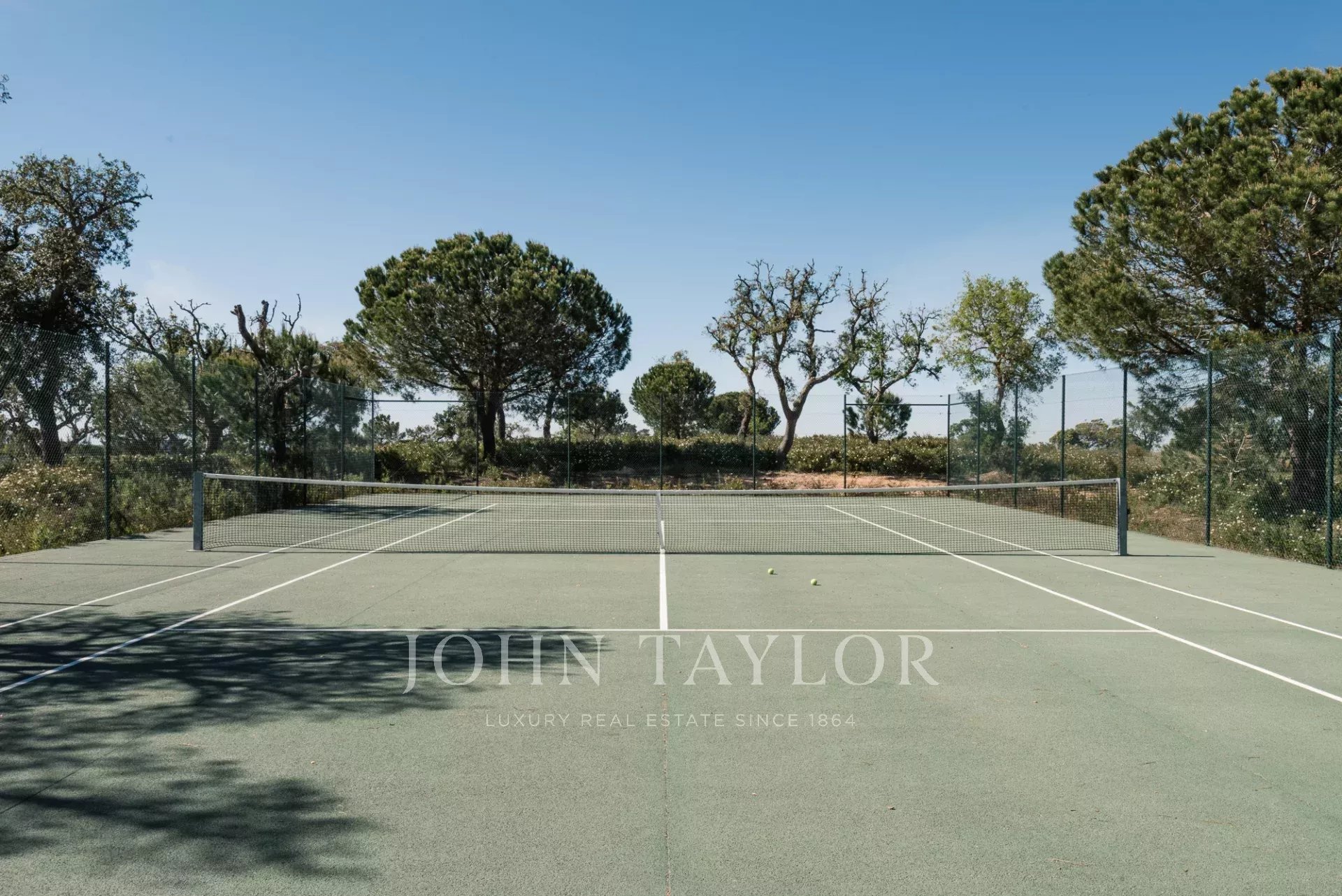 En el exterior, encontrará una impresionante piscina, varias terrazas y porches perfectos para momentos de ocio y una pista de tenis, un poco más alejada, que garantiza la tranquilidad de los demás mientras se disputan los partidos.
