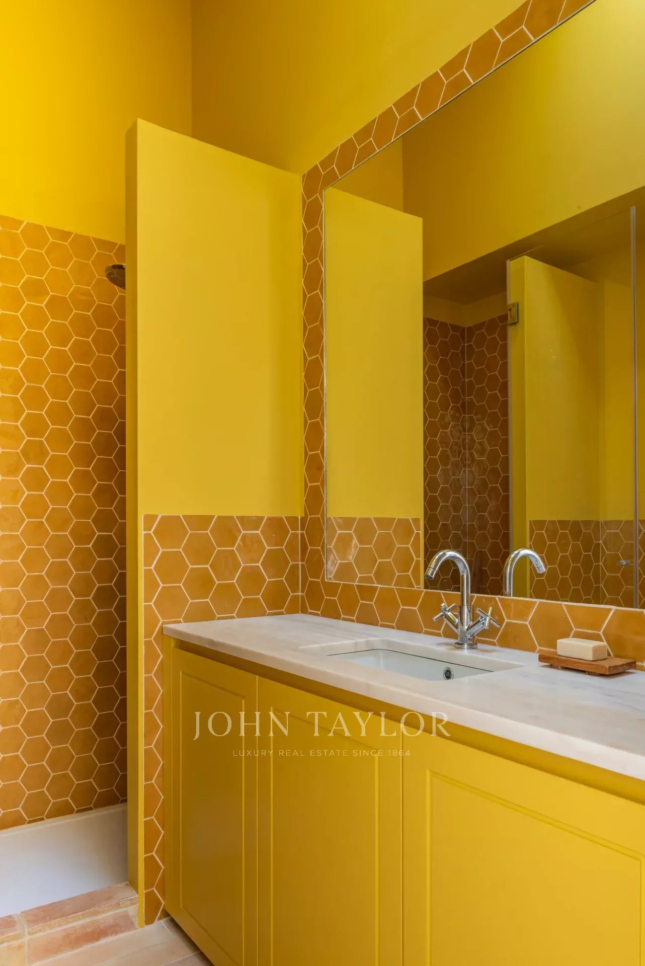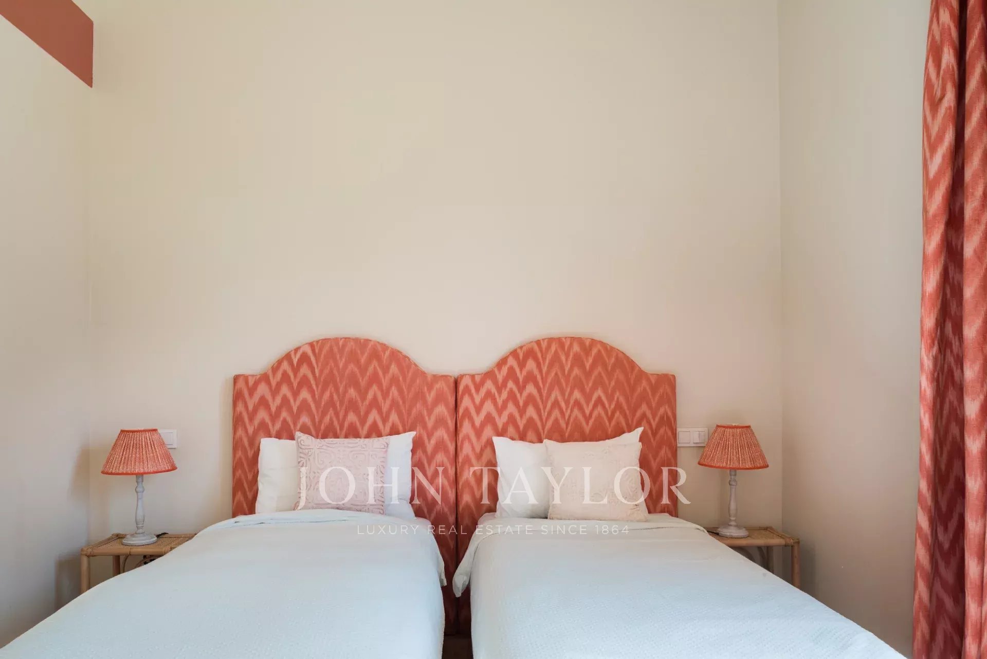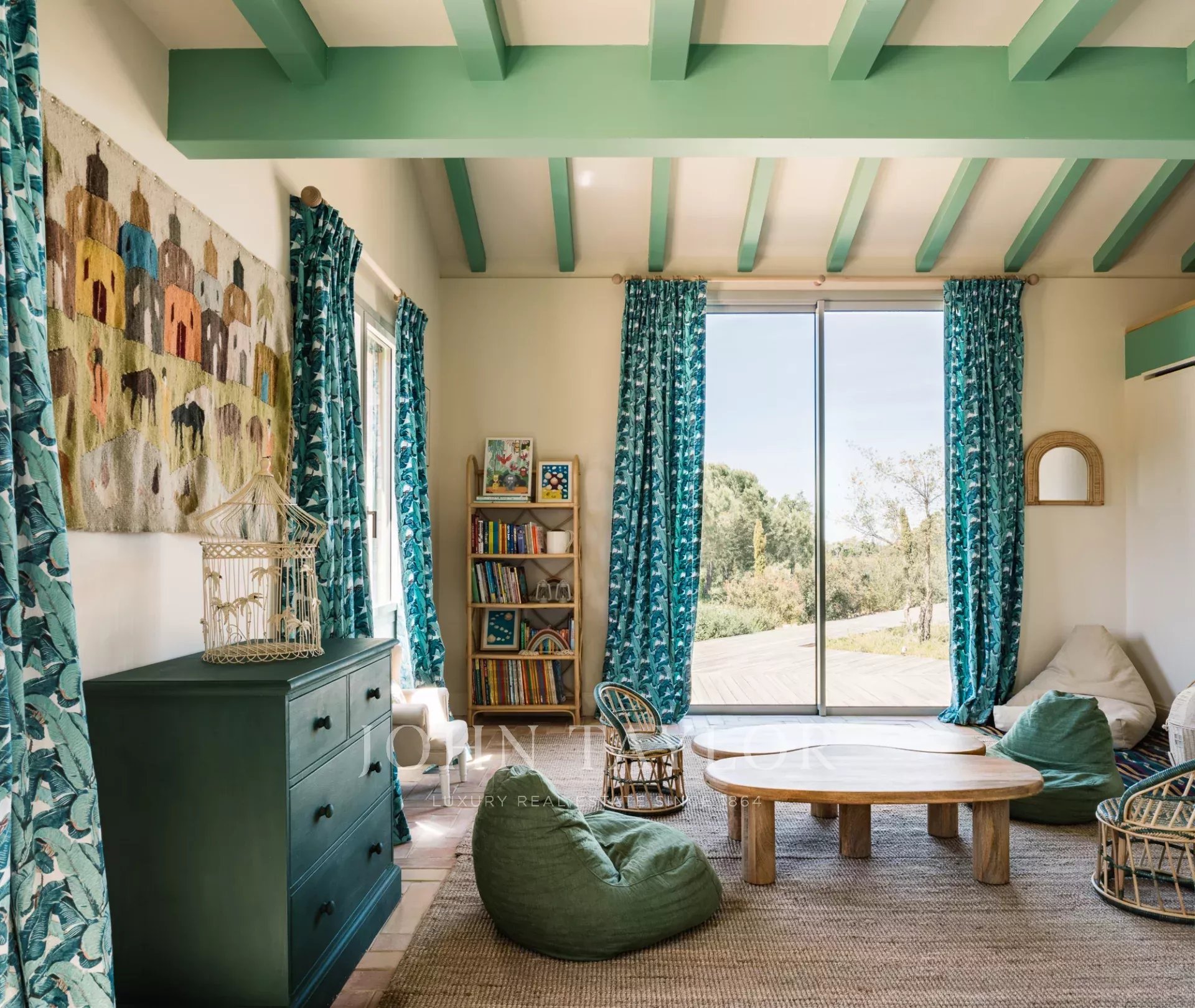 En el exterior, encontrará una impresionante piscina, varias terrazas y porches perfectos para momentos de ocio y una pista de tenis, un poco más alejada, que garantiza la tranquilidad de los demás mientras se disputan los partidos.