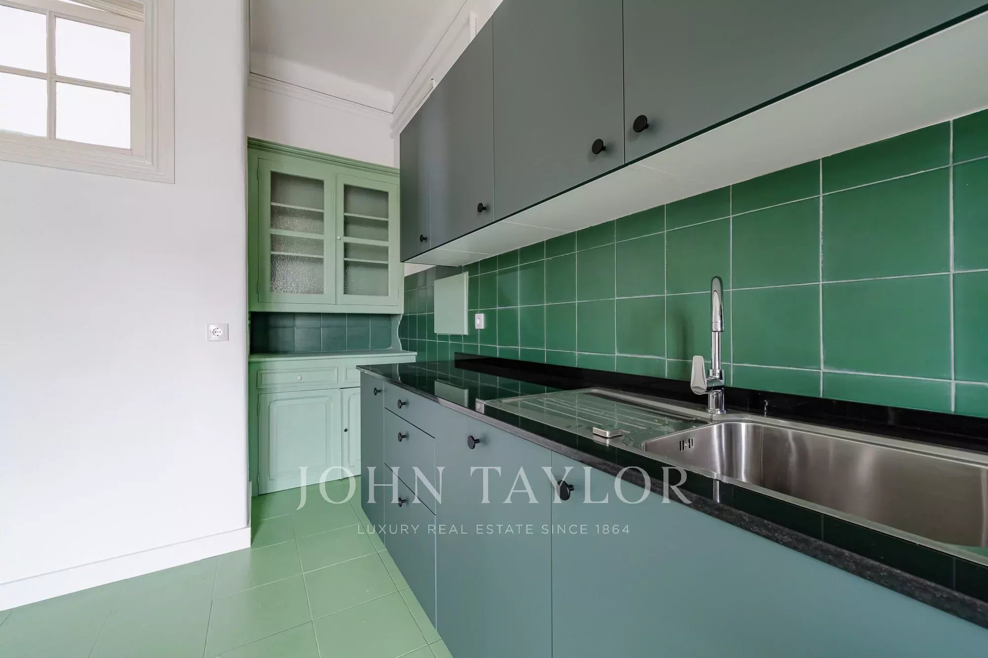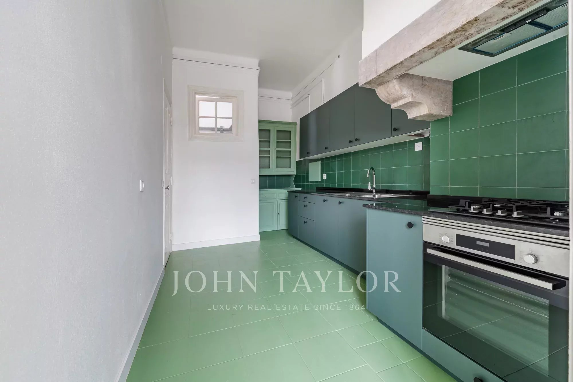 Los suelos de madera barnizada, los techos altos de 3,20 m con molduras decorativas añaden un carácter clásico y acogedor, complementado por la cocina semiequipada con suelo de mosaico.