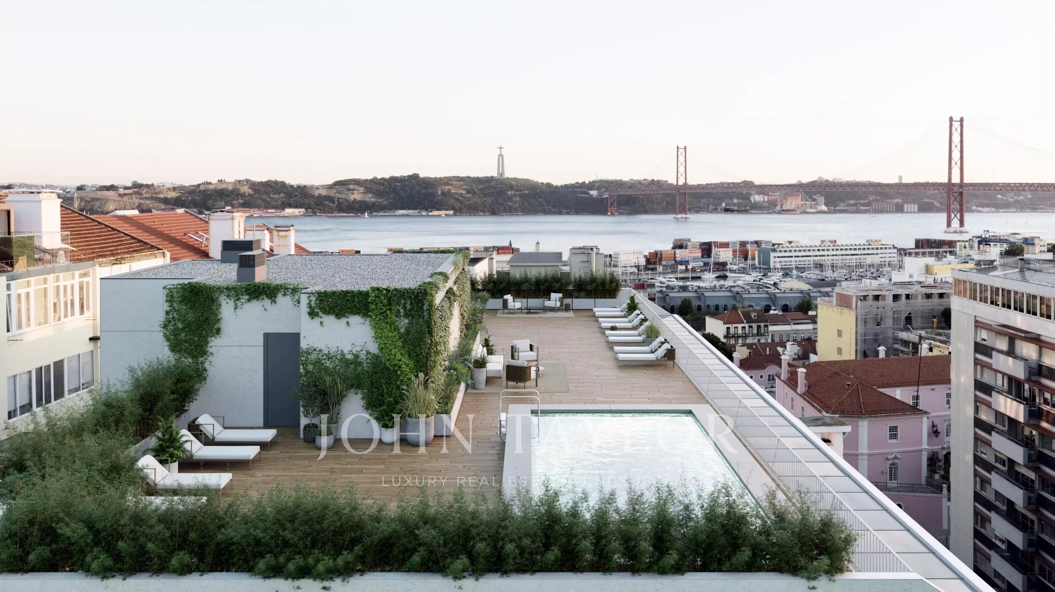 El condominio Infante Residences tiene acceso exclusivo a una elegante azotea con piscina y zona de ocio, perfecta para disfrutar de las vistas panorámicas sobre la capital y el río Tajo.