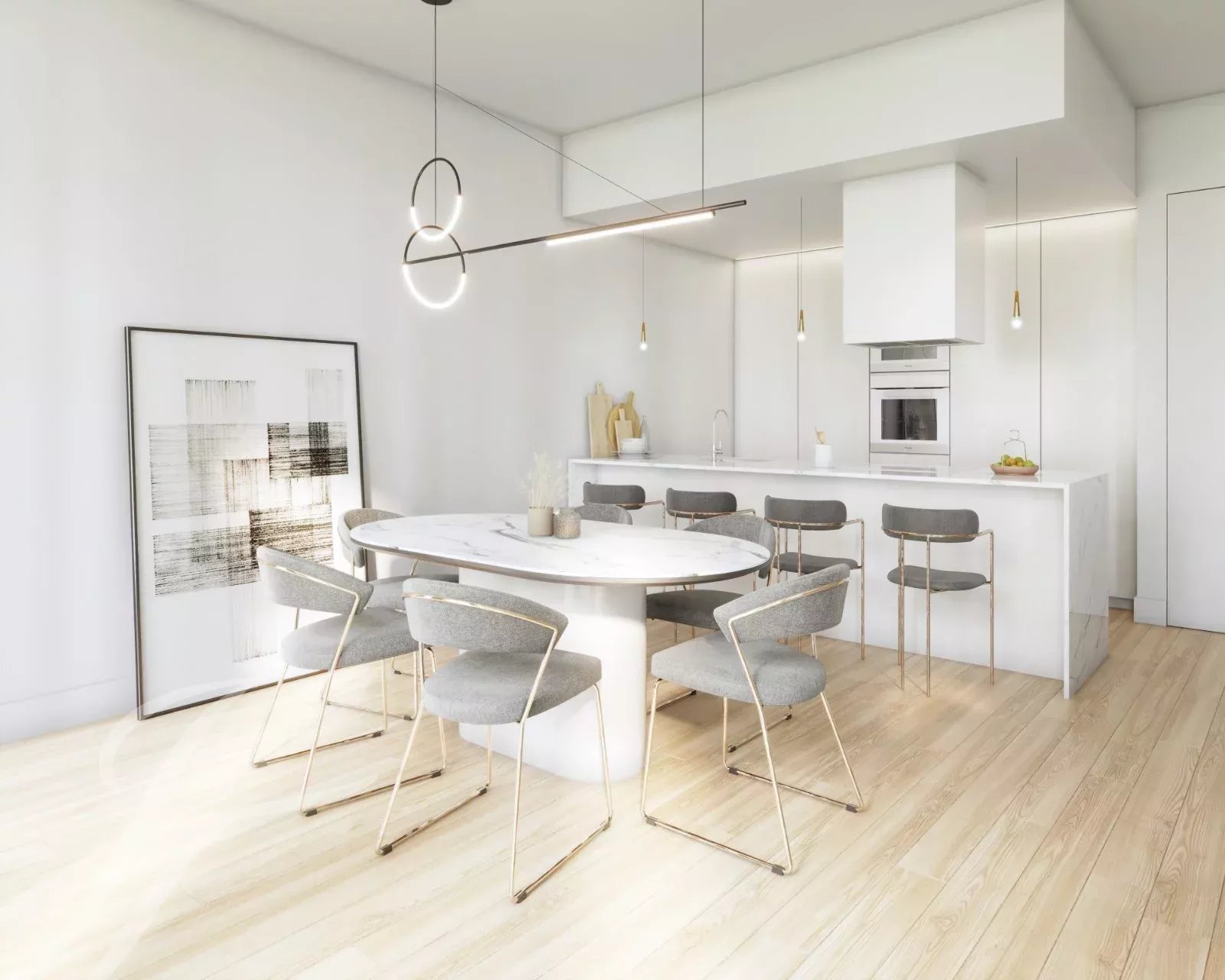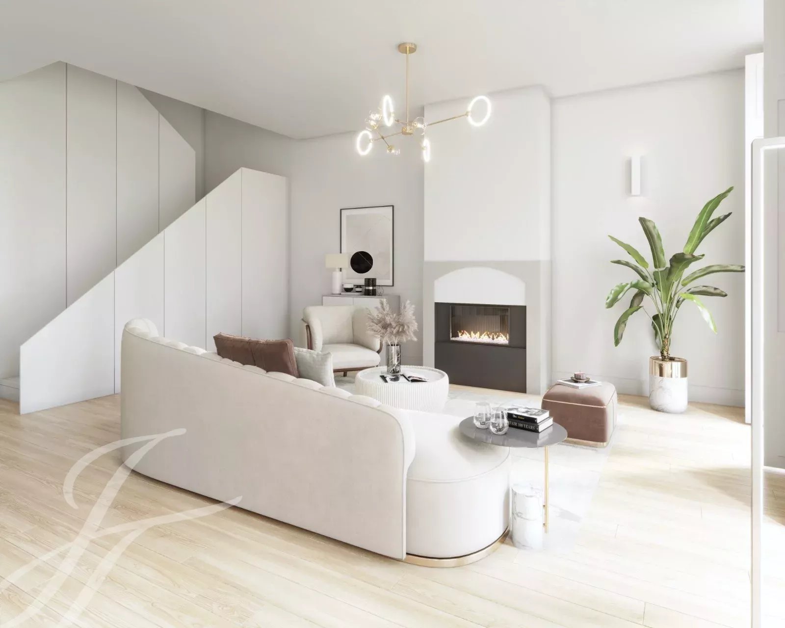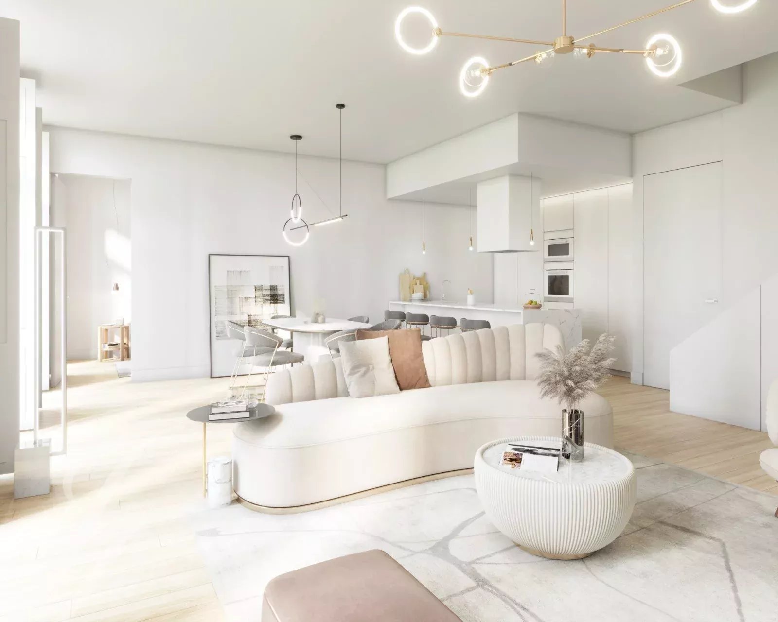 El salón es espacioso y está lleno de luz natural, diseñado para reuniones sociales con amplios espacios. Cada uno de los tres dormitorios tiene un cuarto de baño en suite y un armario. Los materiales preferidos incluyen piedra caliza Lioz, mármol, granito y madera noble.