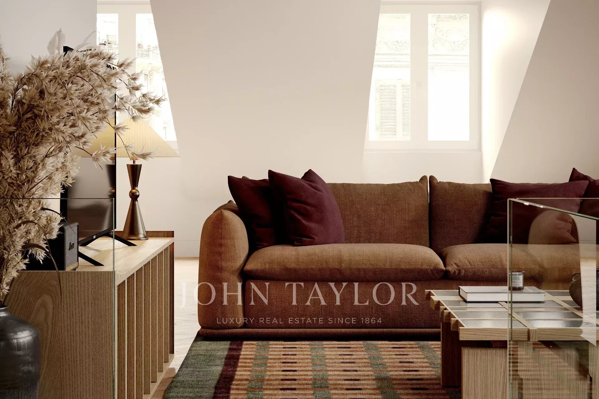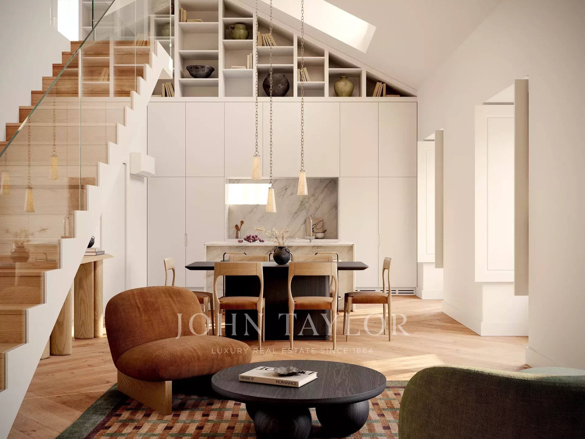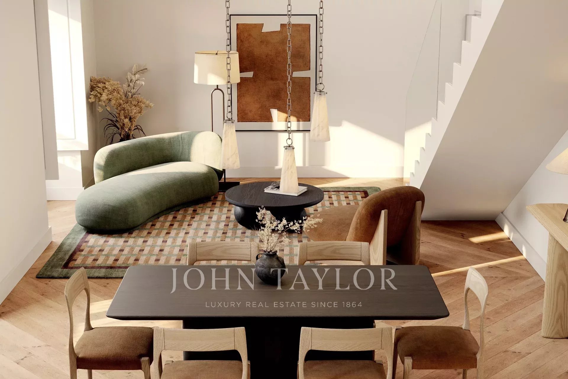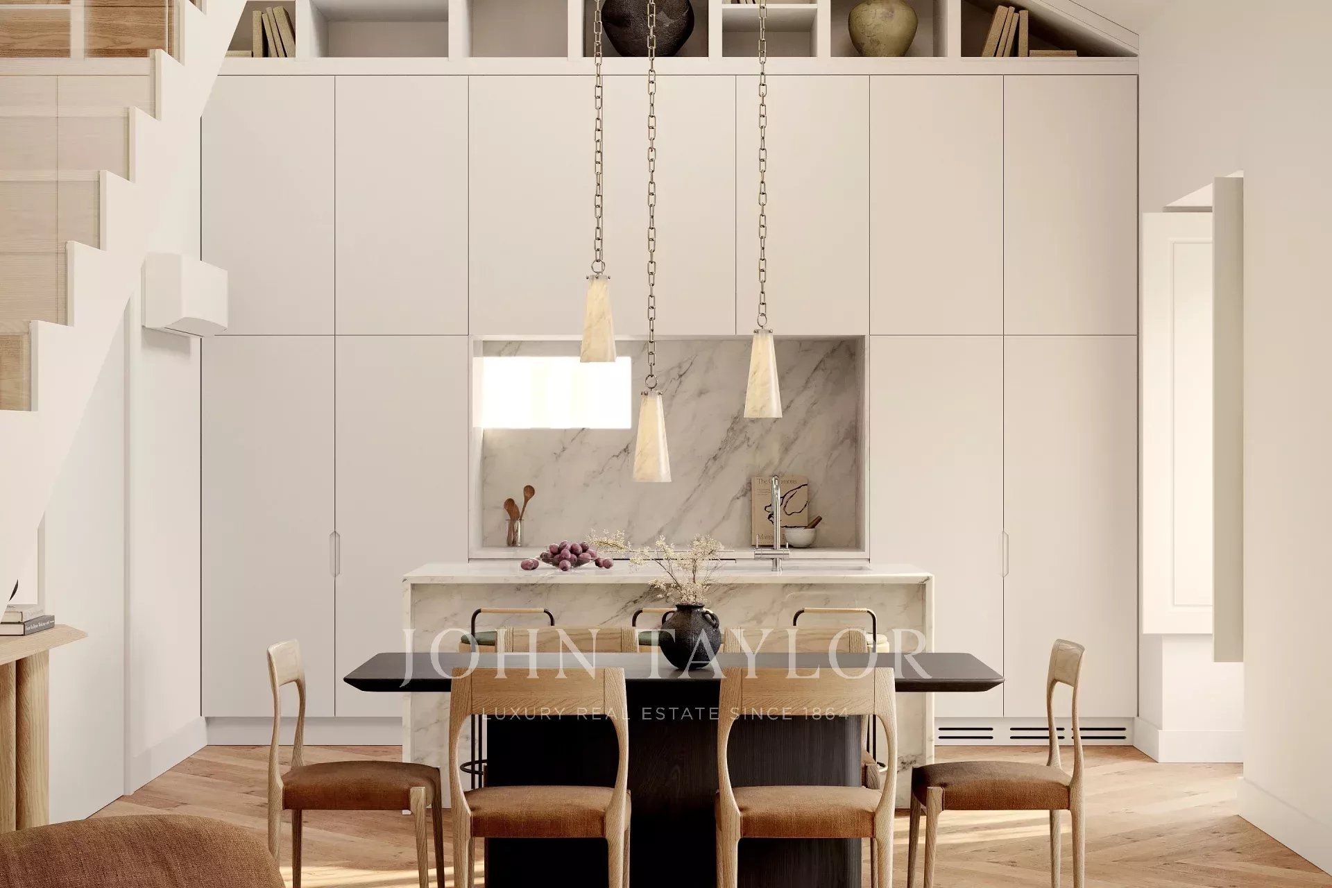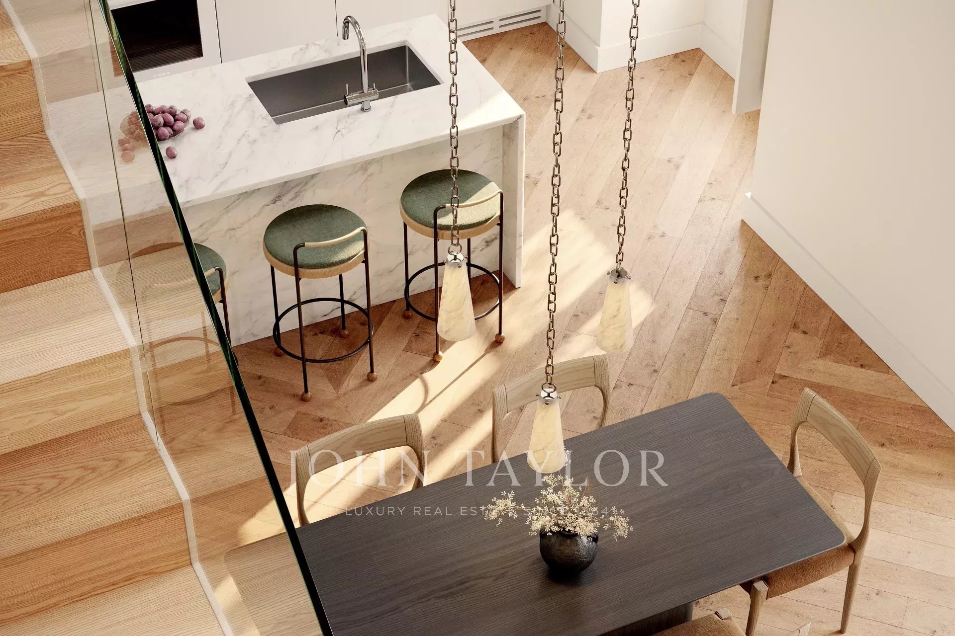 Con aproximadamente 187 m2 de superficie interior, el apartamento cuenta con un salón-comedor luminoso y abierto con techos altos y grandes ventanales tradicionales. La cocina está totalmente equipada y perfectamente integrada en la zona social, por lo que es a la vez funcional y acogedora. Dos dormitorios y dos baños se encuentran en la planta principal, mientras que el nivel superior incluye un amplio dormitorio en suite con un entorno más privado y elevado, ideal como suite principal o zona de invitados.