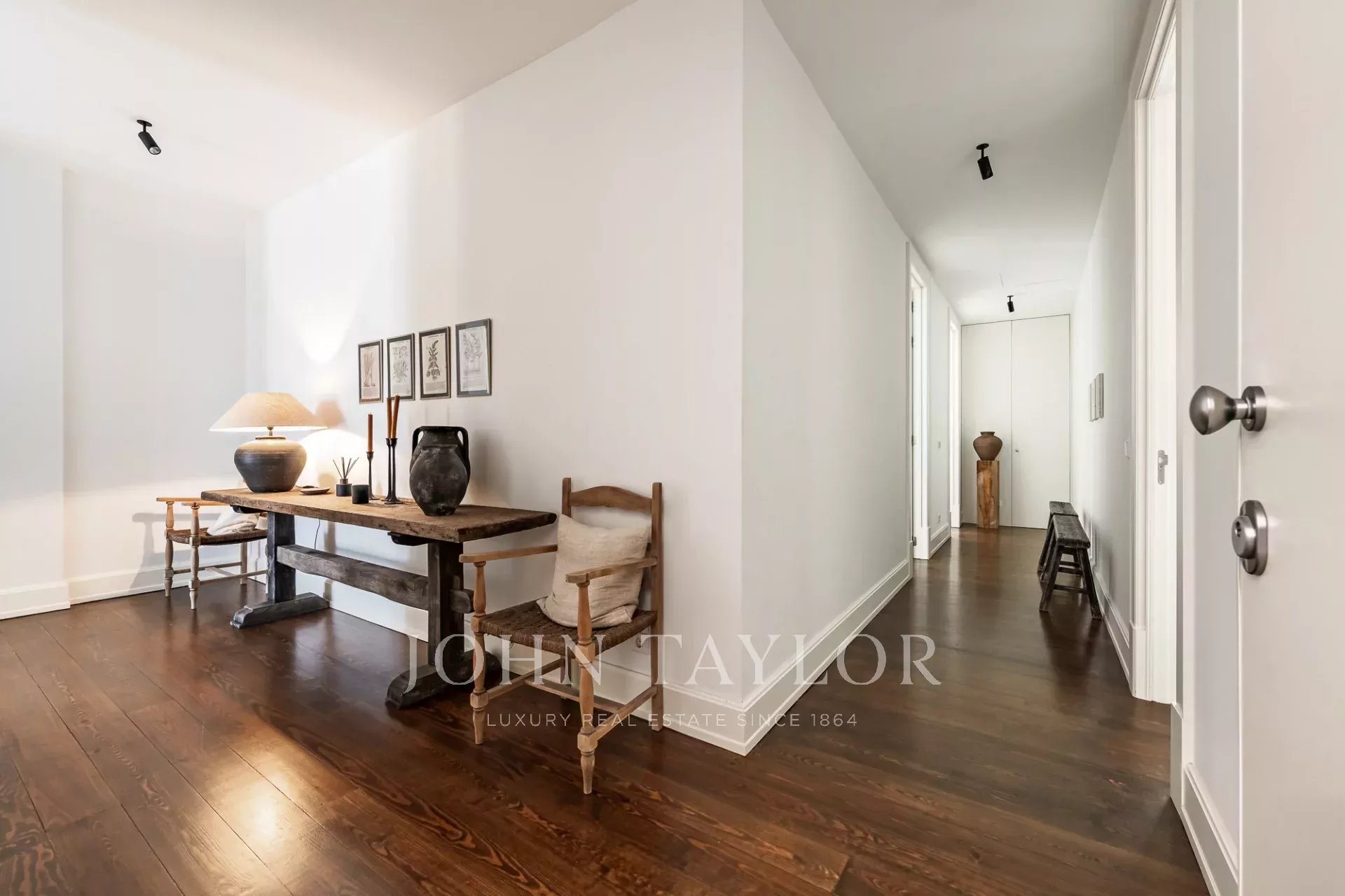 Los interiores combinan elementos clásicos con el confort contemporáneo, incluyendo suelos de madera maciza, acabados a medida y suelo radiante en todos los cuartos de baño, así como en el aseo de cortesía. Cada detalle refleja calidad y esmero, creando una atmósfera que equilibra el encanto clásico con una sofisticación moderna. La cocina está totalmente equipada y dispone de una luminosa zona de comedor y amplio espacio de almacenaje.