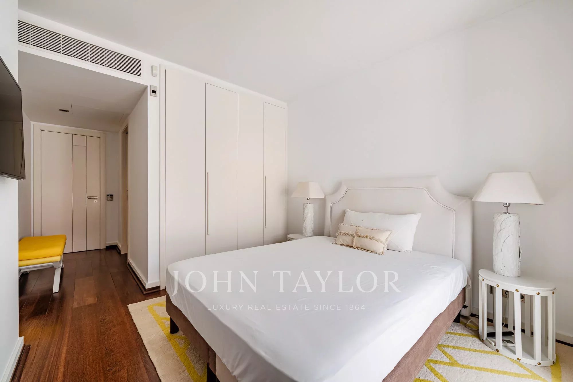 El ático se distribuye en dos plantas, con una clara separación entre zonas sociales y privadas. La planta de entrada está dedicada a las zonas privadas e incluye dos dormitorios. El primero cuenta con un vestidor y un cuarto de baño en suite, mientras que el segundo dispone de un cuarto de baño independiente. Este nivel también se beneficia de un segundo balcón.