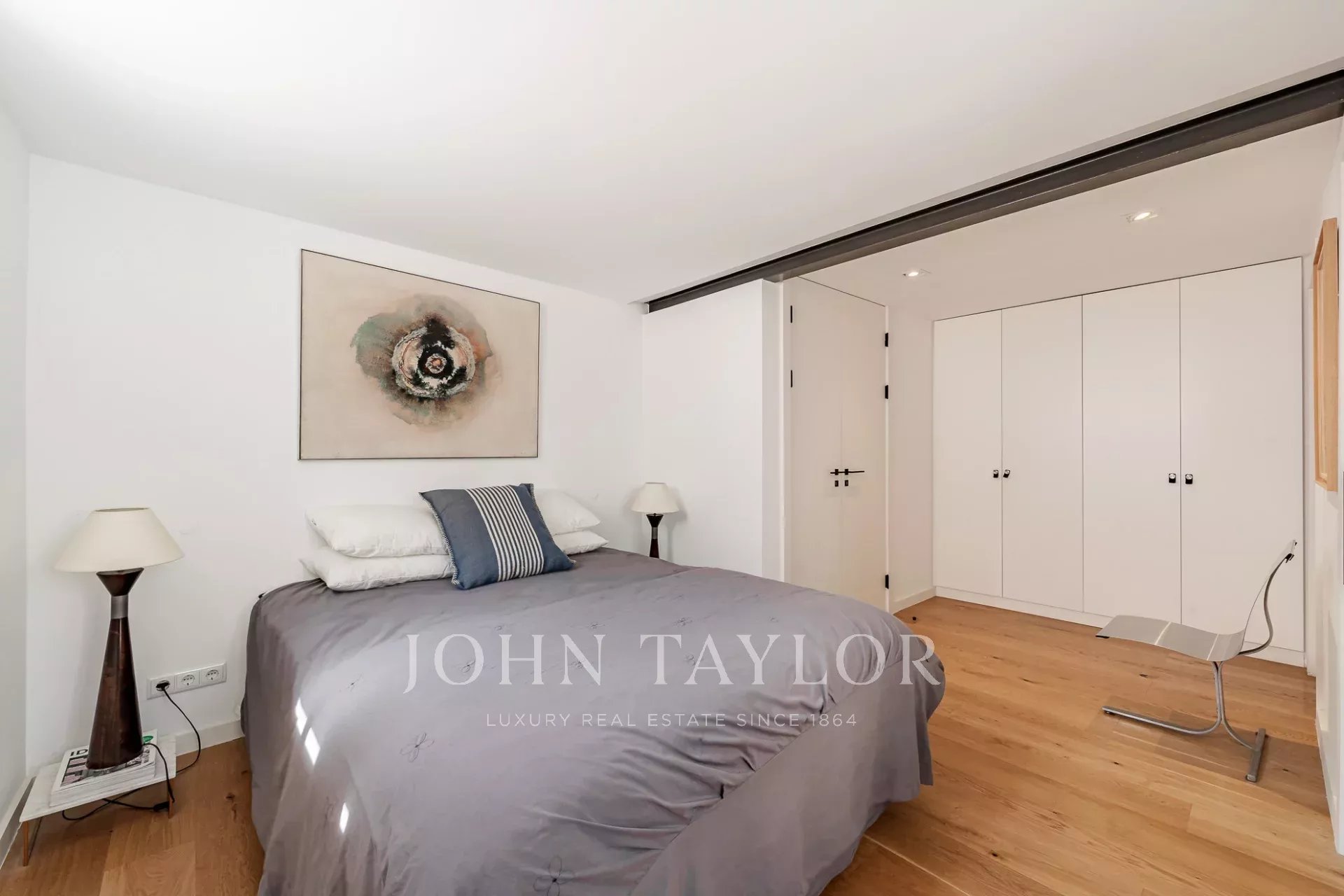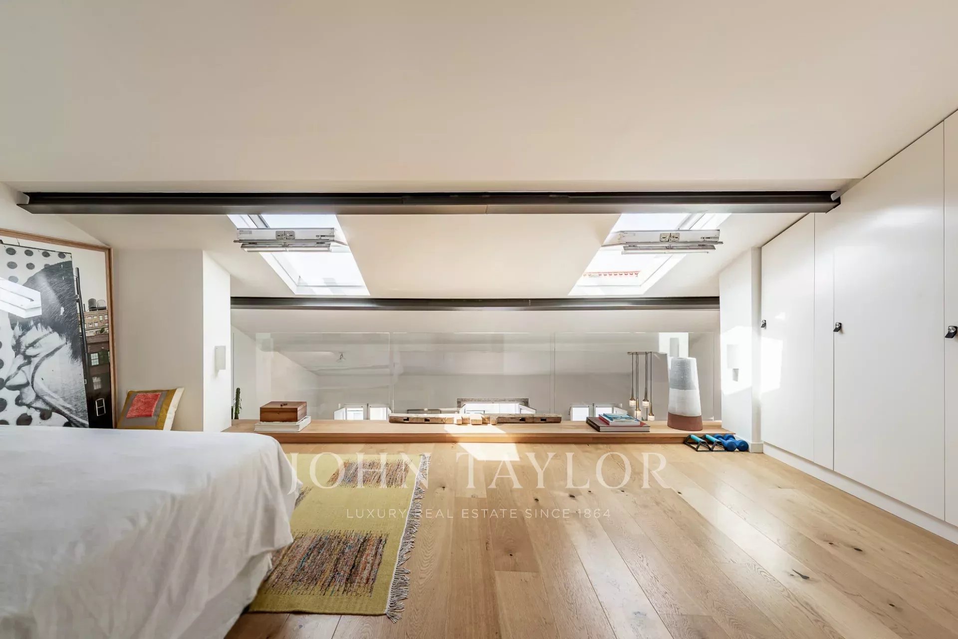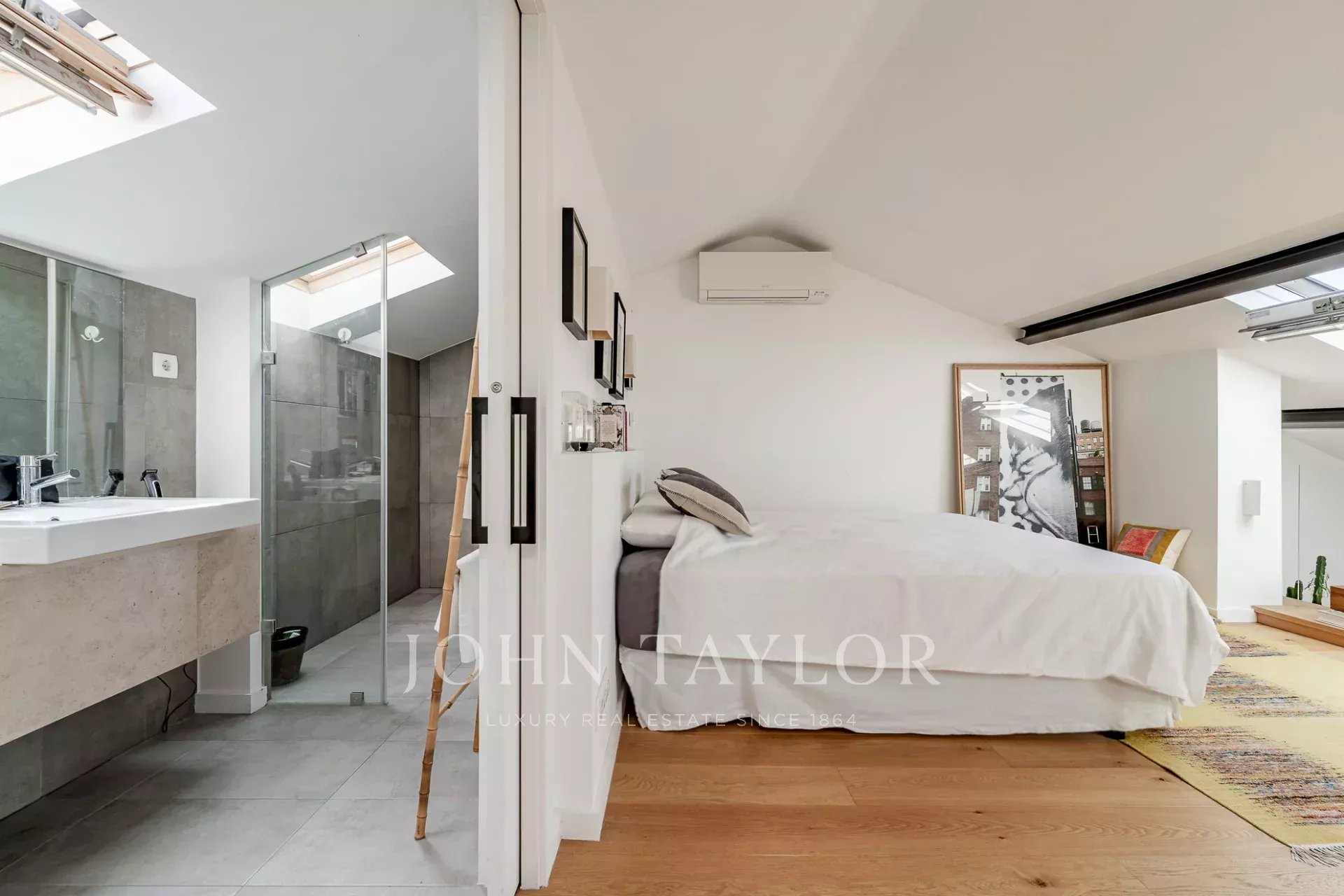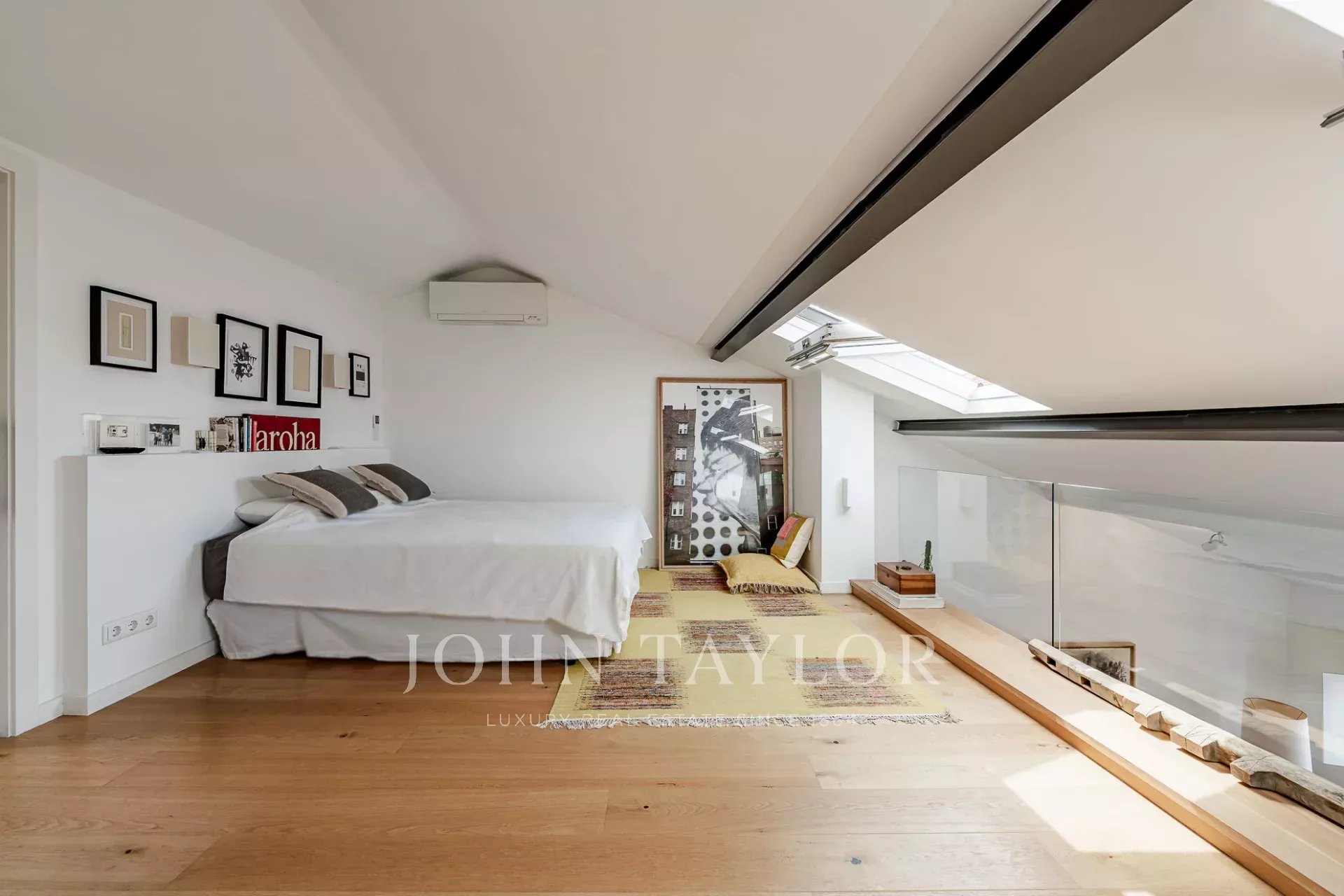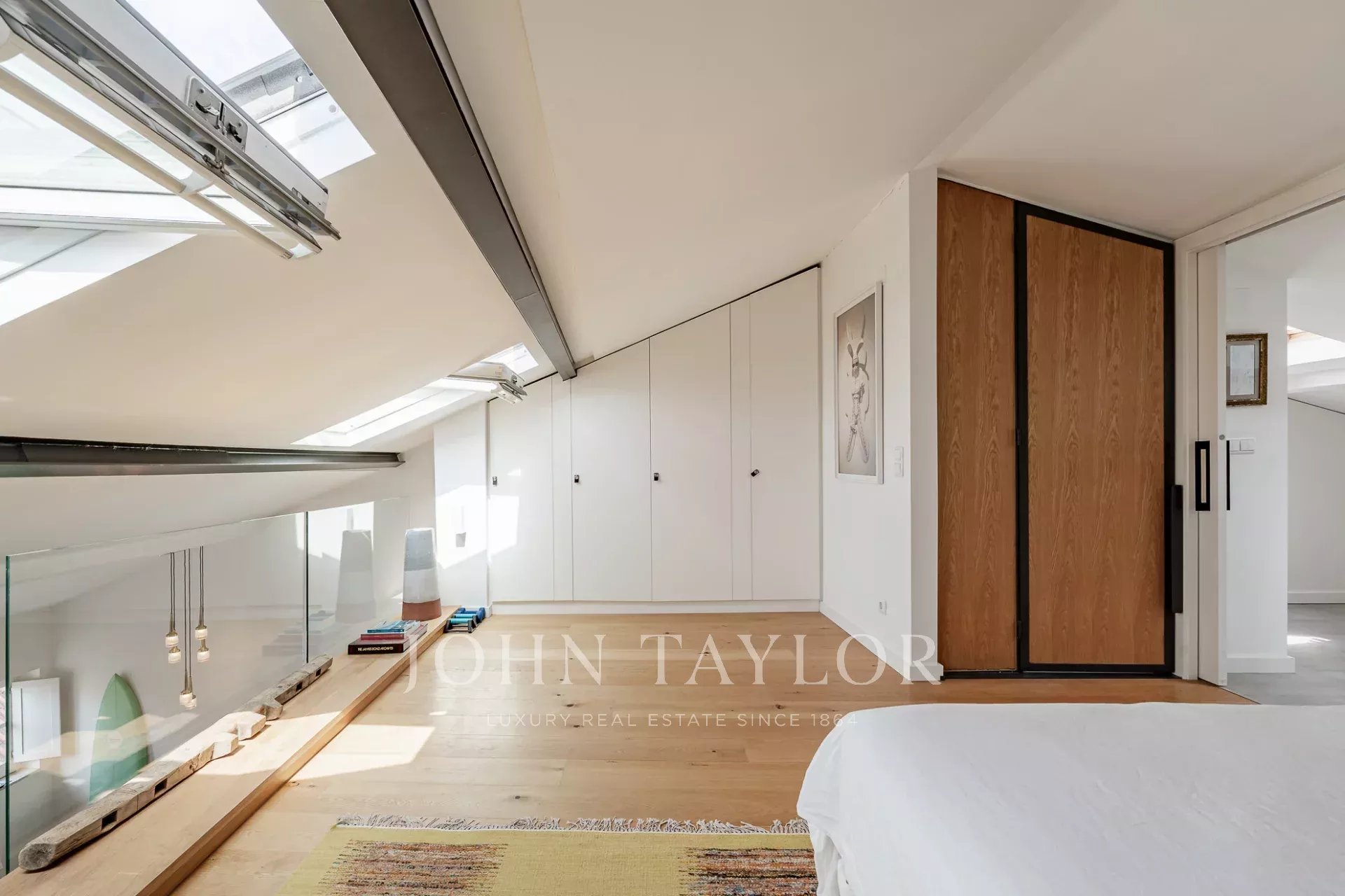 Arriba, la generosa suite principal se beneficia de una orientación sur, inundando el espacio con luz natural y ofreciendo espectaculares vistas sobre el río Tajo. Techos altos y grandes ventanales en todo el apartamento crean un ambiente luminoso y ventilado.