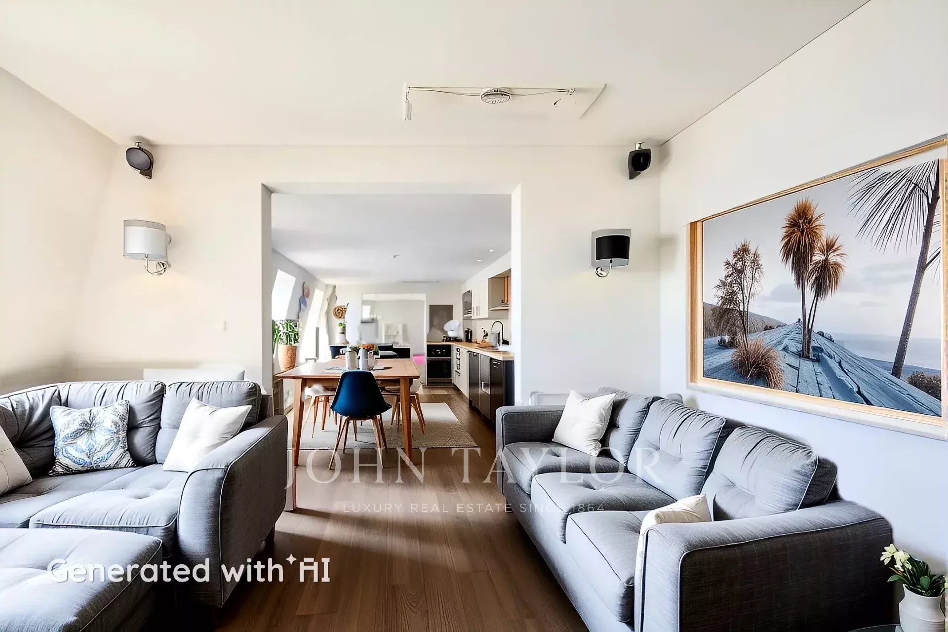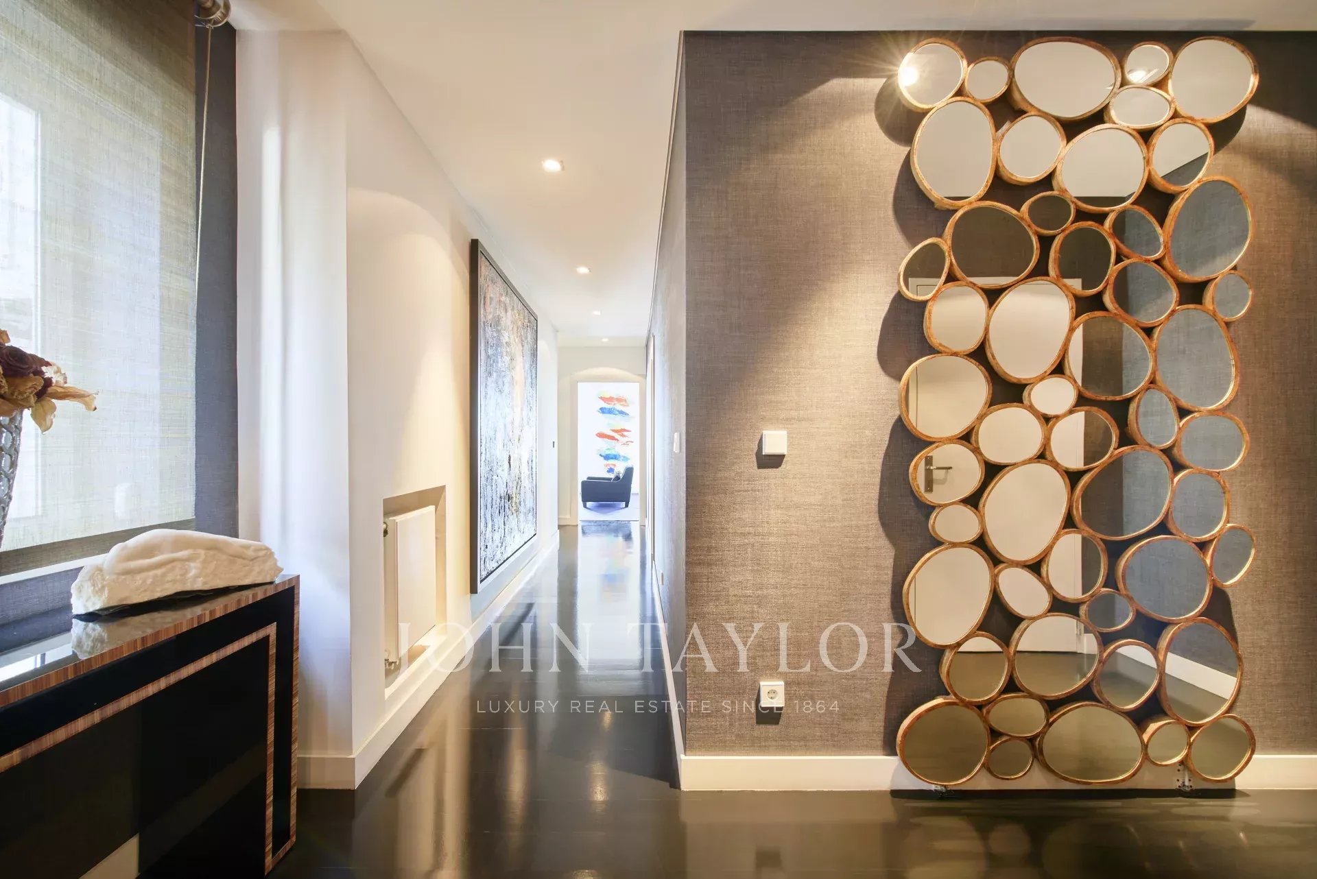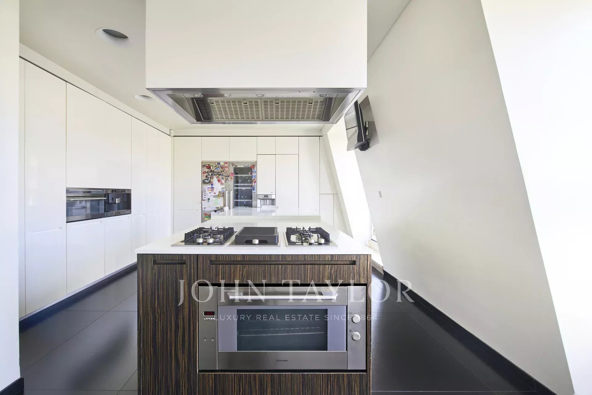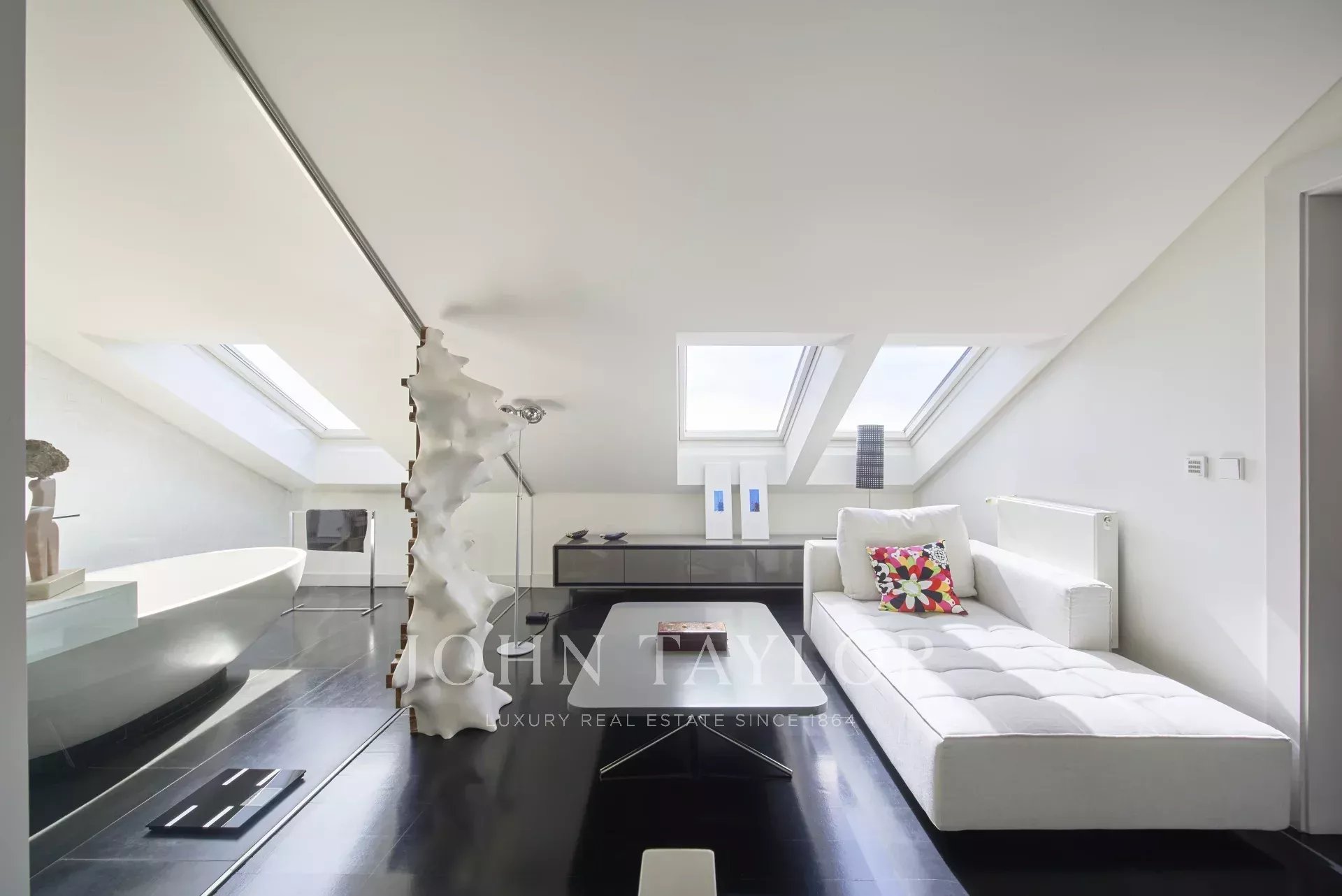 La zona privada incluye dos dormitorios en suite, uno de ellos una impresionante suite principal con baño acristalado, bañera de diseño bajo una claraboya y un amplio vestidor. Además, dispone de otros dos dormitorios adicionales que ofrecen gran versatilidad, uno de los cuales ha sido adaptado como gimnasio privado. La cocina se encuentra actualmente en construcción, lo que brinda al futuro propietario la oportunidad única de personalizarla a su gusto.