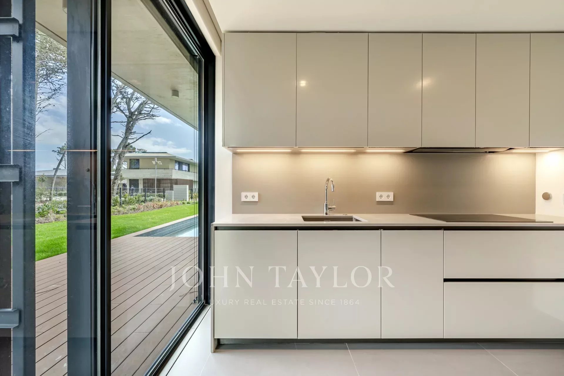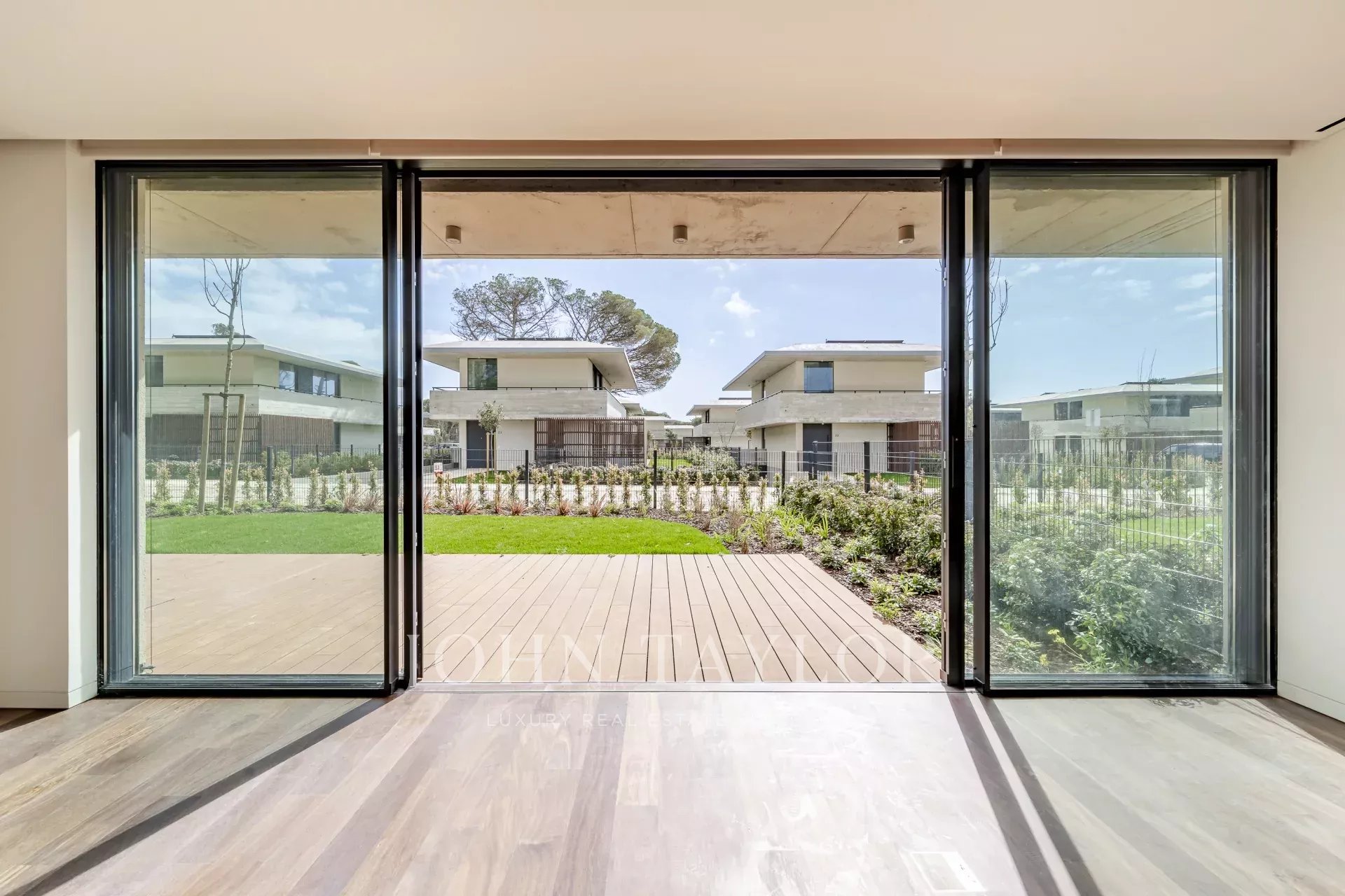 La planta baja alberga un amplio y luminoso salón-comedor de 48 m² con salida directa a la terraza y al jardín, lo que permite una conexión fluida entre interior y exterior. La cocina está completamente equipada, y en esta planta también se encuentra una zona de lavandería con acceso a un patio de servicio y un aseo de cortesía. La propiedad incluye tres plazas de aparcamiento privadas.