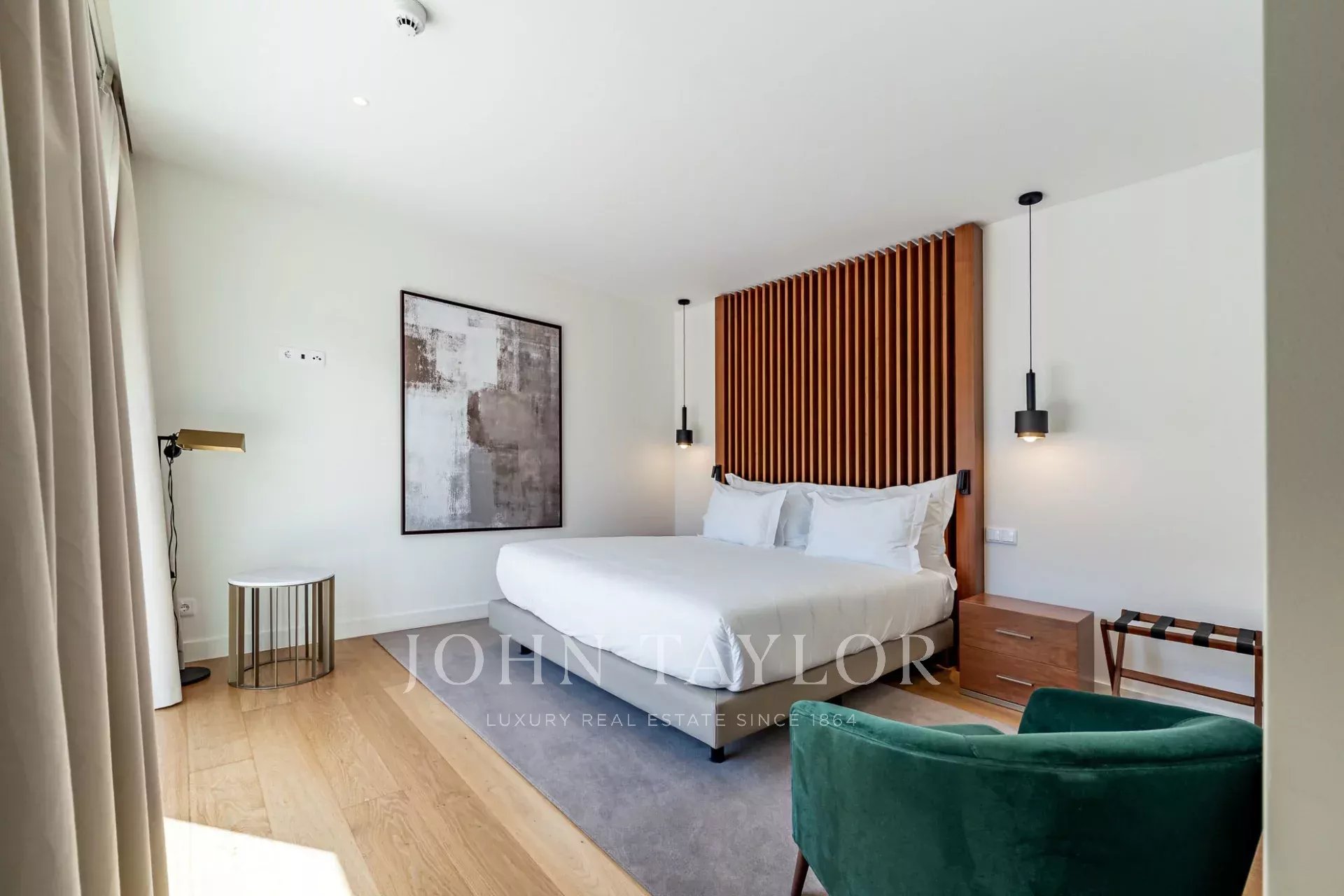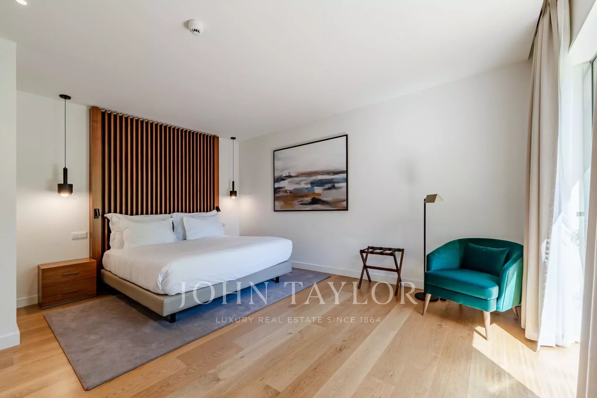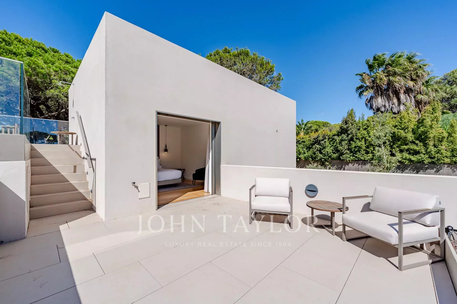 En la planta superior, la suite principal goza de un balcón privado y acceso directo a la terraza donde se encuentra la piscina.
