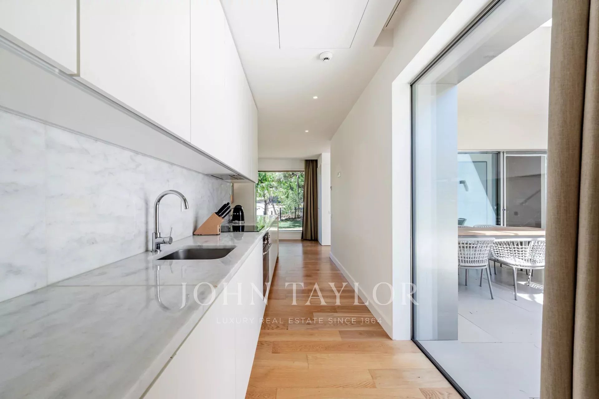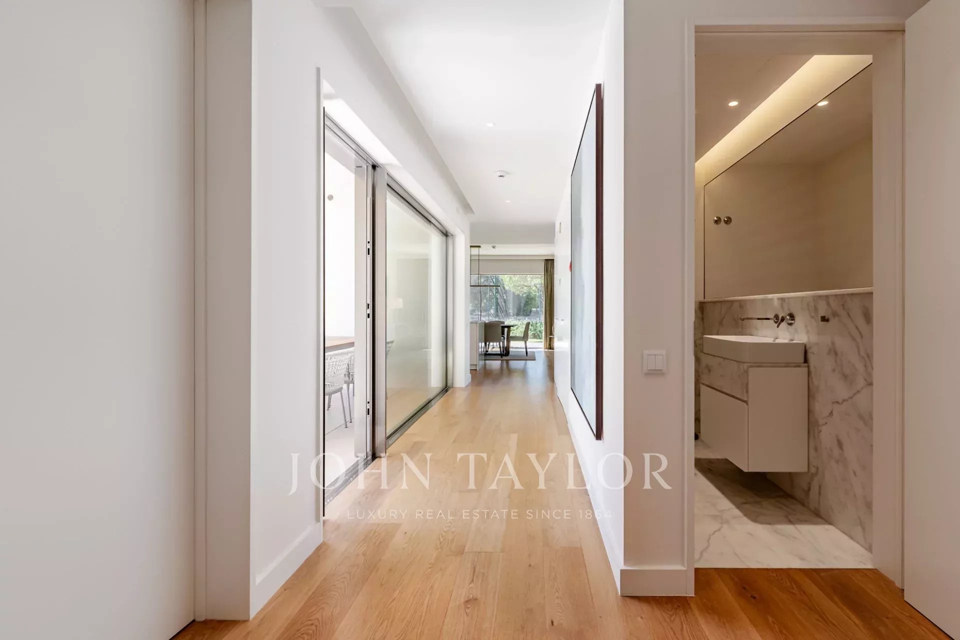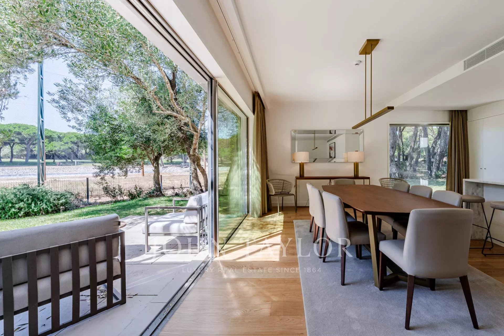 La planta baja cuenta con un amplio salón y comedor que se abre directamente al jardín a través de grandes puertas de cristal, creando un flujo perfecto entre la vida interior y exterior. Una cocina totalmente equipada, un baño de invitados y dos cómodos dormitorios en suite completan este nivel.