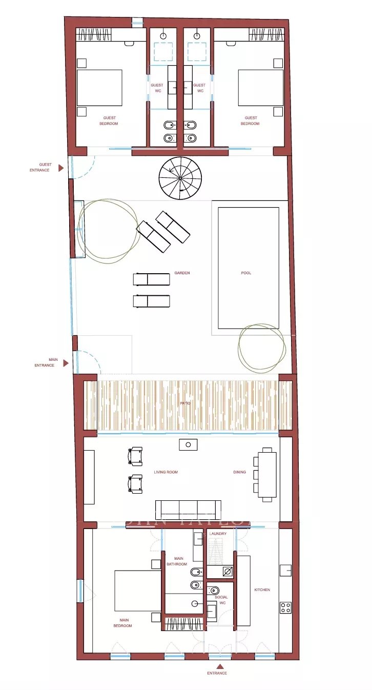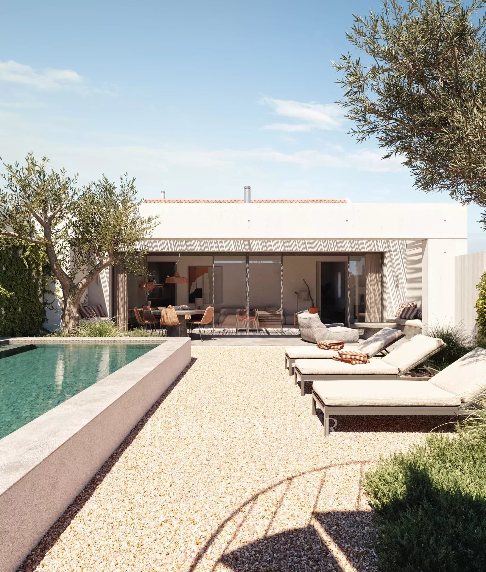 El diseño aprobado prevé una residencia contemporánea con tres dormitorios en suite, un amplio salón-comedor de planta abierta y una cocina independiente totalmente funcional. La distribución proporciona acceso directo al jardín y a la piscina, creando una conexión perfecta entre los espacios de vida interiores y exteriores.
