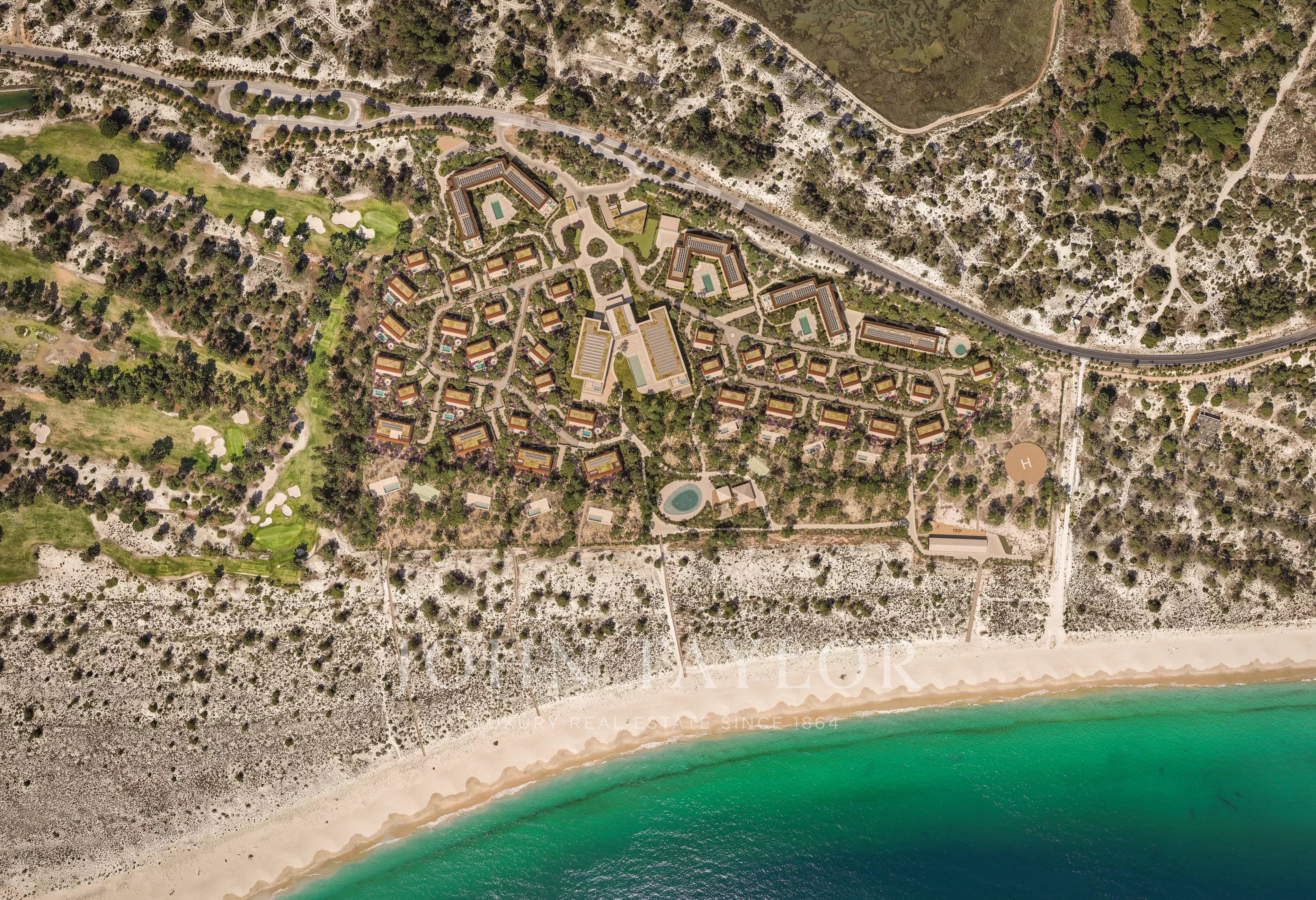 El complejo se encuentra actualmente en fase de desarrollo y contará con un lujoso hotel de 5 estrellas, 37 villas en primera línea de playa y 71 elegantes apartamentos, todos ellos diseñados con los más altos estándares. Las instalaciones incluyen recepción 24 horas, aparcamiento subterráneo, pistas de pádel y tenis, spa, piscinas de agua salada, club de playa, club infantil, gimnasio y helipuerto. También está a sólo 5 minutos del famoso Club de Golf Troia.