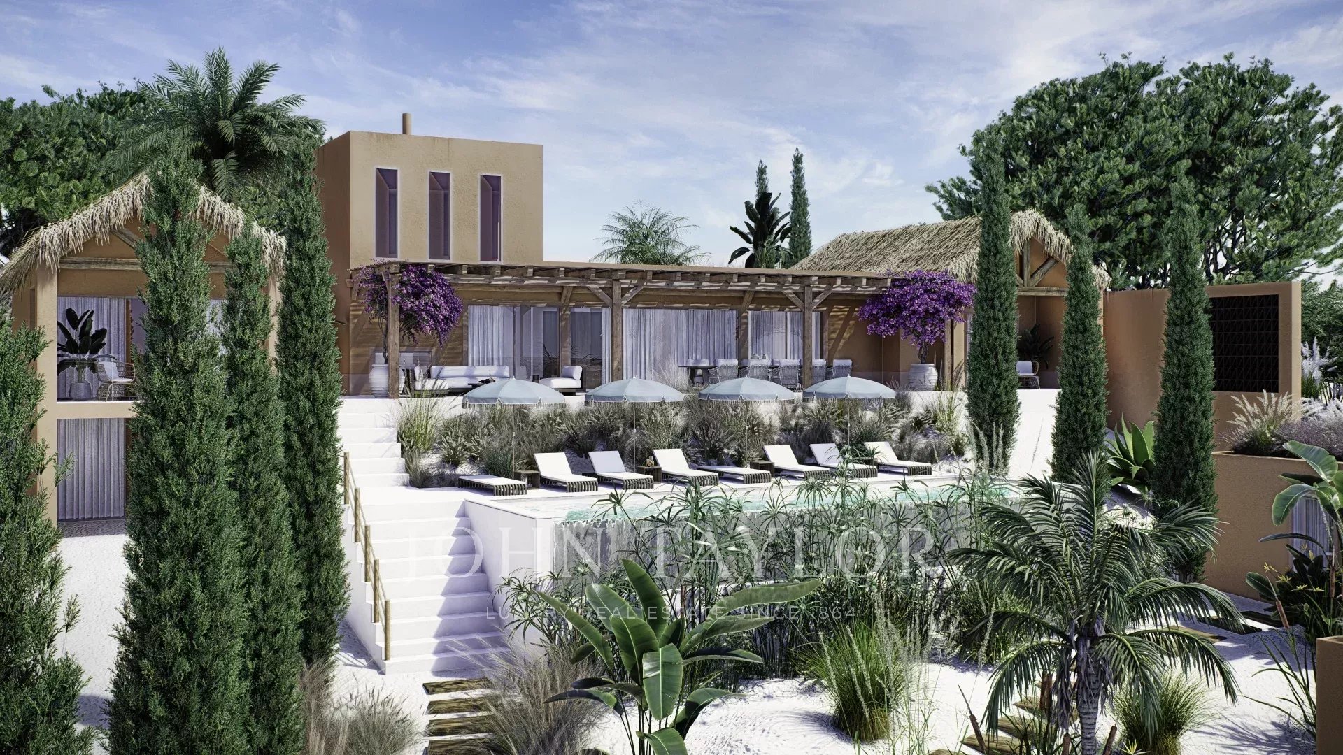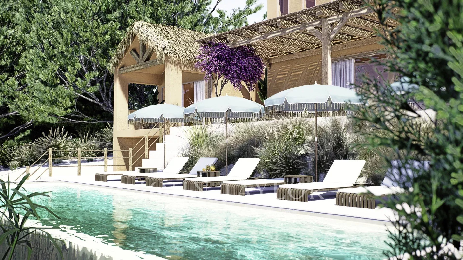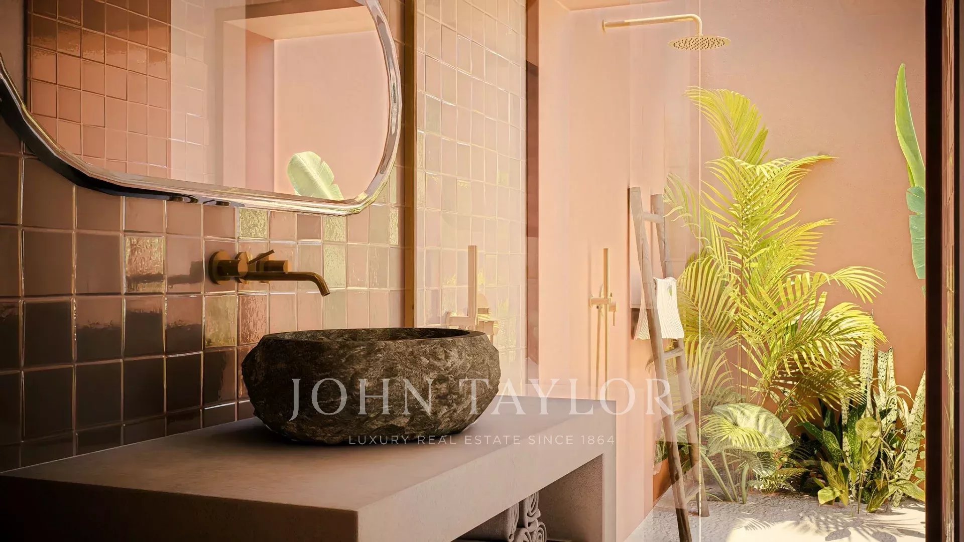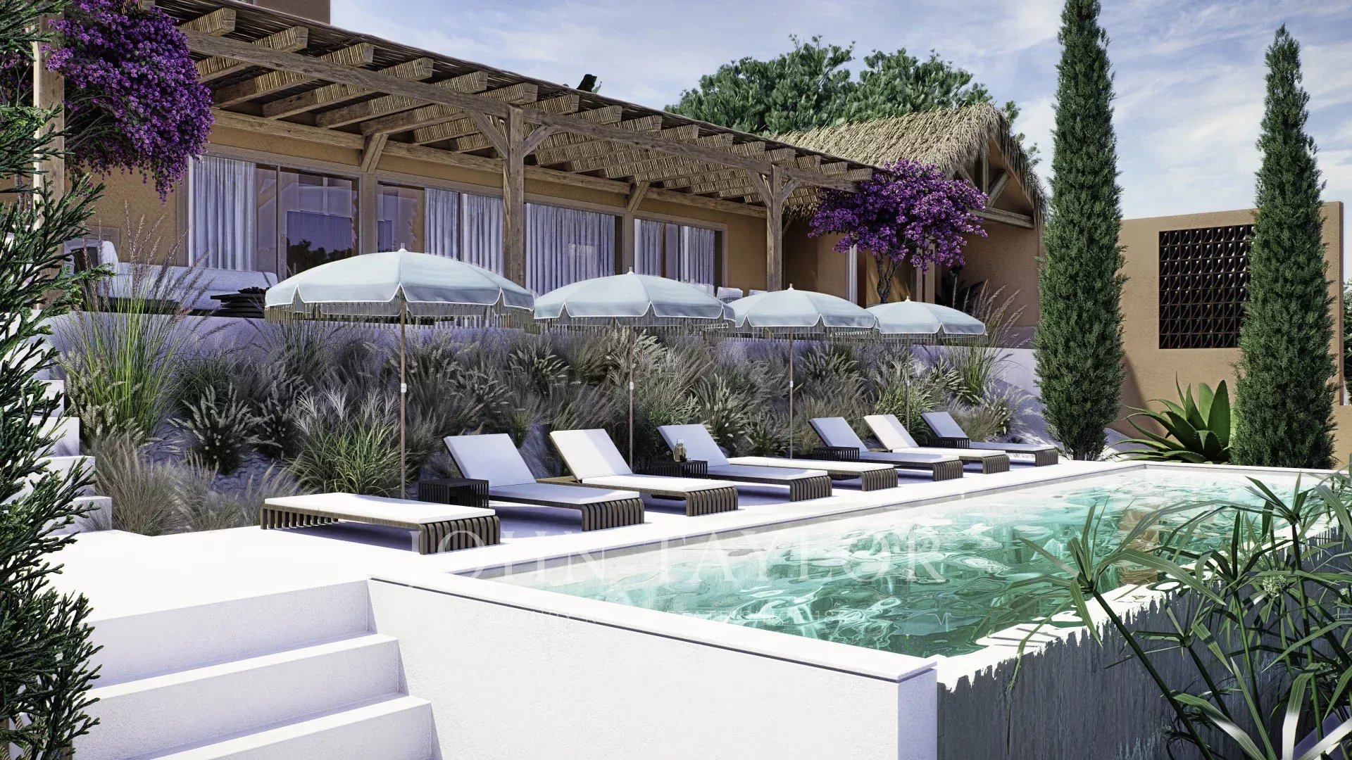 Diseñada con una arquitectura contemporánea, la propiedad consta de una vivienda principal y dos cabañas independientes para invitados. La vivienda principal dispone de tres suites, una cocina de concepto abierto con zona de comedor y salón, tres terrazas, azotea y gimnasio. Cada cabaña cuenta con una suite y una terraza privada. La propiedad se vende completamente amueblada e incluye además una bodega exterior.