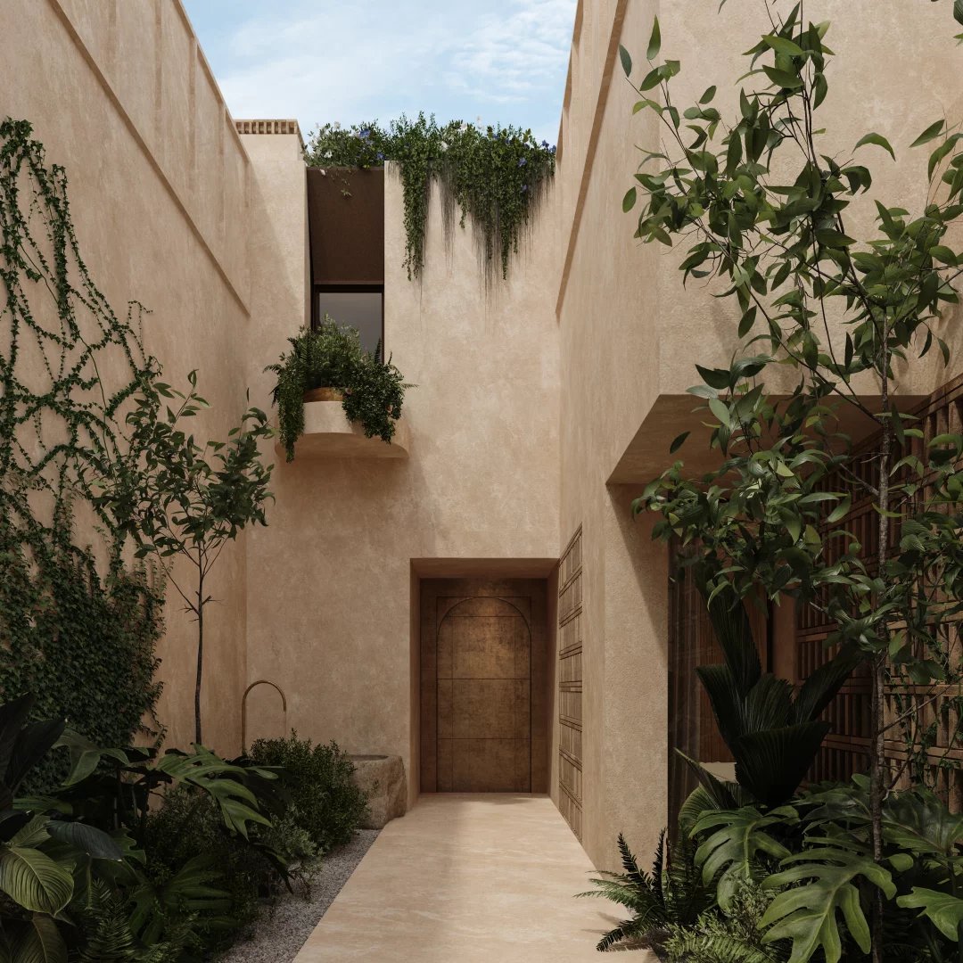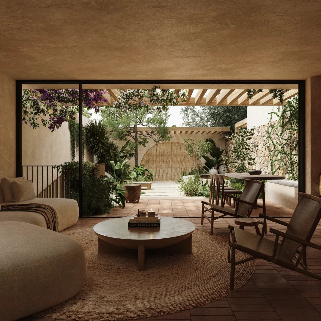 La arquitectura de la urbanización es discreta y refinada, diseñada para integrarse de forma natural en el paisaje circundante. Materiales naturales como la madera, la piedra y la arcilla se utilizan en todo el edificio, creando interiores cálidos y elegantes con una fuerte conexión con el exterior.