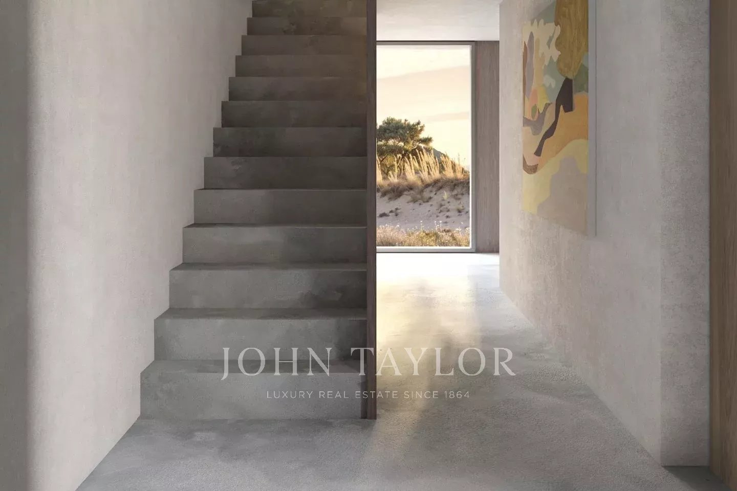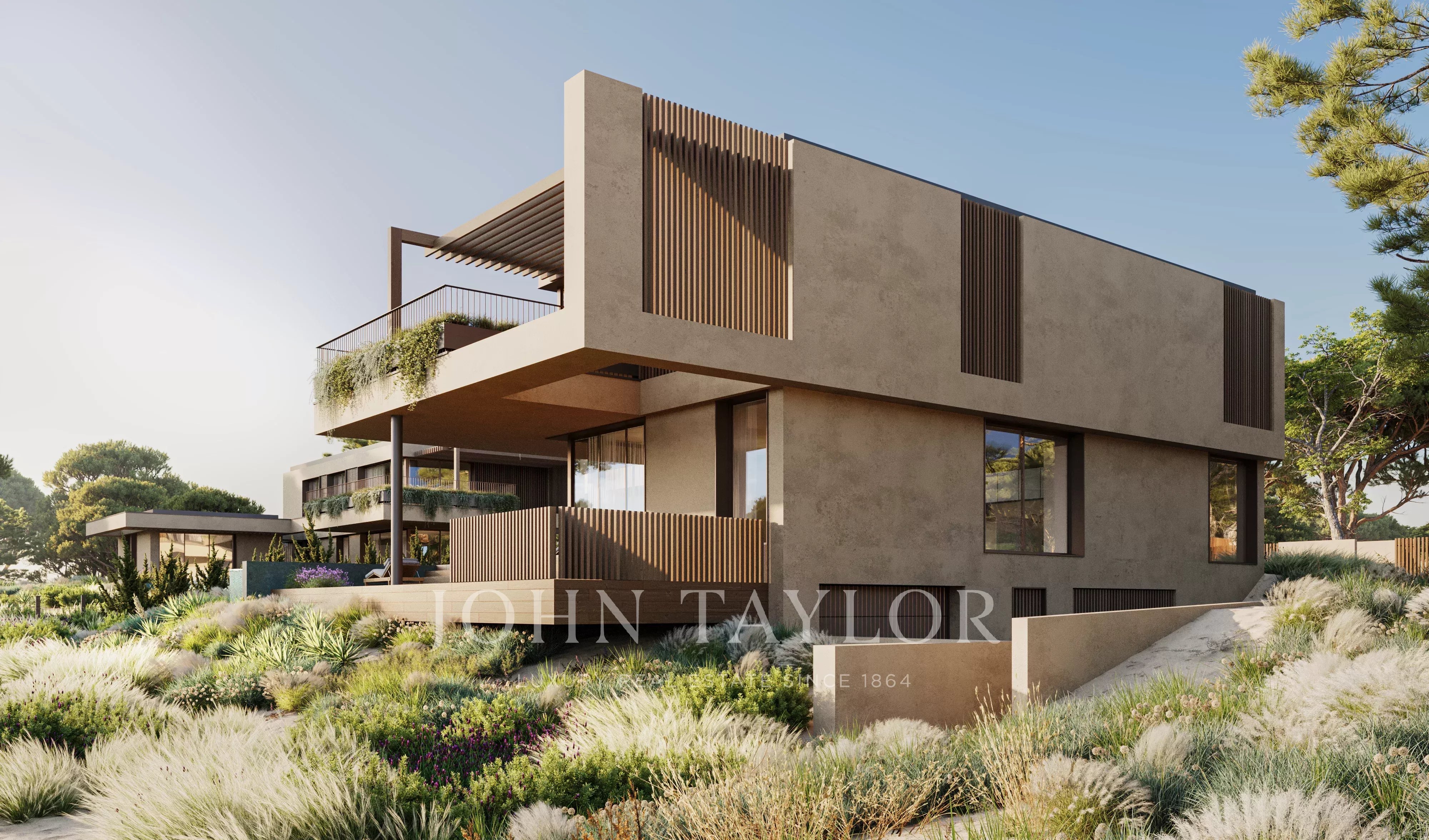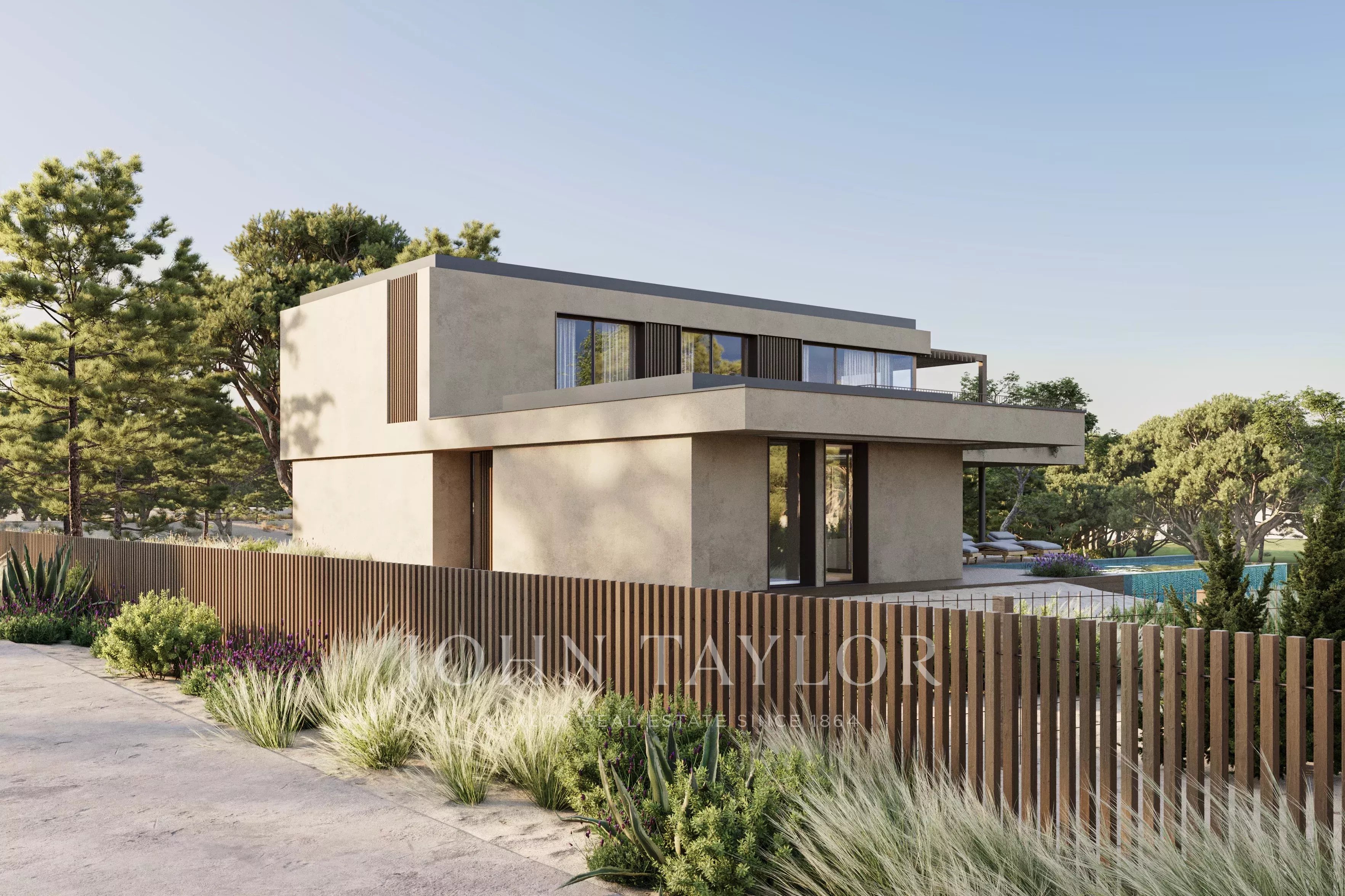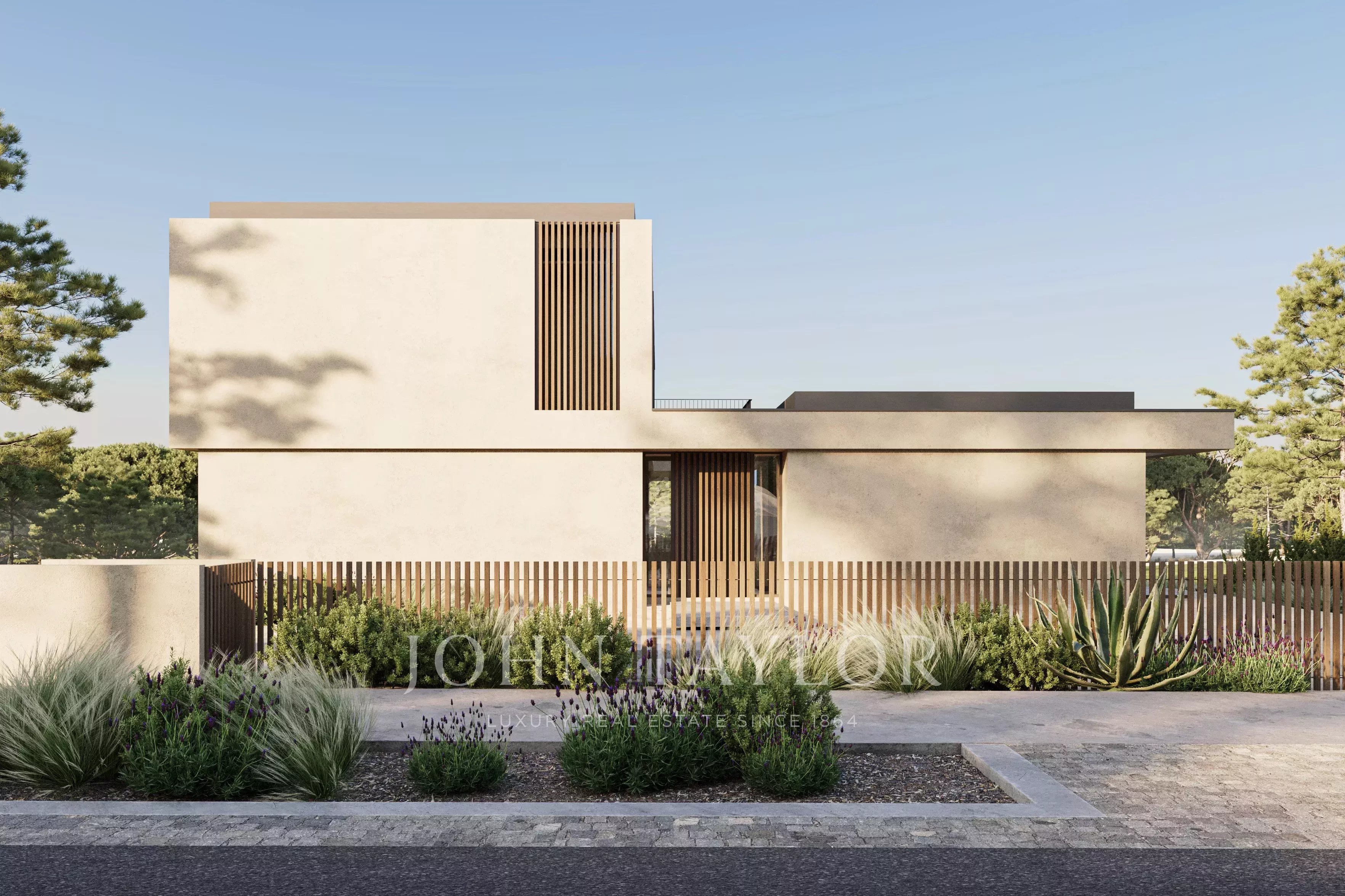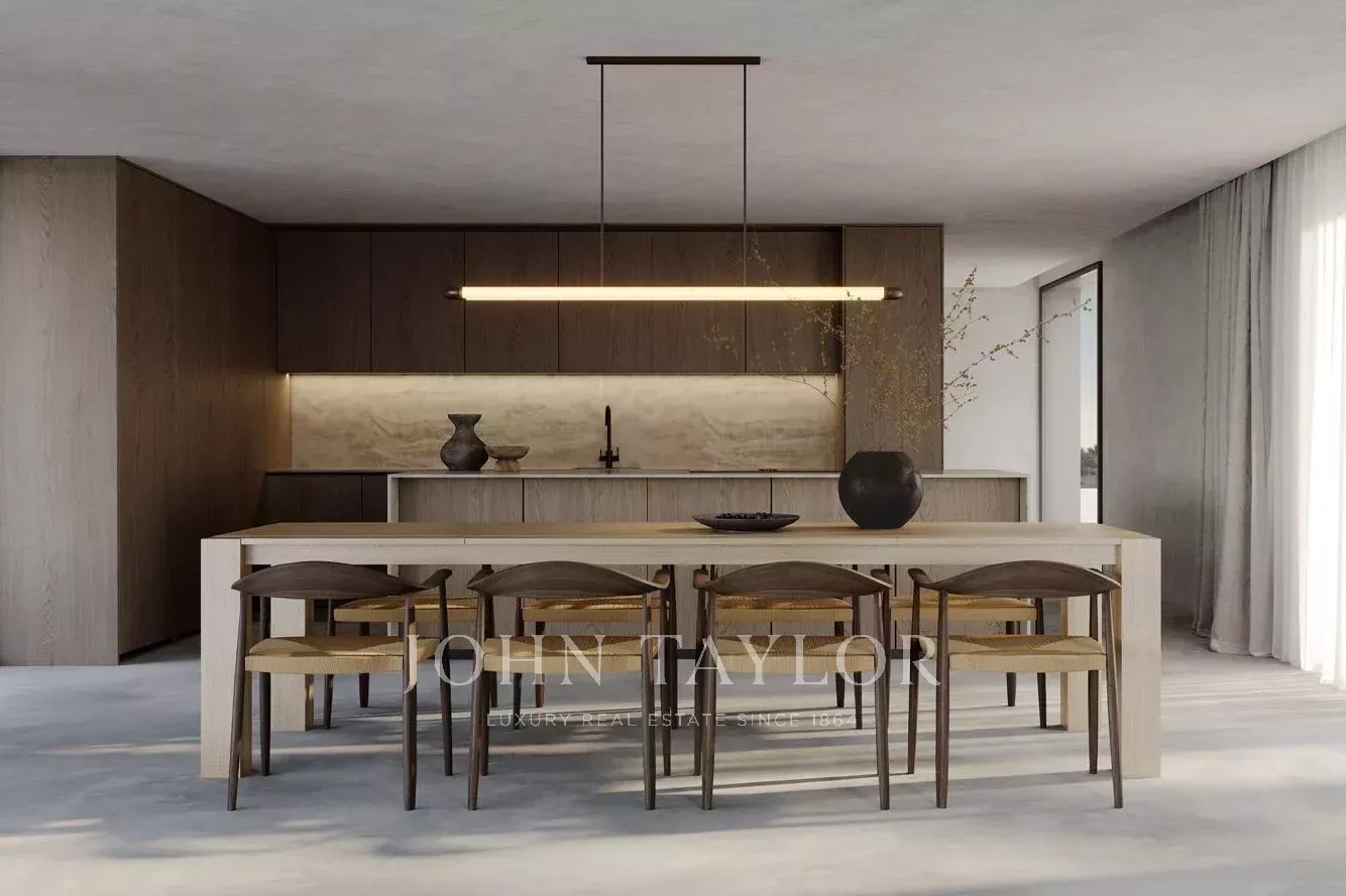 La arquitectura se define por volúmenes horizontales limpios, líneas minimalistas y grandes aberturas acristaladas que aumentan la transparencia y refuerzan la continuidad entre los espacios interiores y exteriores.