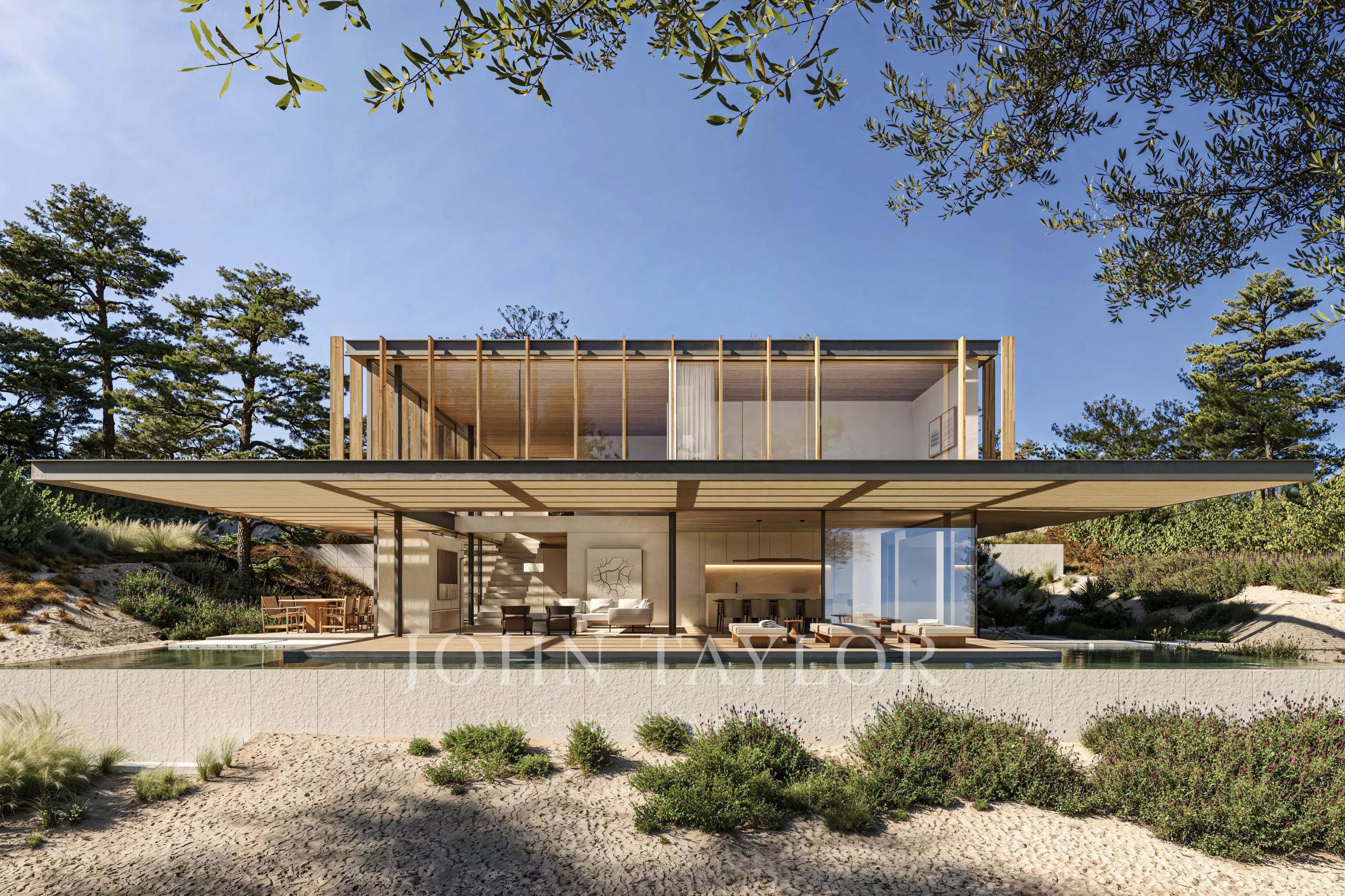 Situada en la prestigiosa urbanización Pinheirinho Comporta, esta villa de 5 dormitorios disfruta de una posición privilegiada en primera línea con vistas al campo de golf y al paisaje natural circundante. Diseñado por el internacionalmente reconocido Jacobsen Arquitetura, el proyecto fue concebido para integrarse discretamente en el terreno, revelando sólo una sola planta desde el acceso principal y desplegándose hacia las vistas en la parte trasera de la parcela.
