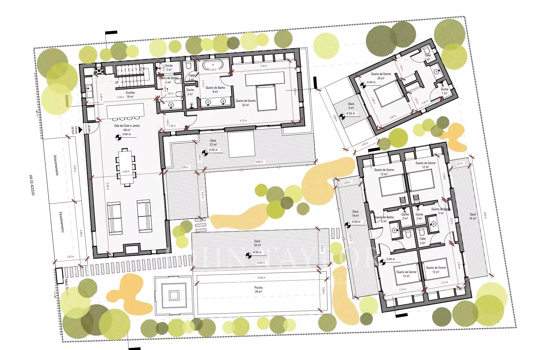 Se trata de una parcela exclusiva de 801 m2, en un condominio cerrado, insertado en Herdade da Comporta, en una de las mejores zonas de Comporta, Brejo da Carregueira de Baixo, con un proyecto pre-aprobado para 3 cabañas con áreas de construcción cubiertas de 250 m2, 2 suites, 4 dormitorios, sala de estar / comedor, cocina abierta, piscina independiente trastero y pozo de fuego.