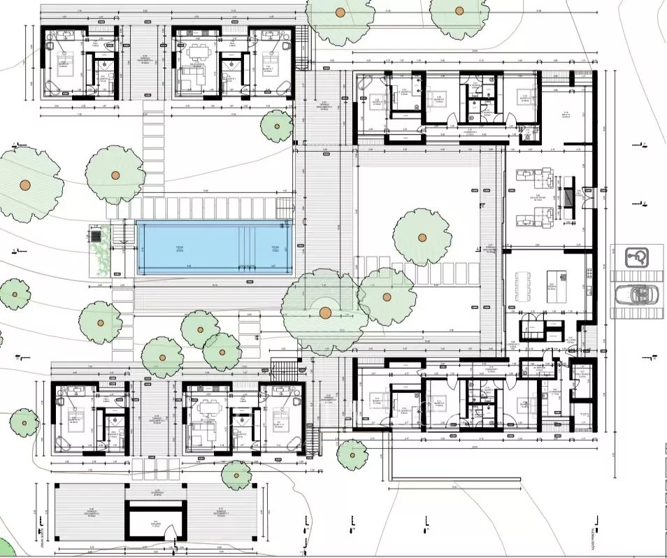 El diseño arquitectónico es moderno y discreto, pensado para integrarse de forma armoniosa en el entorno natural. La casa principal tendrá 500 m² e incluirá seis dormitorios en suite, amplias zonas de estar y comedor con vistas despejadas, una cocina totalmente equipada y una sala de cine privada.