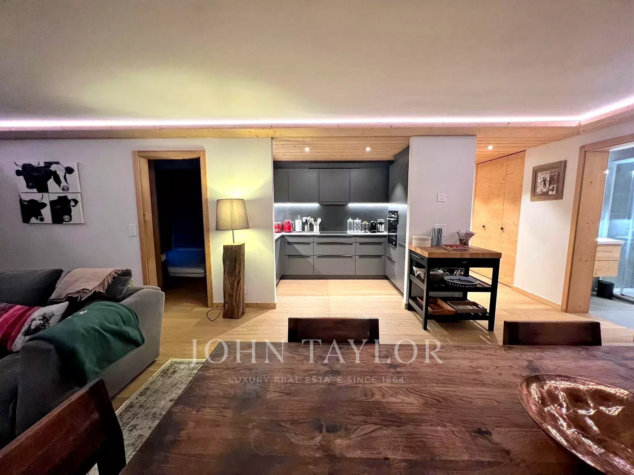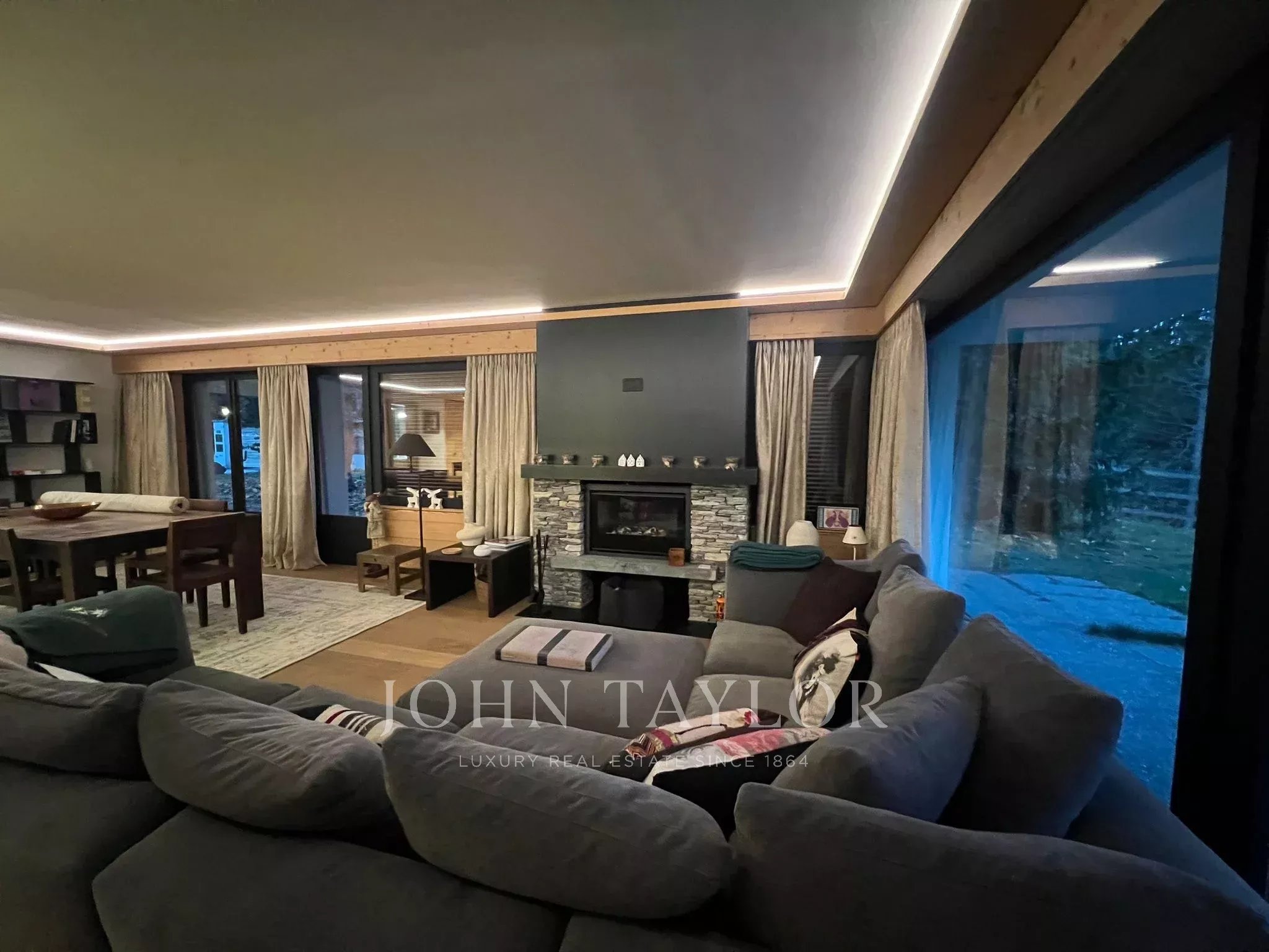 Diseñado con materiales nobles, madera natural y líneas arquitectónicas limpias, el apartamento ofrece una armoniosa combinación de diseño moderno y autenticidad alpina. La amplia zona de salón y comedor de concepto abierto está realzada por una chimenea, creando un ambiente acogedor para las noches de invierno, mientras que las grandes ventanas permiten la entrada de abundante luz natural y conectan el interior con el entorno exterior.