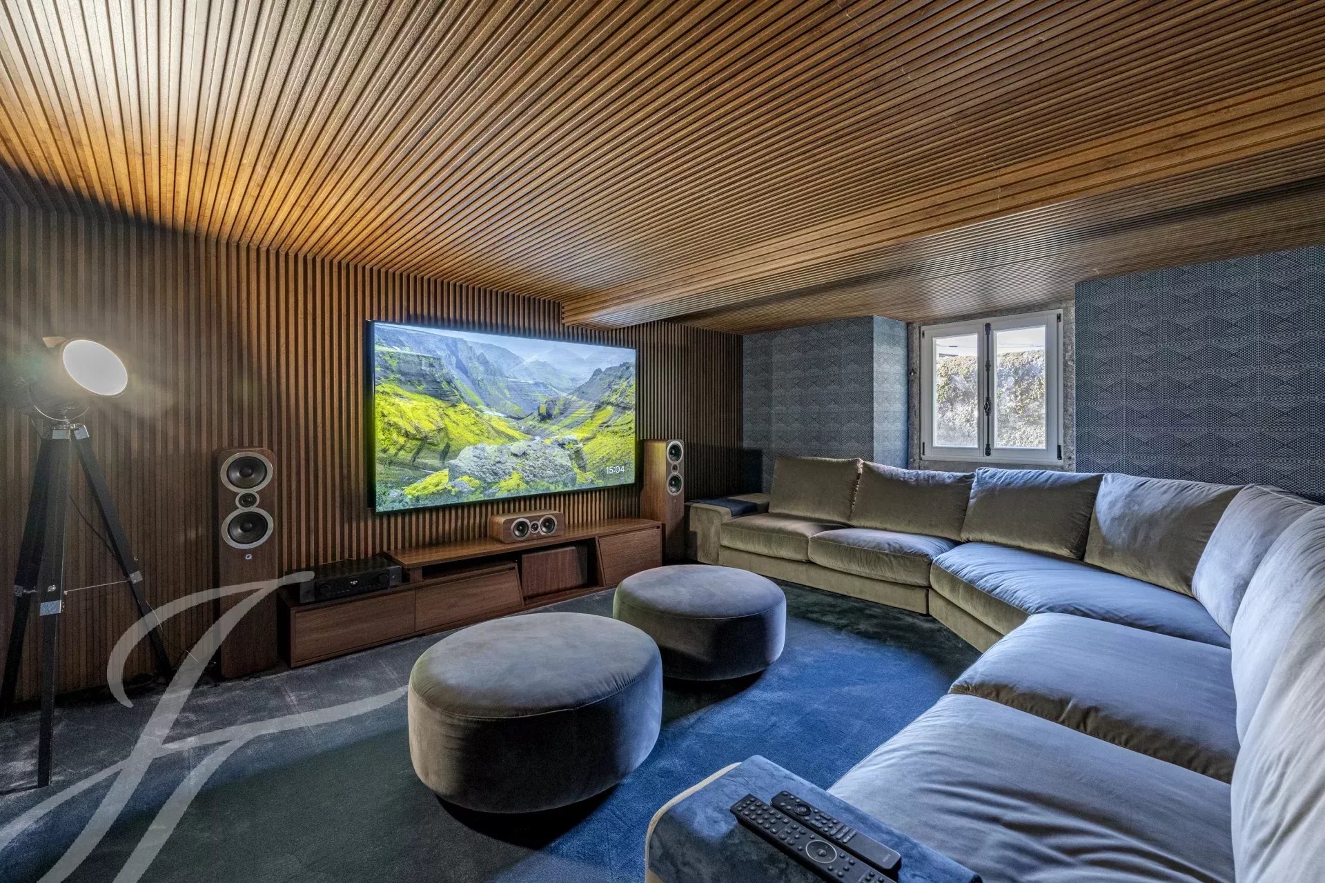 La planta inferior está dedicada al ocio, con una sala de televisión insonorizada, una bodega, sauna, lavandería y un dormitorio adicional.