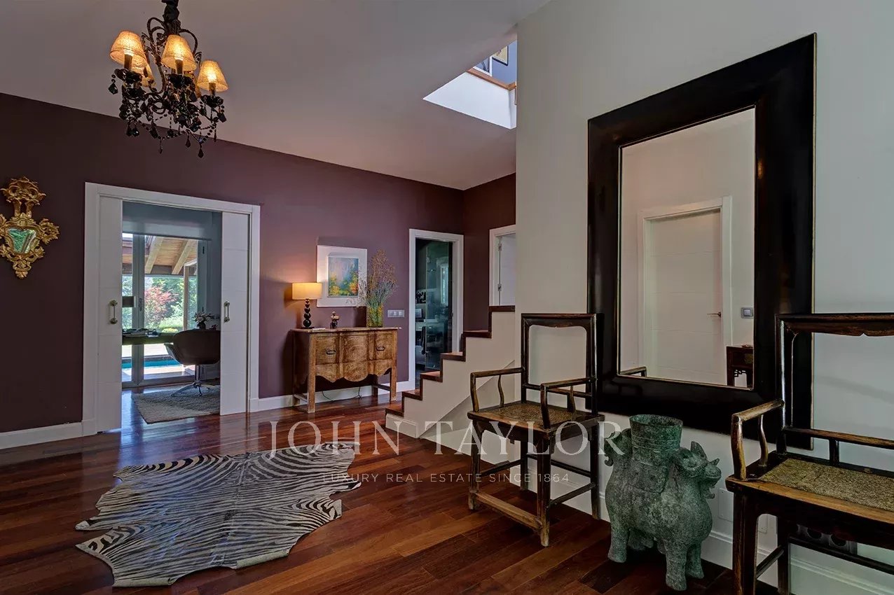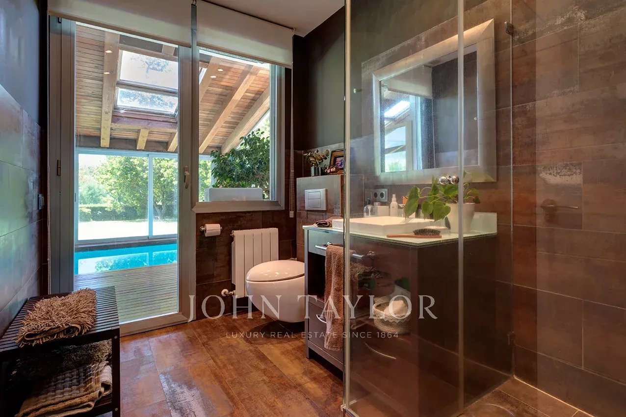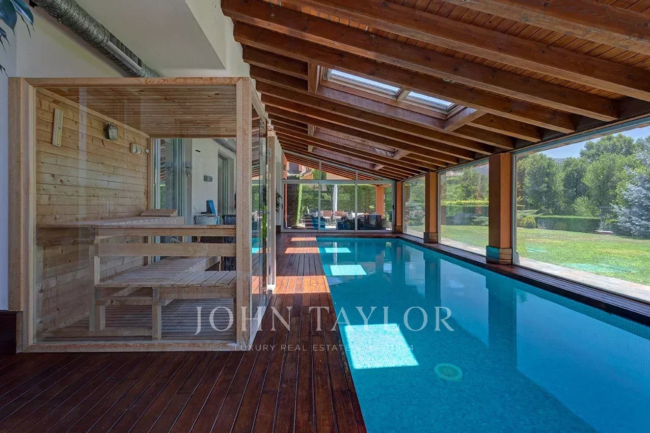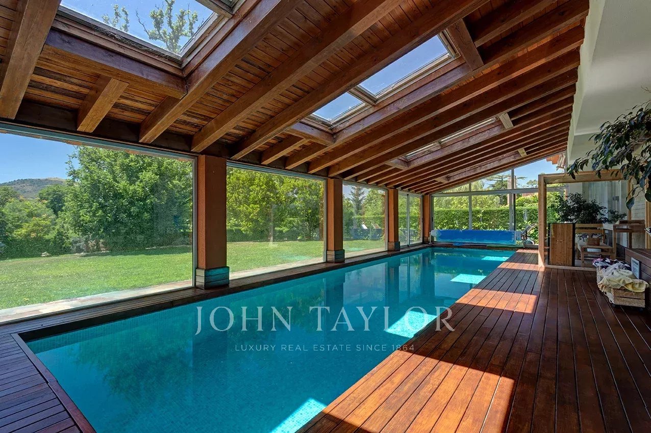 Distribuido en tres cómodas plantas, la planta principal consta de un gran y luminoso salón con chimenea y amplios ventanales con salida al jardín y a la magnifica piscina cubierta y acristalada, calefactada, con sistema de deshumidificación, la cual, en verano puede quedar semi exterior al poderse abrir todo el cerramiento acristalado.