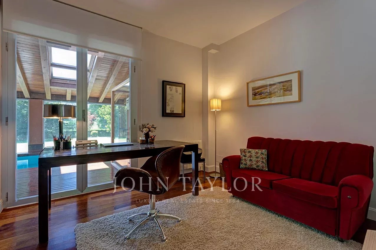 En este misma planta tenemos la luminosa cocina con zona de office, un despacho, un baño completo, que también conecta con la piscina y la sauna, y un estupendo, amplio y cómodo dormitorio principal con un gran vestidor y baño en suite.